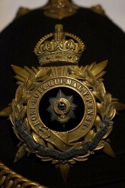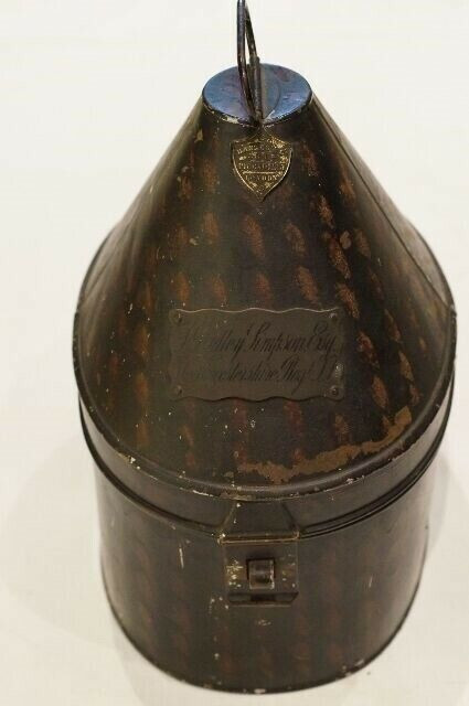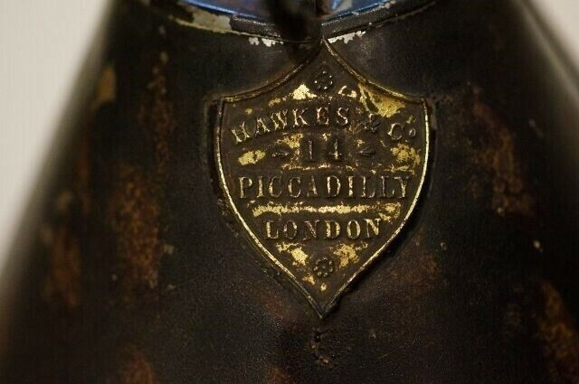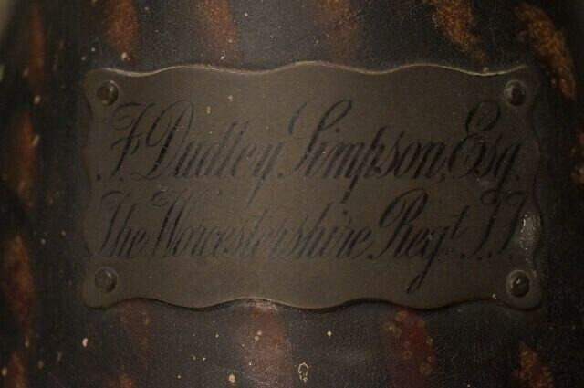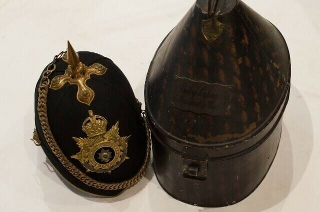 This is a good condition Pre WW1 British Officers Home Service Helmet to the Worcestershire Regiment in the Named Tin. Named to F Dudley Simpson on the japaned case. Tin is maker marked Hawkes and co Piccadilly and the helmet is also maker marked to the same. The inside of the helmet is perfect with no extra holes. Sweatband and silk liner are also perfect. Nametag inside has the same name on it and unit. Approx size is 7 1/8. Beautifull dark blue cloth helmet that can not be upgraded. Multipiece construction helmet plate. I ship all over the world. GST of 5% is applicable on all sales within Canada.