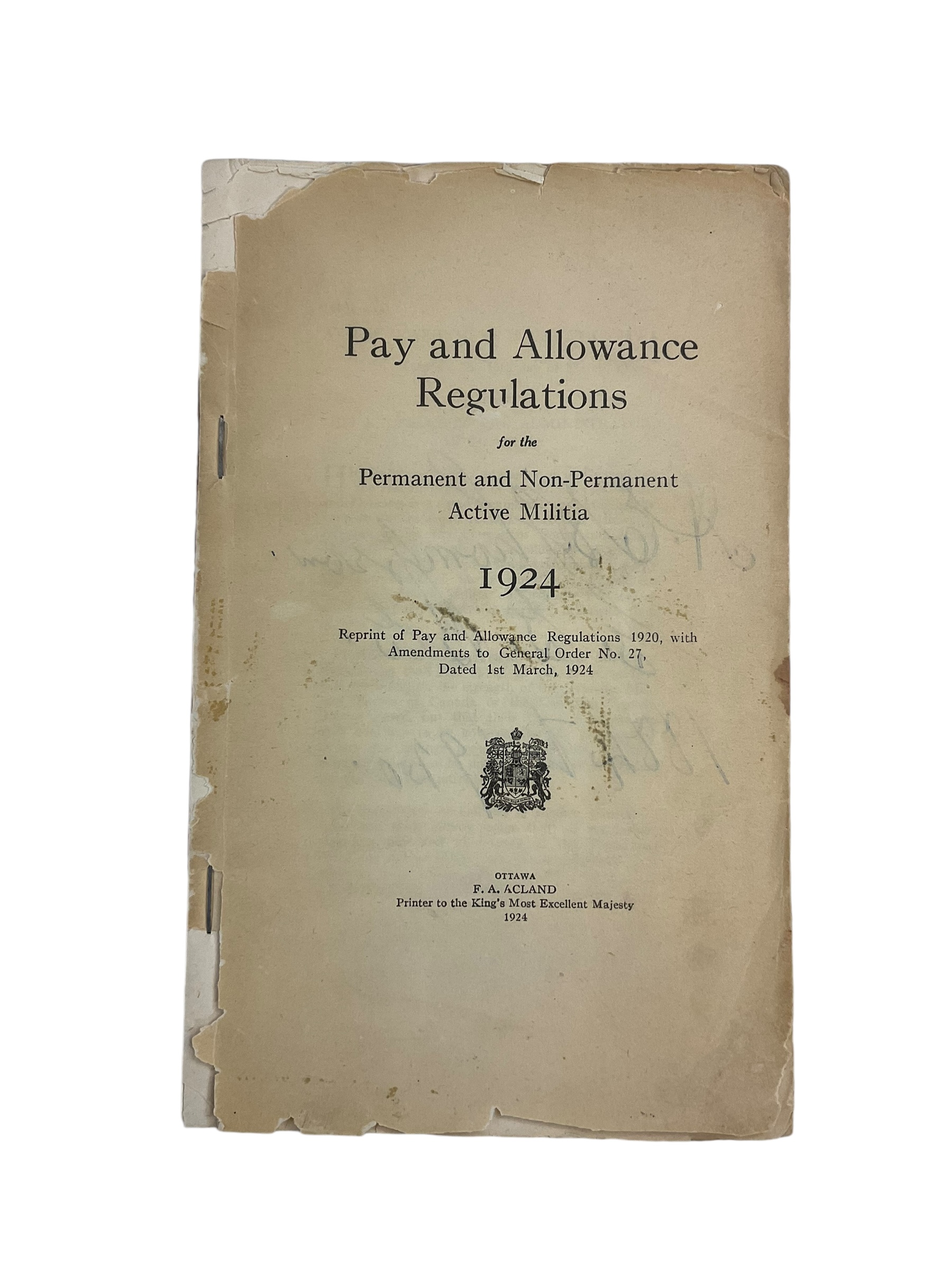 Pre WW2 Canadian Pay & Allowance Regs For The Militia 1924 Reference Book