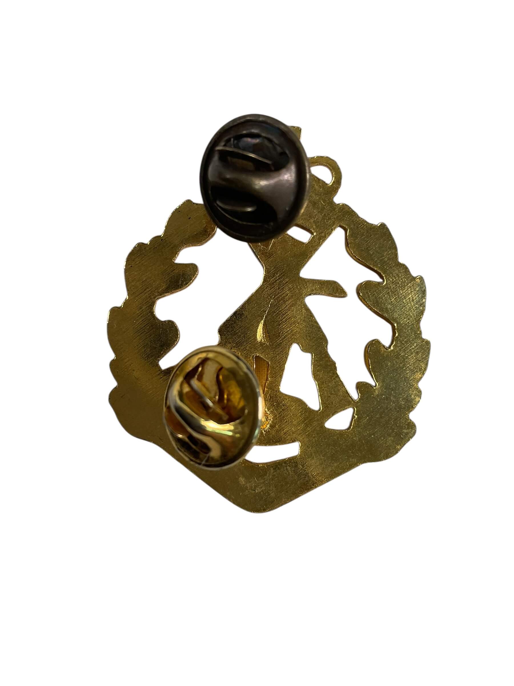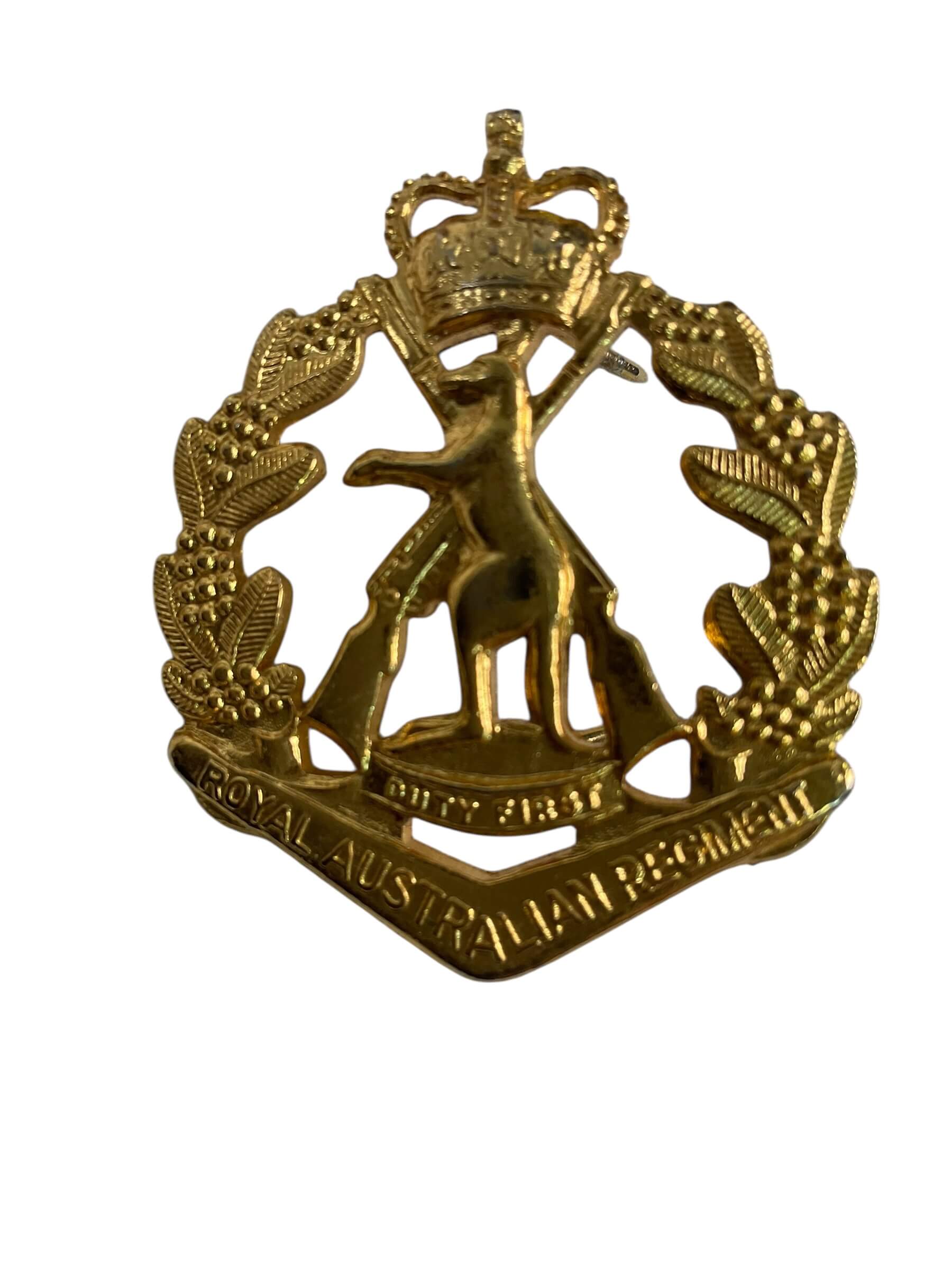 The Royal Australian Regiment Cap Badge is an insignia worn by members of the Royal Australian Regiment, the principal regular infantry regiment of the Australian Army. The badge prominently features the regiment’s emblem, which typically includes the “Rising Sun” motif surmounting a kangaroo, signifying the regiment’s Australian identity. This cap badge is manufactured from metal and usually finished in brass or a darkened material, depending on the period and issue. It is affixed to the headdress of serving personnel, signifying their affiliation with the Royal Australian Regiment. The design and exact construction may vary slightly based on era and manufacturer, as the regiment has used several variations since its establishment in 1949. Cap badges such as this have served practical purposes in unit identification and ceremonial functions within Australian military dress regulations. This item is of interest to collectors of military insignia or those studying the history of Australian armed forces.