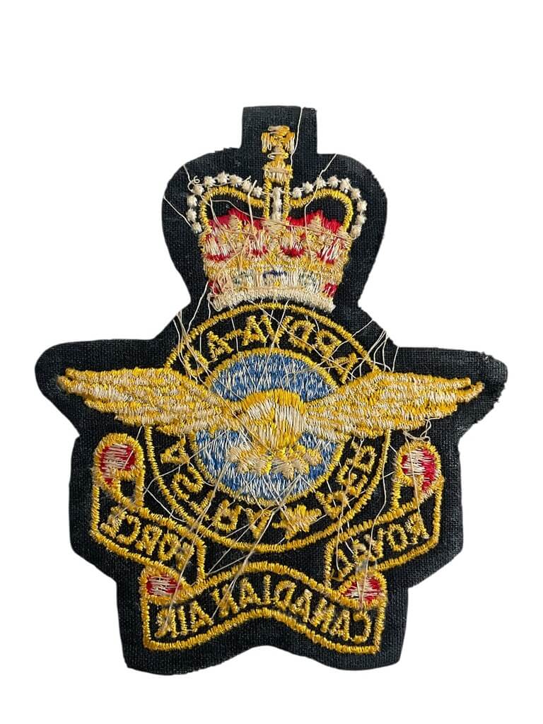 This Royal Canadian Air Force (RCAF) cotton blazer crest is an authentic piece of military insignia typically worn on the pocket of a dress blazer. The crest features the iconic RCAF insignia, incorporating elements such as the royal crown, a pair of stylized wings, and the initials “RCAF” within a central scroll or banner. Embroidered in high-quality cotton thread, the badge is designed to represent the heritage and identity of the Royal Canadian Air Force. Blazer crests like this were used by officers and select personnel for ceremonial or formal events, distinguishing affiliation with the RCAF. The cotton construction allows for detailed embroidery while providing durability. This item is of interest to collectors of Commonwealth Air Force memorabilia, military uniform historians, and those studying military insignia. Its design and craftsmanship reflect the standards upheld by Canadian military tailoring during the period in which it was produced.