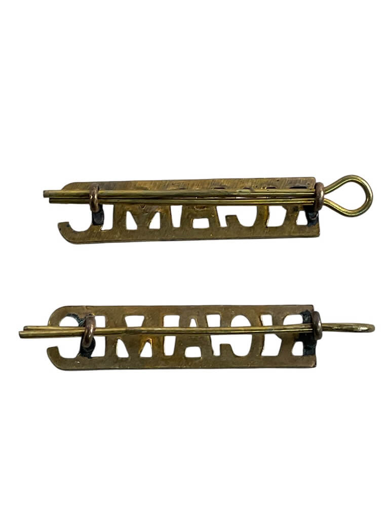The Royal Canadian Army Medical Corps (RCAMC) Shoulder Titles Insignia Pair consists of two matching shoulder titles designed for wear on the uniform of RCAMC personnel. These insignia were used to identify members of the medical branch within the Canadian Army. Typically manufactured from brass or a similar metal, each title is shaped as a curved bar featuring the raised lettering “R.C.A.M.C.,” den