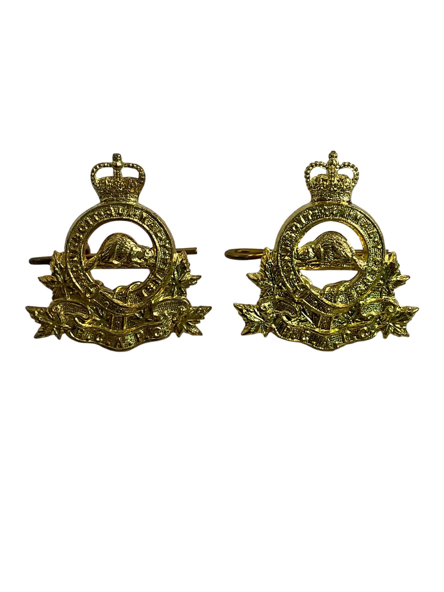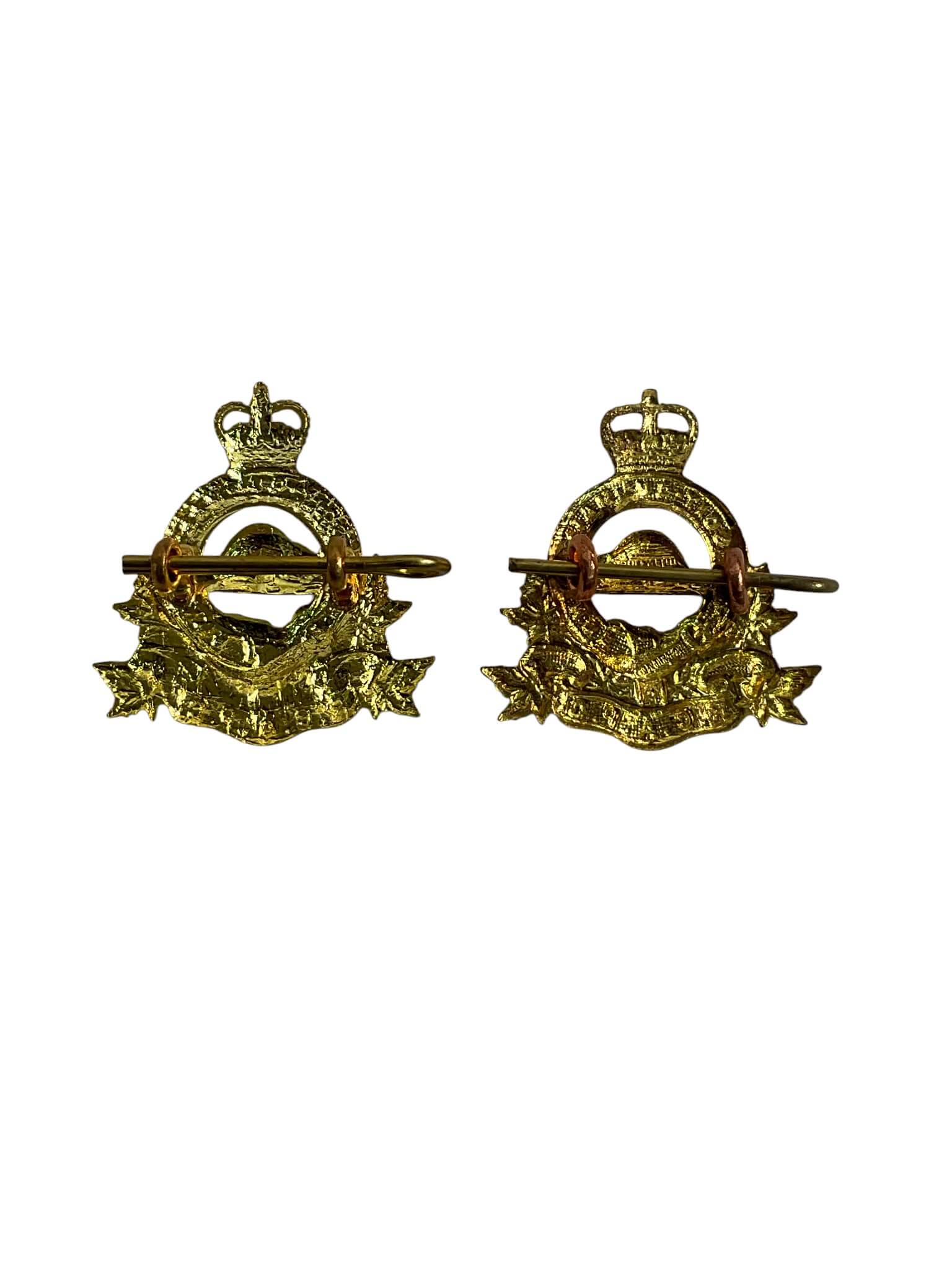 The Royal Canadian Army Pay Corps Collars Insignia Pair consists of two matching insignia designed for members of the Royal Canadian Army Pay Corps, a branch responsible for financial administration within the Canadian Army. Each collar device displays the symbolic elements associated with the Corps, including the royal crown and a maple leaf motif, reflecting its Canadian heritage and official military status. These insignia would have been worn on the collars of service uniforms to indicate the wearer’s affiliation with the Pay Corps, particularly during the early to mid-20th century. Manufactured in metal with a gilt or brass finish, the pair features detailed relief and was produced to standard military specifications of the period. The Royal Canadian Army Pay Corps played a crucial role in maintaining financial systems, and these insignia are representative artifacts from that era of military administration history. Suitable as reference material or examples for those studying Canadian military insignia and organizational structure.