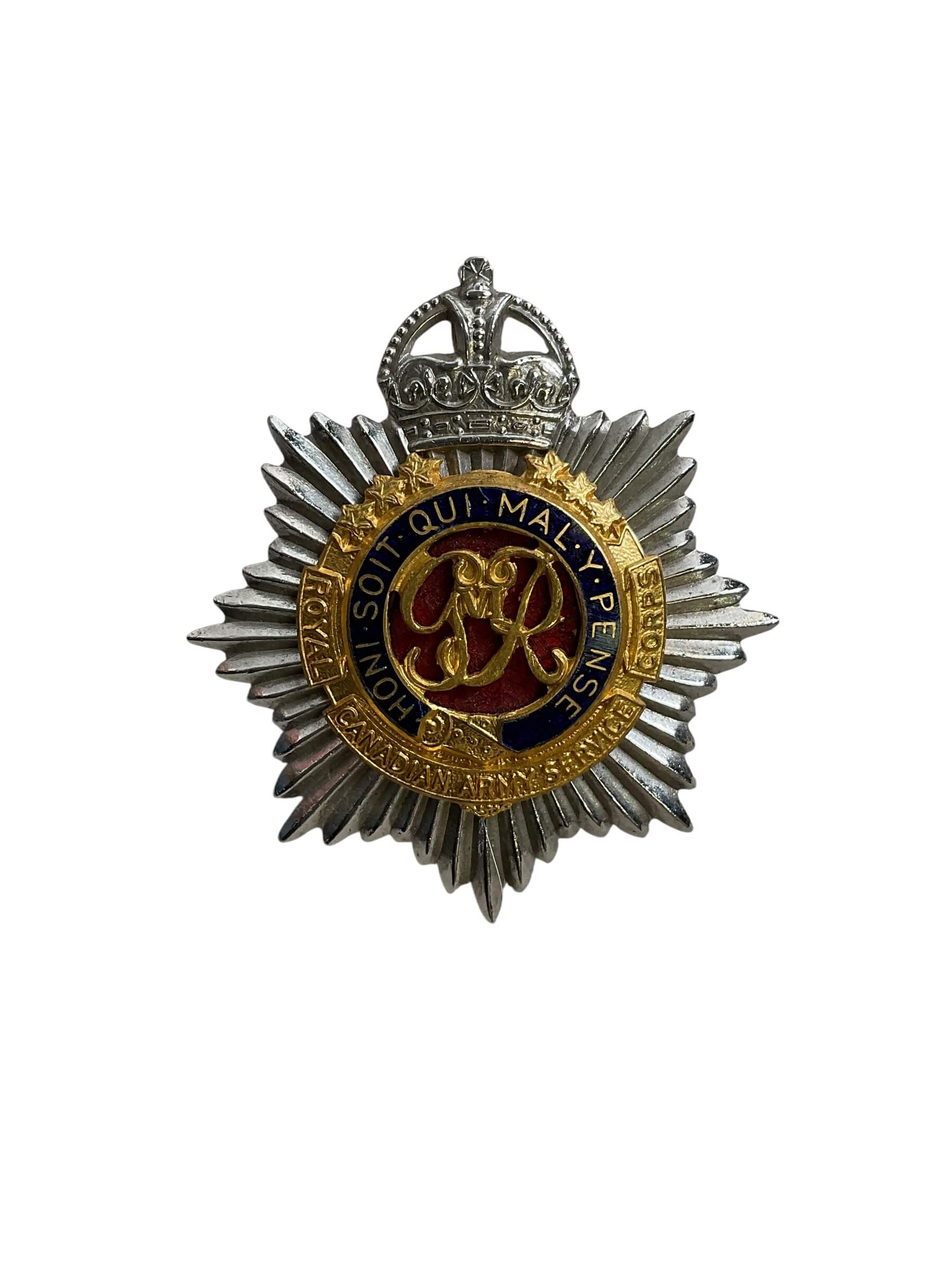 The ‘Royal Canadian Army Service Corps Officers Cap Badge’ is an emblematic item steeped in the rich history of Canada’s military. This distinctive insignia, worn prominently by officers on their caps, symbolizes their affiliation with the Royal Canadian Army Service Corps. The badge is meticulously designed, featuring a crown at the top, signifying royal patronage, and a laurel wreath surrounding the Corps’ initials – RCASC. It also includes a scroll underneath the initials, which reads ‘Honi soit qui mal y pense’, a French maxim translating to ‘Shame be to him who thinks evil of it’. This phrase is an integral part of the British chivalric code and is also found on the Royal Coat of Arms of the United Kingdom. The ‘Royal Canadian Army Service Corps Officers Cap Badge’ is not just an accessory, but a piece of timeless heritage that embodies the values, honor, and dedication of the officers who serve in the Corps.