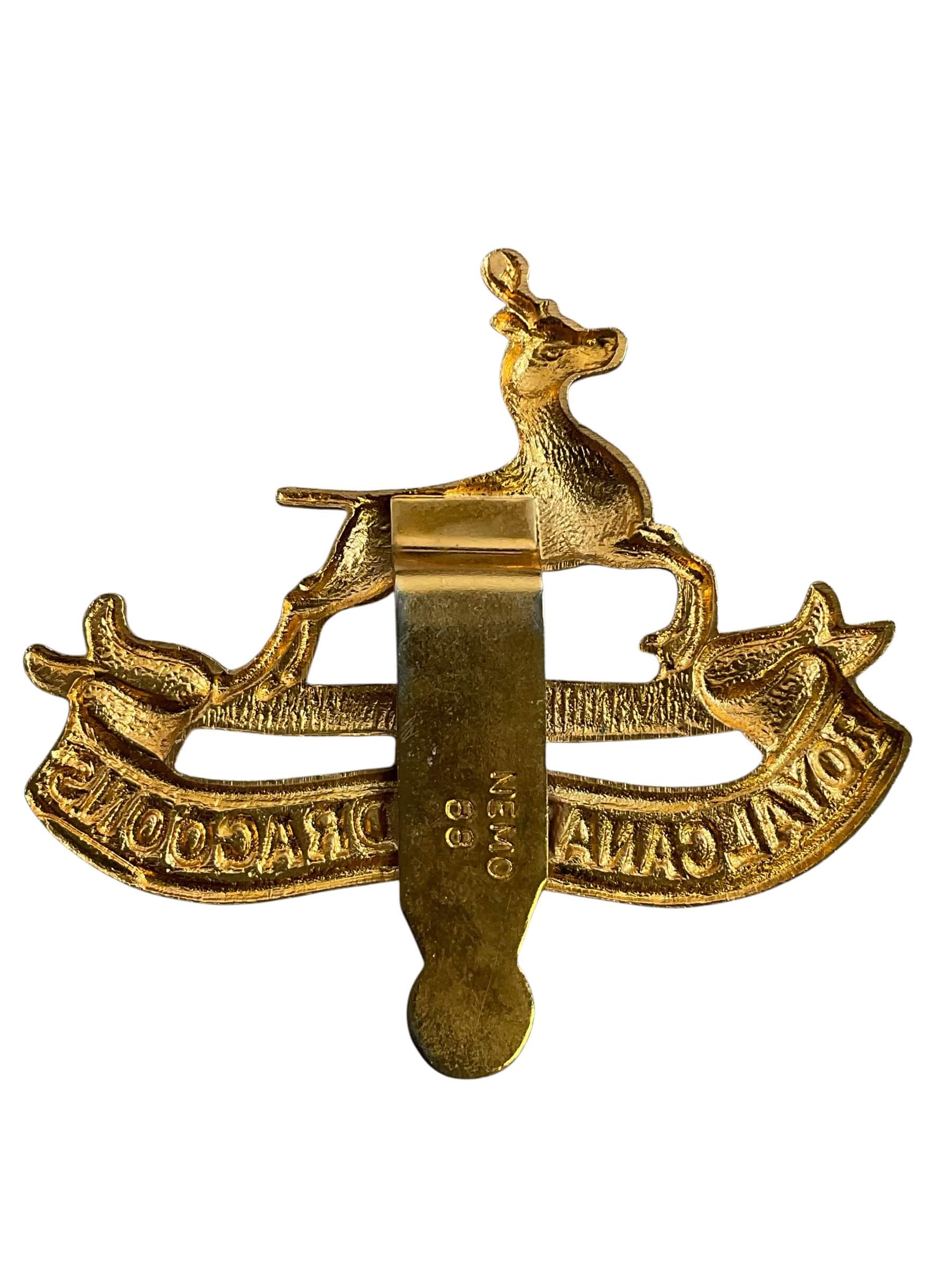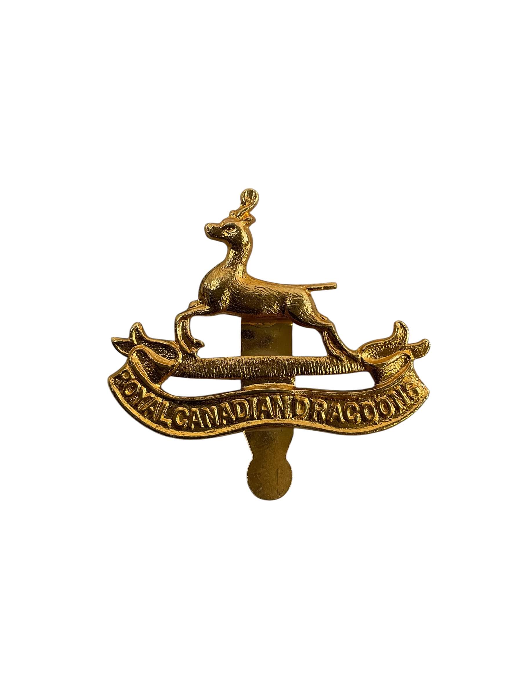 The ‘Royal Canadian Dragoons Cap Badge’ is a remarkable emblem that serves as a symbol of pride, strength, and unity for the oldest regular force cavalry regiment in Canada. This distinctive badge, often crafted from brass or other durable metals, typically features the prominent depiction of a crowned lion standing on a globe, a design that traces its roots back to the reign of Queen Victoria. The badge is adorned with the words ‘Royal Canadian Dragoons’, highlighting the regiment’s prestigious standing. It is customarily worn on the peak of the regimental headdress, adding an element of honour and respect to the uniform. As a cherished piece of military regalia, the Royal Canadian Dragoons Cap Badge is a tangible link to Canada’s rich military history, symbolising bravery, unity, and commitment to duty. It is a sought-after item among collectors and military enthusiasts around the world.
