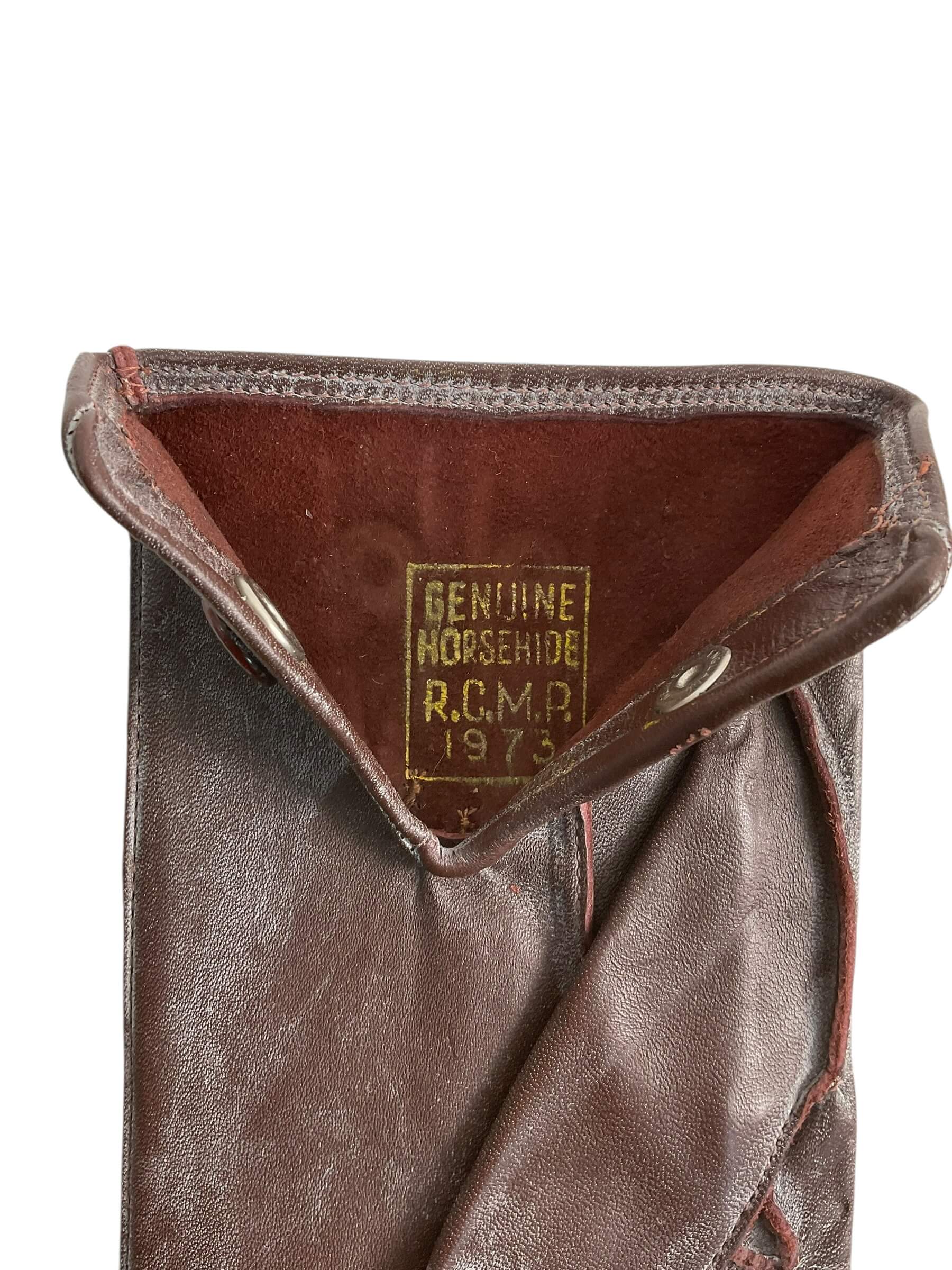 The Royal Canadian Mounted Police (RCMP) Brown Gloves, Size 9 1/2, dated 1973, are standard-issue handwear used by members of the RCMP during the 1970s. Constructed from durable brown leather, these gloves feature a traditional design consistent with official RCMP uniform requirements of the period. The glove size is marked as 9 1/