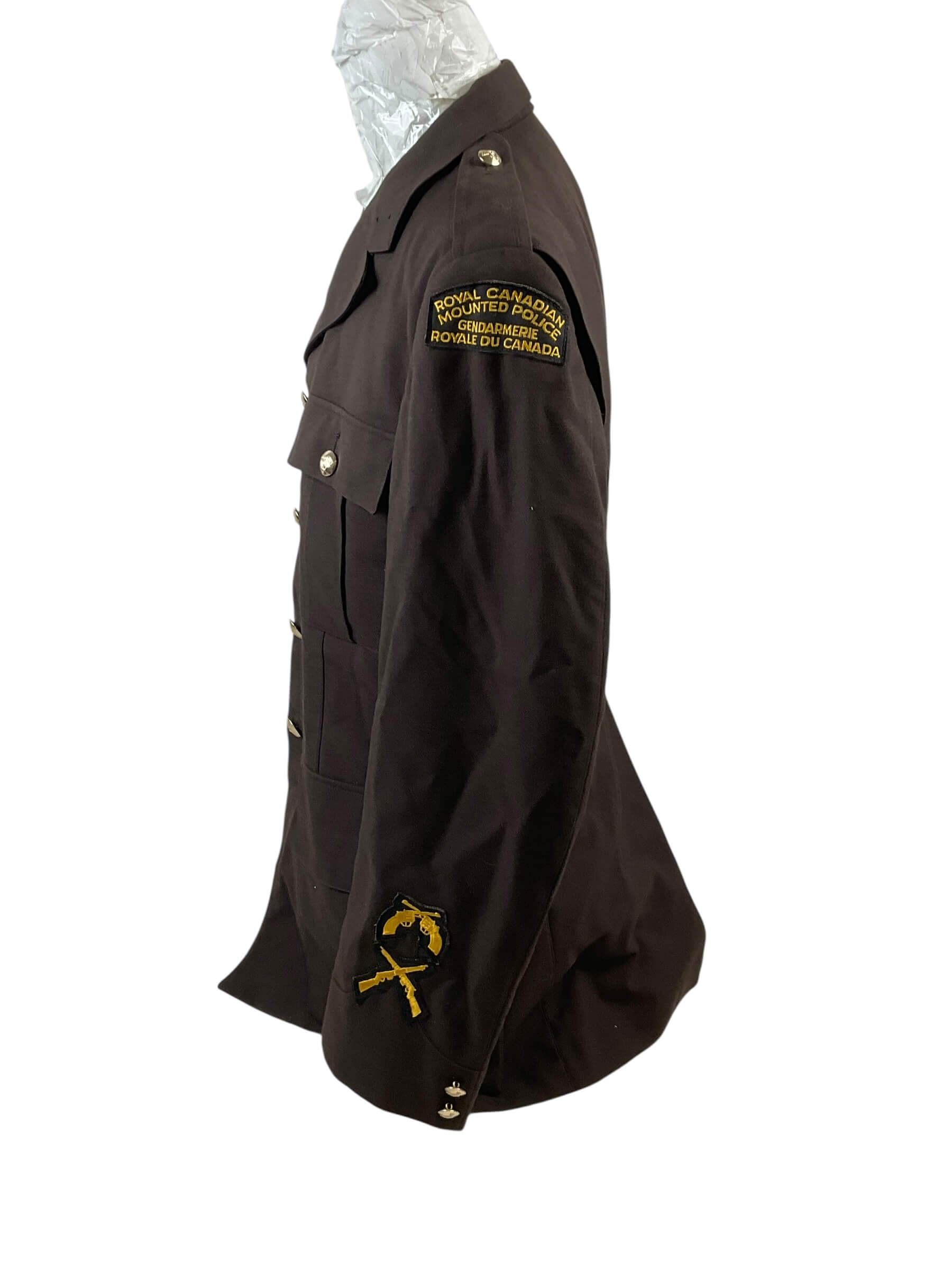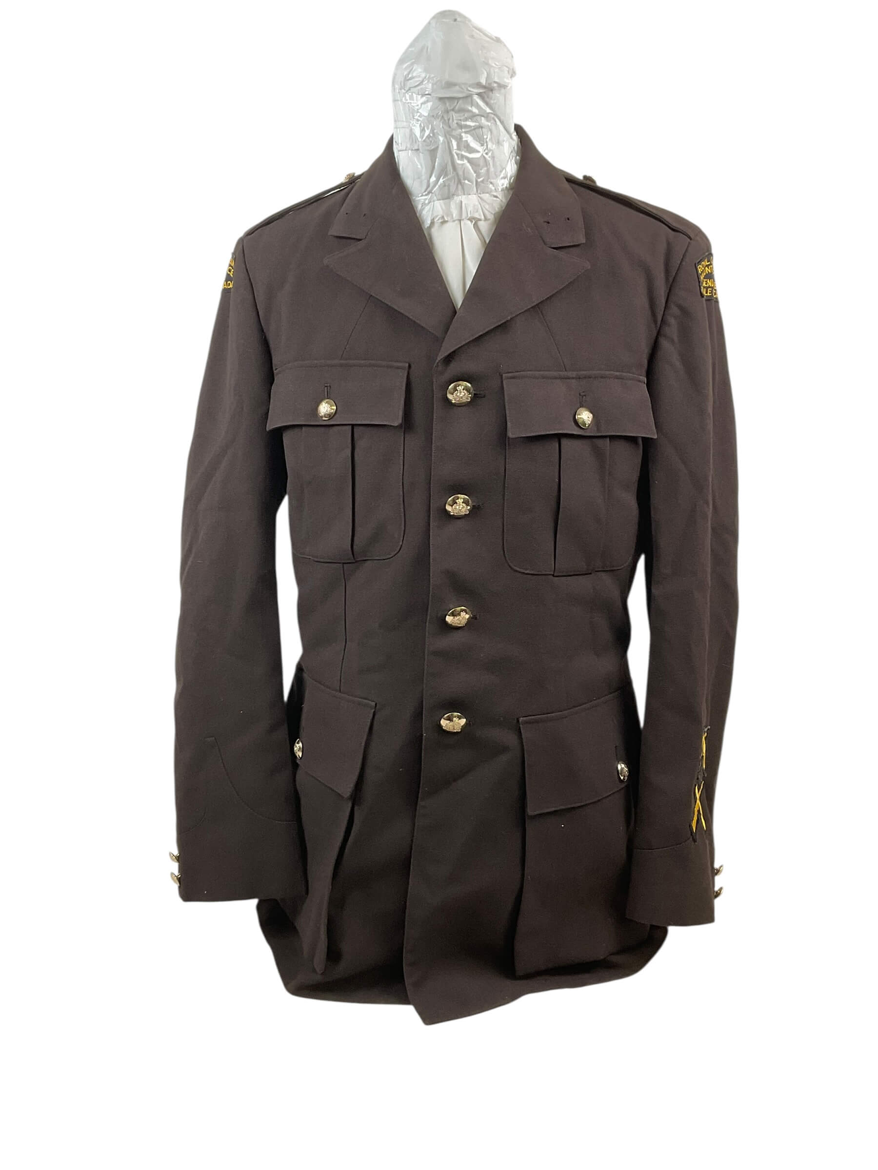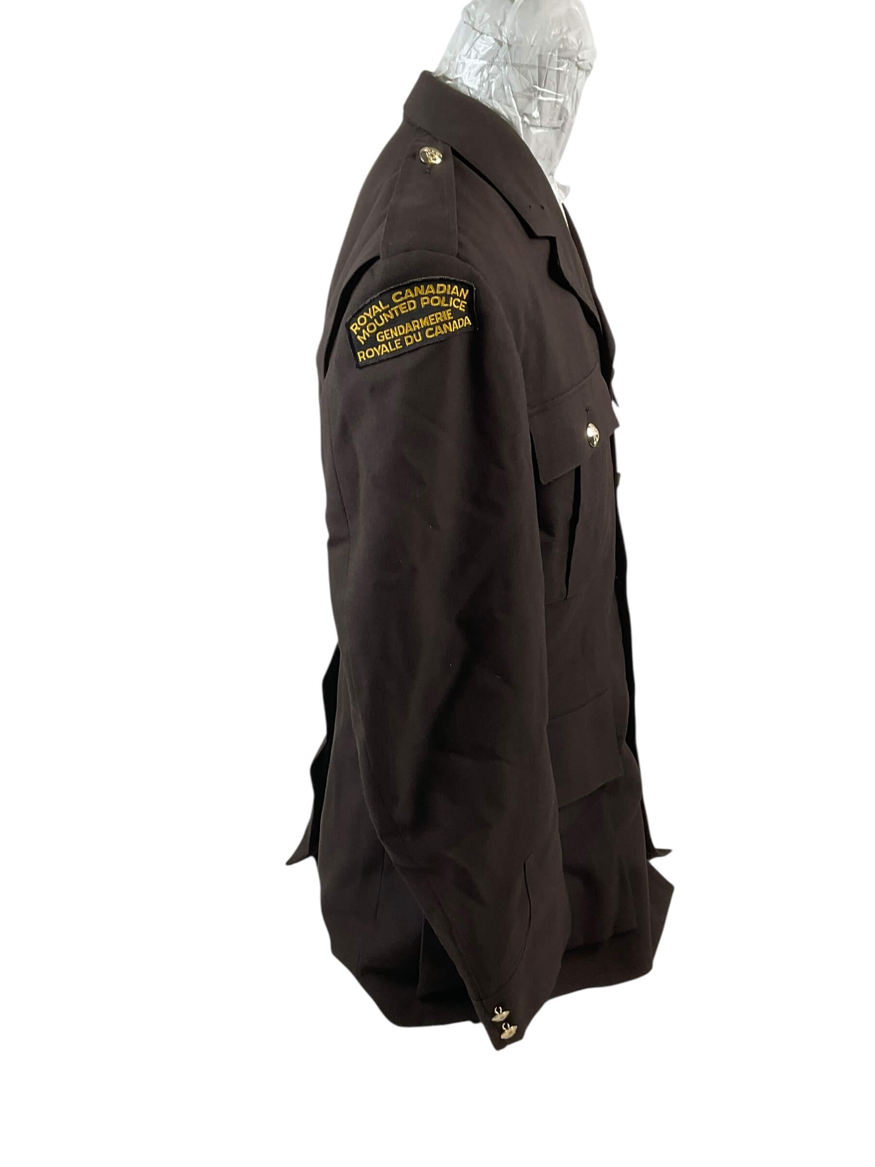 The Royal Canadian Mounted Police (RCMP) Brown Uniform Jacket, size 40 chest, dated 1973, represents an example of official Canadian law enforcement attire from the early 1970s. Constructed from durable brown fabric, this jacket was part of the standardized uniform issued to RCMP officers during this period. Notable features include a button front closure, shoulder epaulettes, and flap pockets, designed for functionality and ease of movement. The interior label includes sizing information and the date of manufacture. The RCMP, established in 1873, is recognized as Canada’s federal and national law enforcement agency, and its uniforms are distinctive symbols of Canadian policing history. This jacket reflects the style and materials typical of the era and provides insight into uniform evolution within the force. The garment shows standard details consistent with RCMP specifications of the early 1970s and is suitable for reference by collectors, historians, and those studying law enforcement uniforms.