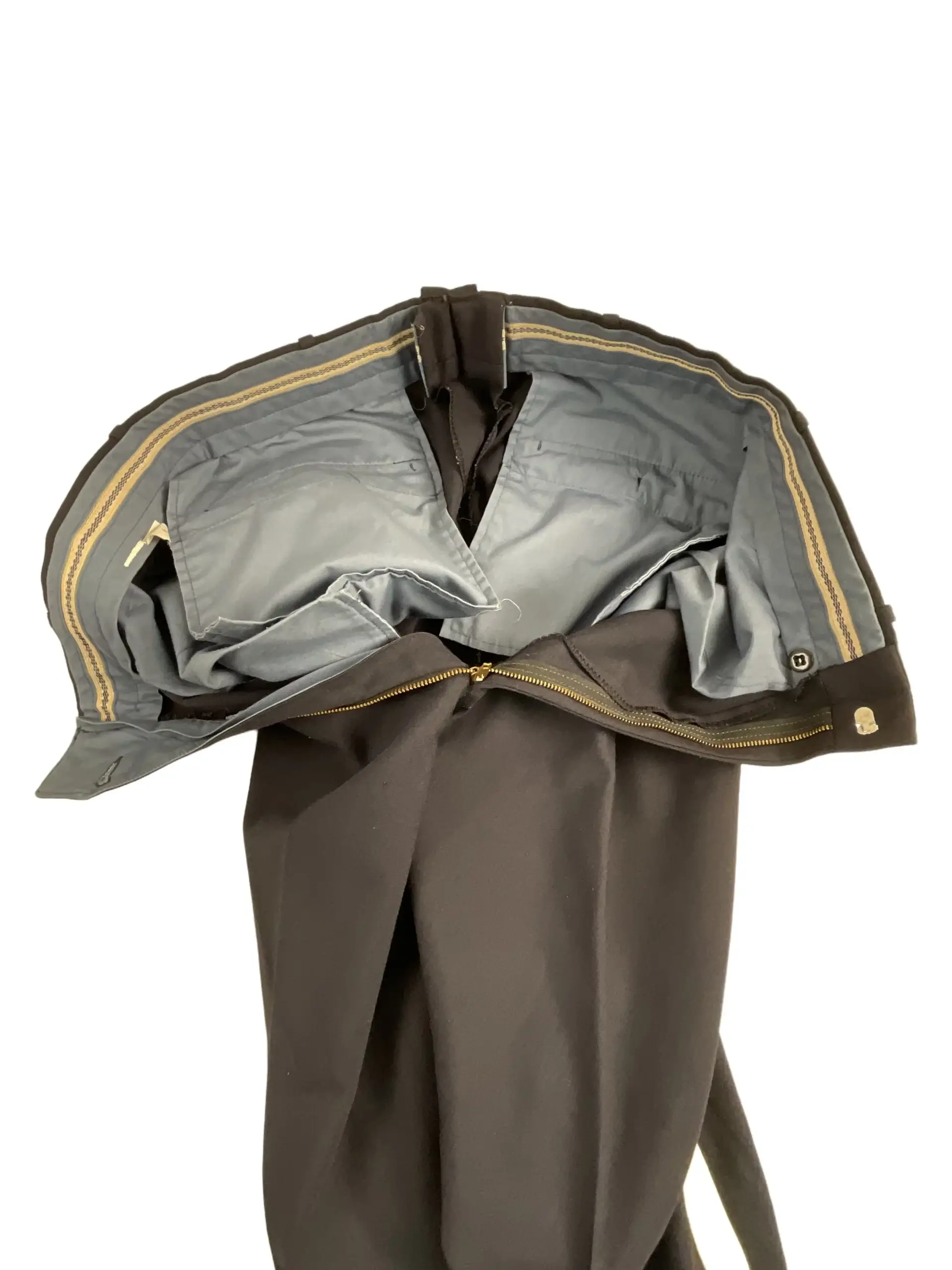 The Royal Canadian Mounted Police (RCMP) Pants Trousers, size 34 x 34, are part of the standard dress uniform issued to members of Canada’s national police force. These trousers are constructed from durable cotton fabric and feature a distinctive stripe along the outer seam, characteristic of RCMP attire. The stripe serves both a decorative and functional role, symbolizing the unit’s tradition and status. Designed for daily wear, these pants provide a straight-leg fit typical of service uniforms. The waistband, belt loops, and standard pockets further reflect utilitarian design in police clothing. Such trousers would commonly be worn with other uniform components, including the iconic red serge tunic. Items like this are of interest to collectors of law enforcement and Canadian military memorabilia, providing insight into the material culture and dress regulations of the RCMP. This example is well suited for historical reference and display within military antique collections.