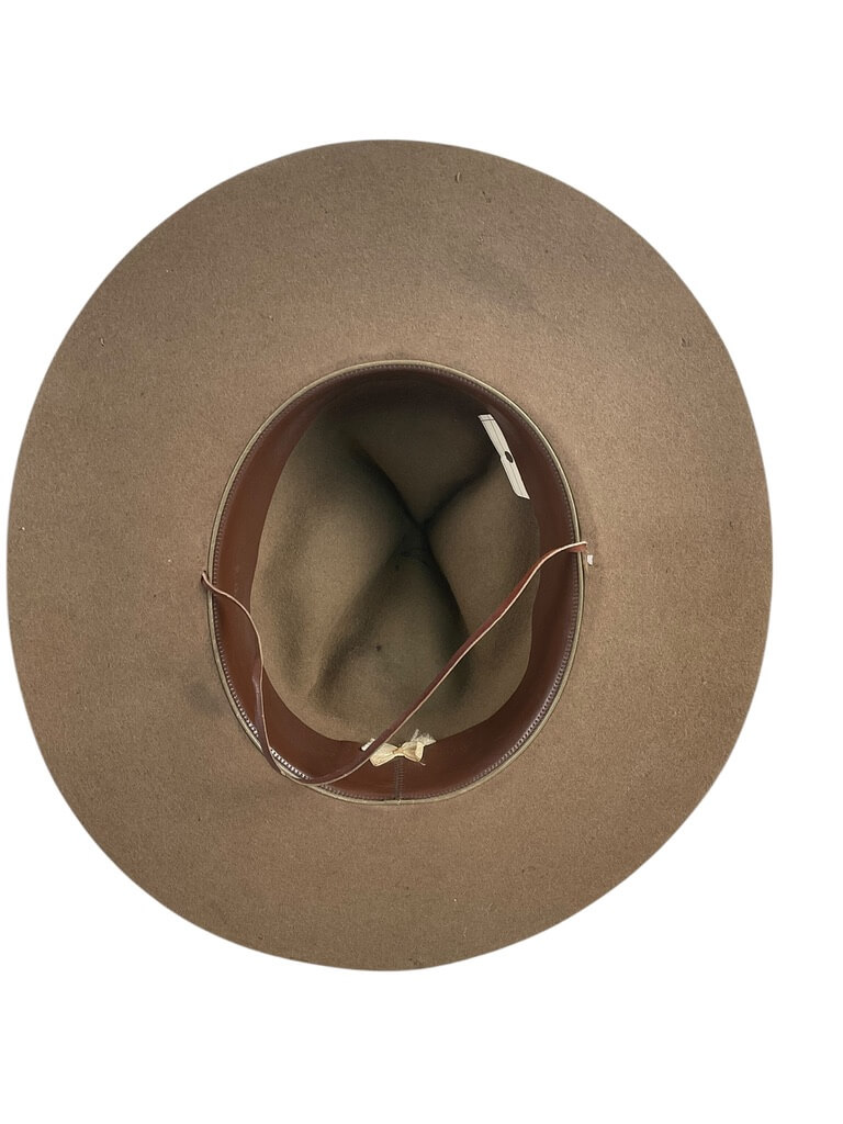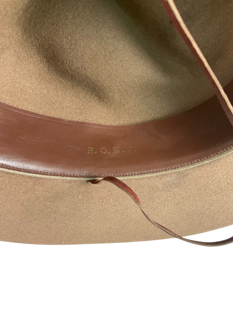 The Royal Canadian Mounted Police (RCMP) Stetson Hat, size 7 3/8, is a formal element of the iconic dress uniform worn by members of Canada’s national police service. The wide-brimmed brown felt hat, known for its distinctive “Montana peak” or “campaign hat” design, has been in official RCMP use since 1904. This example features the traditional four-dent crown, a grosgrain ribbon hatband, and a leather sweatband. The RCMP Stetson is a symbol of Canadian heritage and is associated with public events, ceremonial duties, and formal occasions. The interior sizing tag confirms the hat’s size as 7 3/8. This hat is a representative artifact for collectors of police, Canadian, or Commonwealth uniforms and insignia. As part of military and law enforcement history, such items provide insight into the attire and traditions of the Royal Canadian Mounted Police.