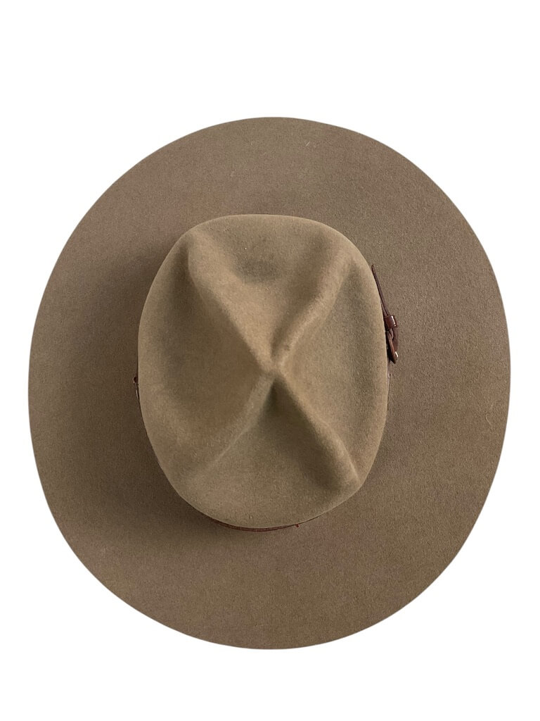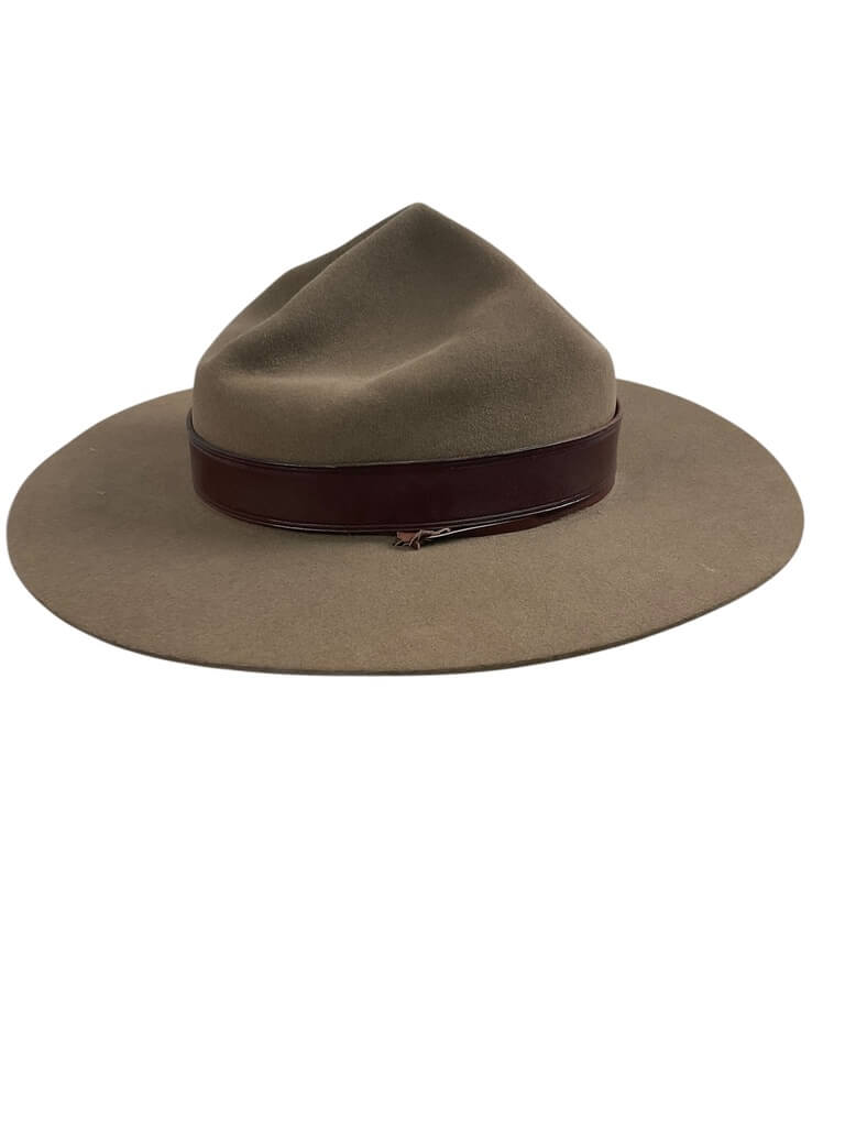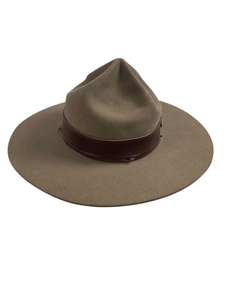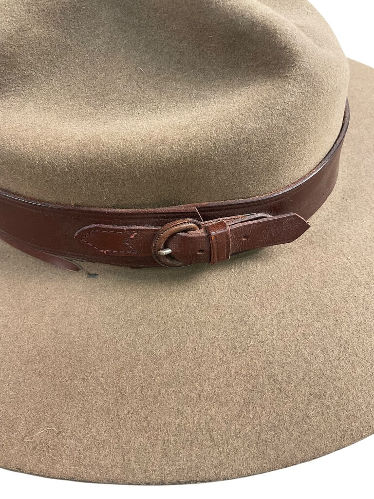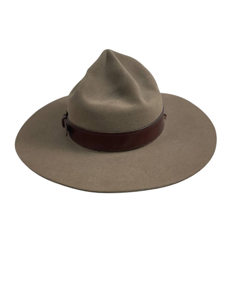 The Royal Canadian Mounted Police (RCMP) Stetson Hat in size 7 3/8 is a uniform headgear item traditionally worn by members of Canada’s federal police force. This hat, commonly referred to as the “Mountie Stetson,” features a high-crowned, wide-brimmed design made from fur felt, intended to provide protection from the elements during field duty.