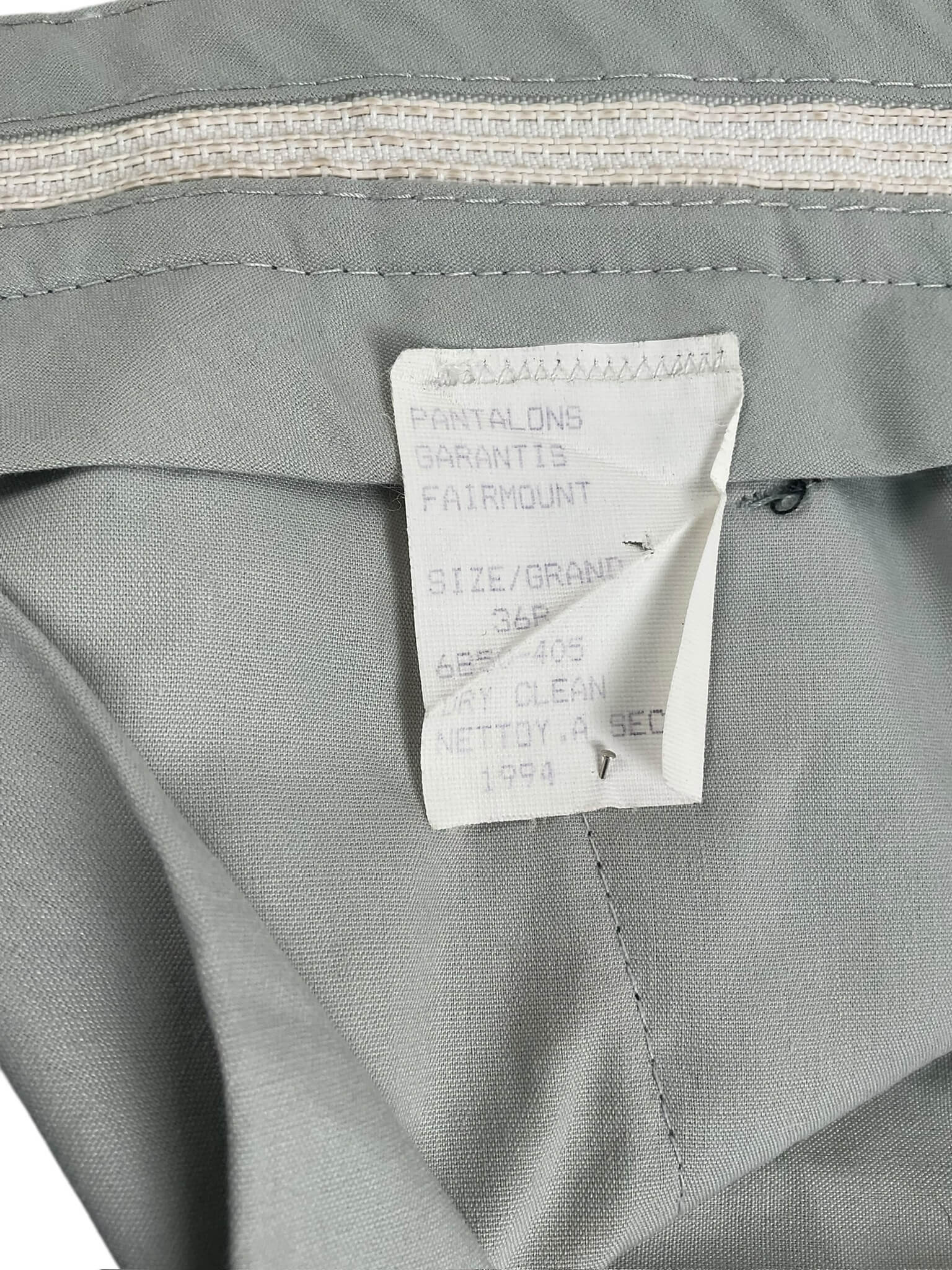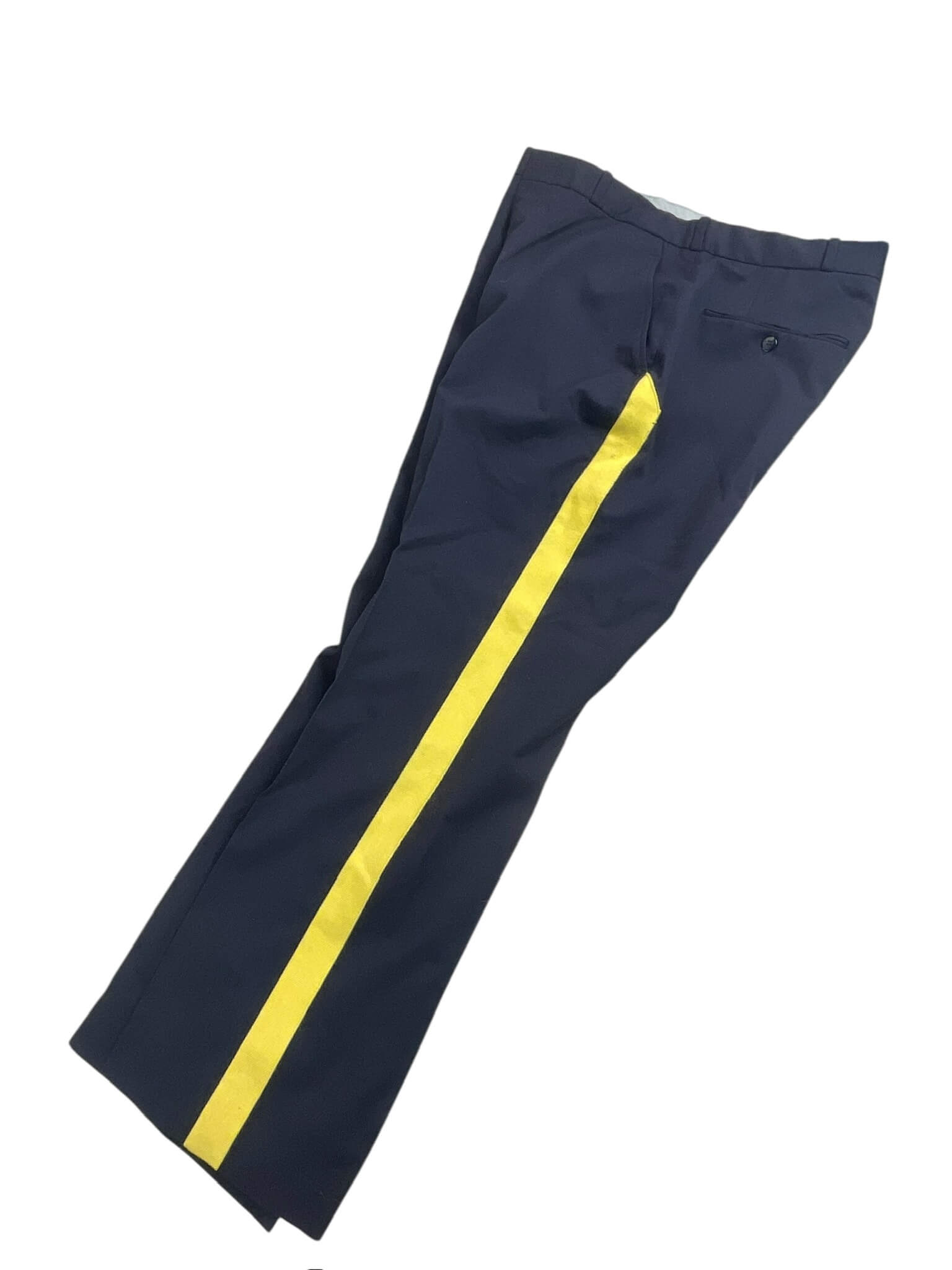 This listing features a pair of Royal Canadian Mounted Police (RCMP) trousers, size 36 Regular, dated 1994. The trousers are part of the official dress uniform issued to members of the RCMP, the national police service of Canada. The garment is constructed from durable fabric, tailored to maintain a professional appearance during regular duties and ceremonial occasions. Characteristic elements of RCMP trousers include the distinct stripe running down the outer seam of each leg, typically rendered in yellow to signify the iconic RCMP uniform. The item presented here retains its original label indicating its size, manufacture date, and service origin. These trousers are suitable for collectors, historians, or institutions focused on Canadian law enforcement or 20th-century police uniforms. Condition reflects typical use for garments of this age, with any notable wear detailed in accompanying photographs. This piece offers insight into the standard attire of the RCMP during the late 20th century.