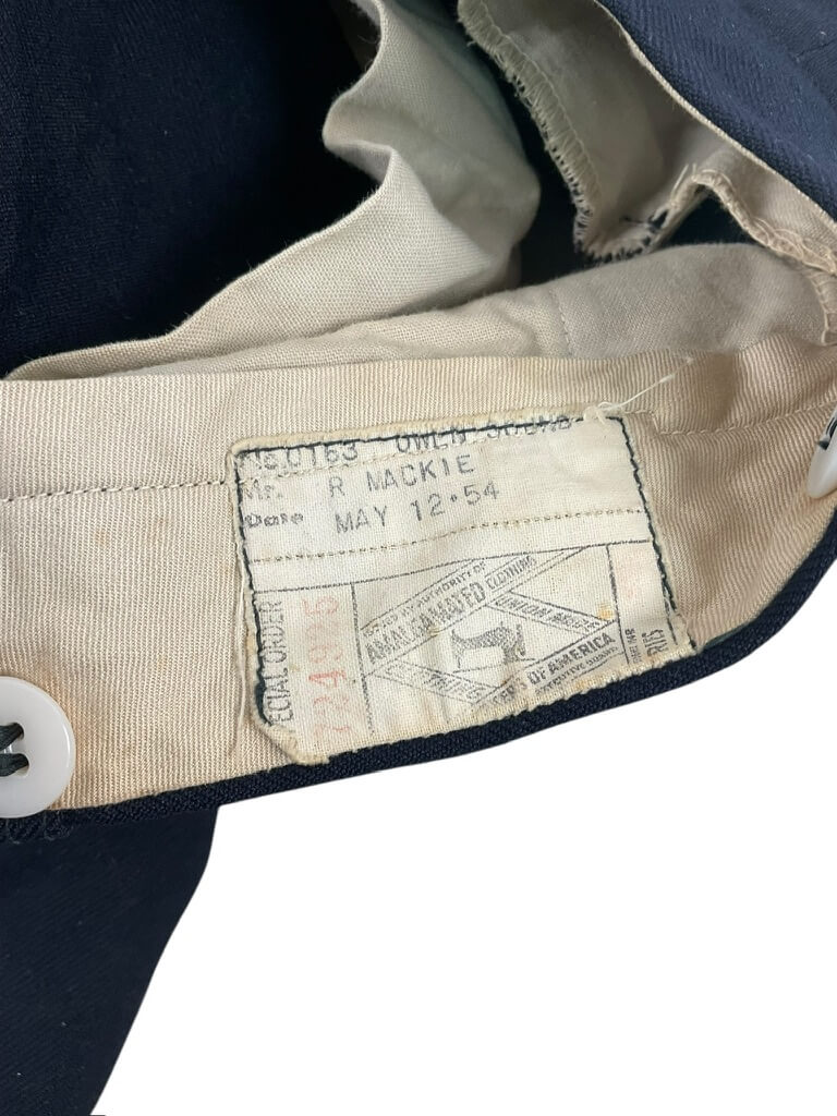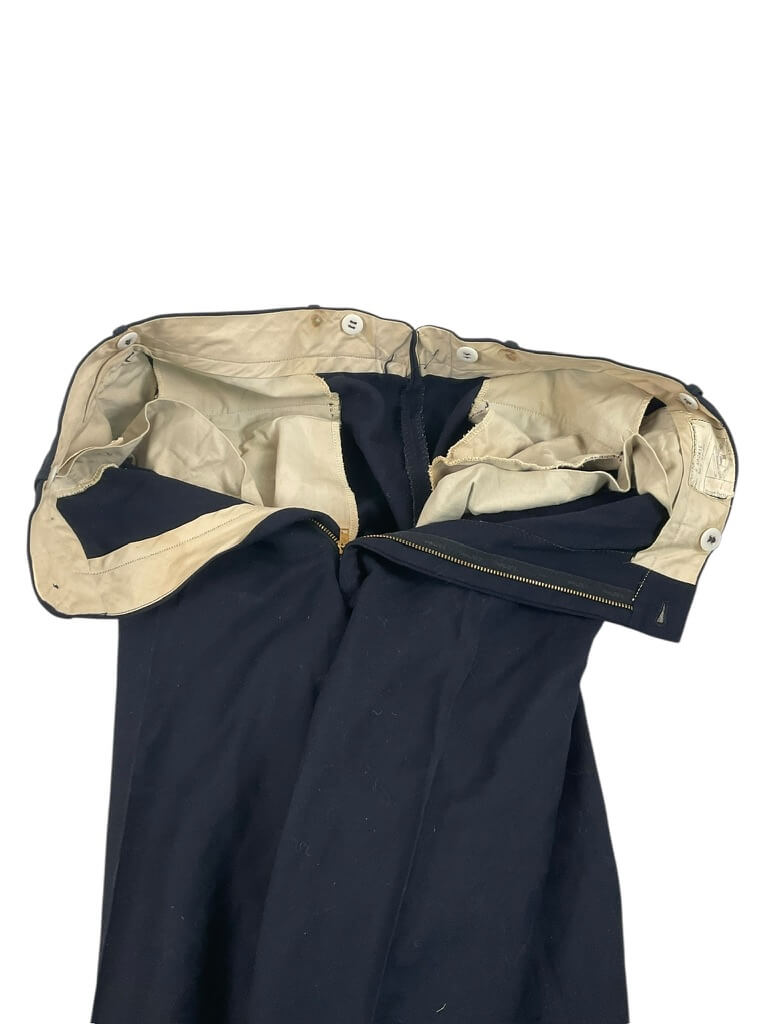 These are Royal Canadian Mounted Police (RCMP) trousers, named and dated 1954. The trousers are characterized by a waist size of 34 inches and an in-seam length of 32 1/2 inches. The design adheres to the traditional RCMP uniform style, commonly seen during the mid-20th century. The mentioned date suggests that these trousers are authentic pieces from the specified era, offering insight into RCMP uniform history. They feature the durable construction and functional design typical in professional law enforcement attire. Notoriously resistant to wear and tear, the fabric ensures longevity. These trousers are named, which may provide additional historical significance. Please note that no claim regarding replicas or reproductions is made in this description, and potential buyers should conduct their diligence regarding the trousers’ authenticity.