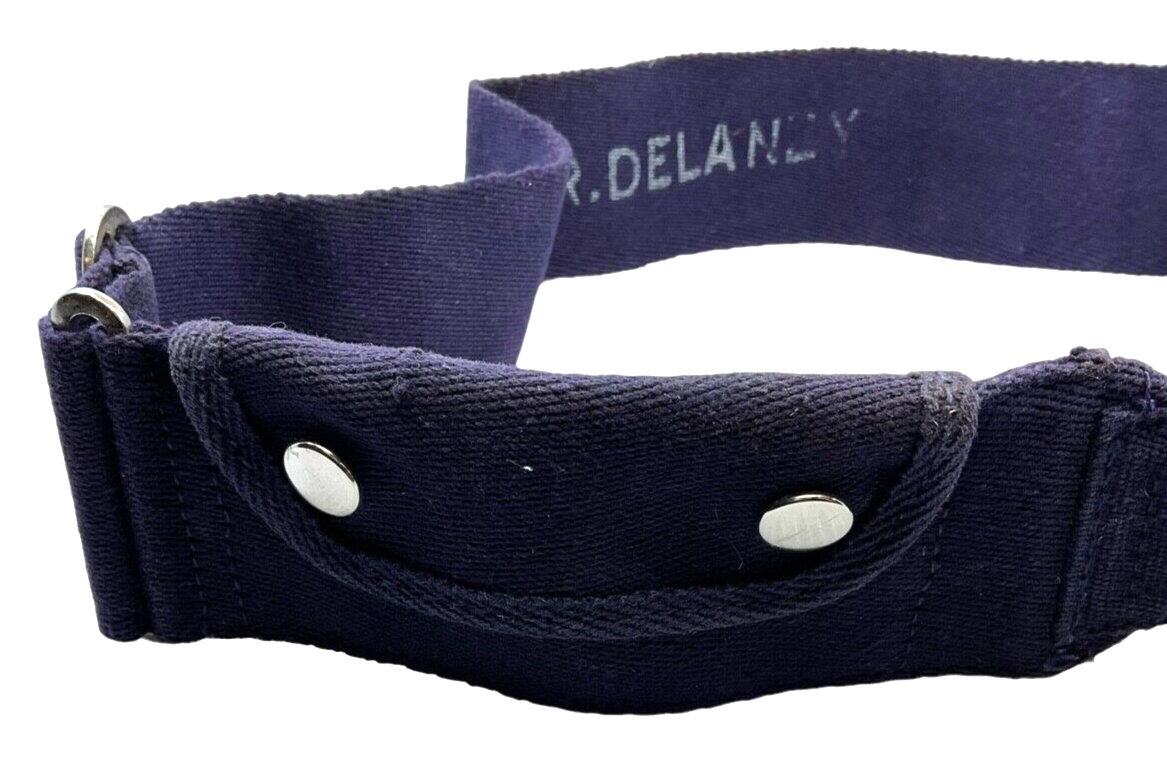 The Royal Canadian Navy 1976 Dated Blue Money Belt is a unique and authentic piece of naval history. Crafted in 1976, this belt is an essential accessory that offers functionality and style. It features a distinctive blue color, characteristic of the Royal Canadian Navy’s standard issue for that period. The belt is not only a practical item for securely carrying money and small personal items but also a collectible artifact for military enthusiasts. The name of the original owner is inscribed on the belt, adding a personal touch and historical significance. Sized as 1, it is suitable for various uses, whether as part of a reenactment uniform, a display item in a military collection, or a durable, vintage accessory. This belt represents a tangible connection to the seafaring life and traditions of Canada’s naval forces from the late 20th century.