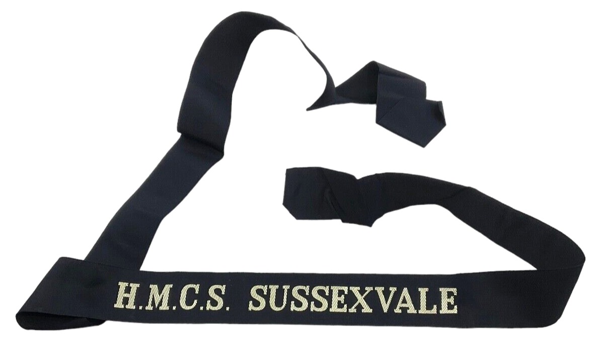 Royal Canadian Navy HMCS Sussexvale Cap Tally Full Length The “Royal Canadian Navy HMCS Sussexvale Cap Tally Full Length” is an authentic and historically significant piece of naval memorabilia. This full-length cap tally originates from the HMCS Sussexvale, a prominent naval vessel that served with distinction within the Royal Canadian Navy. The tally, a woven band traditionally worn on the caps of naval personnel, proudly bears the ship’s name in braided gold lettering, exemplifying the storied maritime heritage of the Canadian naval forces. Spanning the entire length required for traditional naval headgear, this cap tally is not just a piece of uniform—it is a tribute to the valor and dedication of Canadian sailors. Collectors and history enthusiasts alike will appreciate its pristine condition and its symbolic representation of Royal Canadian Navy traditions. This cap tally serves as a tangible link to Canada’s naval past and is a coveted item for anyone interested in military history or nautical memorabilia.