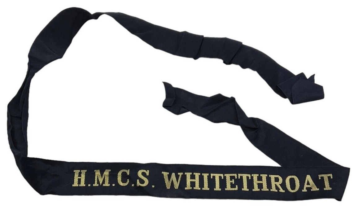 Royal Canadian Navy HMCS Whitethroat Cap Tally Full Length The ‘Royal Canadian Navy HMCS Whitethroat Cap Tally Full Length’ is a prestigious piece of naval memorabilia. This cap tally, marked with the ship’s name, was worn by sailors aboard the HMCS Whitethroat, a vessel that served with honor in the Royal Canadian Navy. Distinguished by its full-length design, this cap tally is a highly collectible item, perfect for those who cherish naval history or seek a tangible connection to Canada’s maritime heritage. Crafted with care, it embodies the dedication and spirit of the sailors who served aboard the HMCS Whitethroat. This item not only represents a significant piece of naval attire but also serves as a historical artifact that tells the story of bravery and commitment on the high seas, making it an invaluable addition to any collection of military memorabilia.