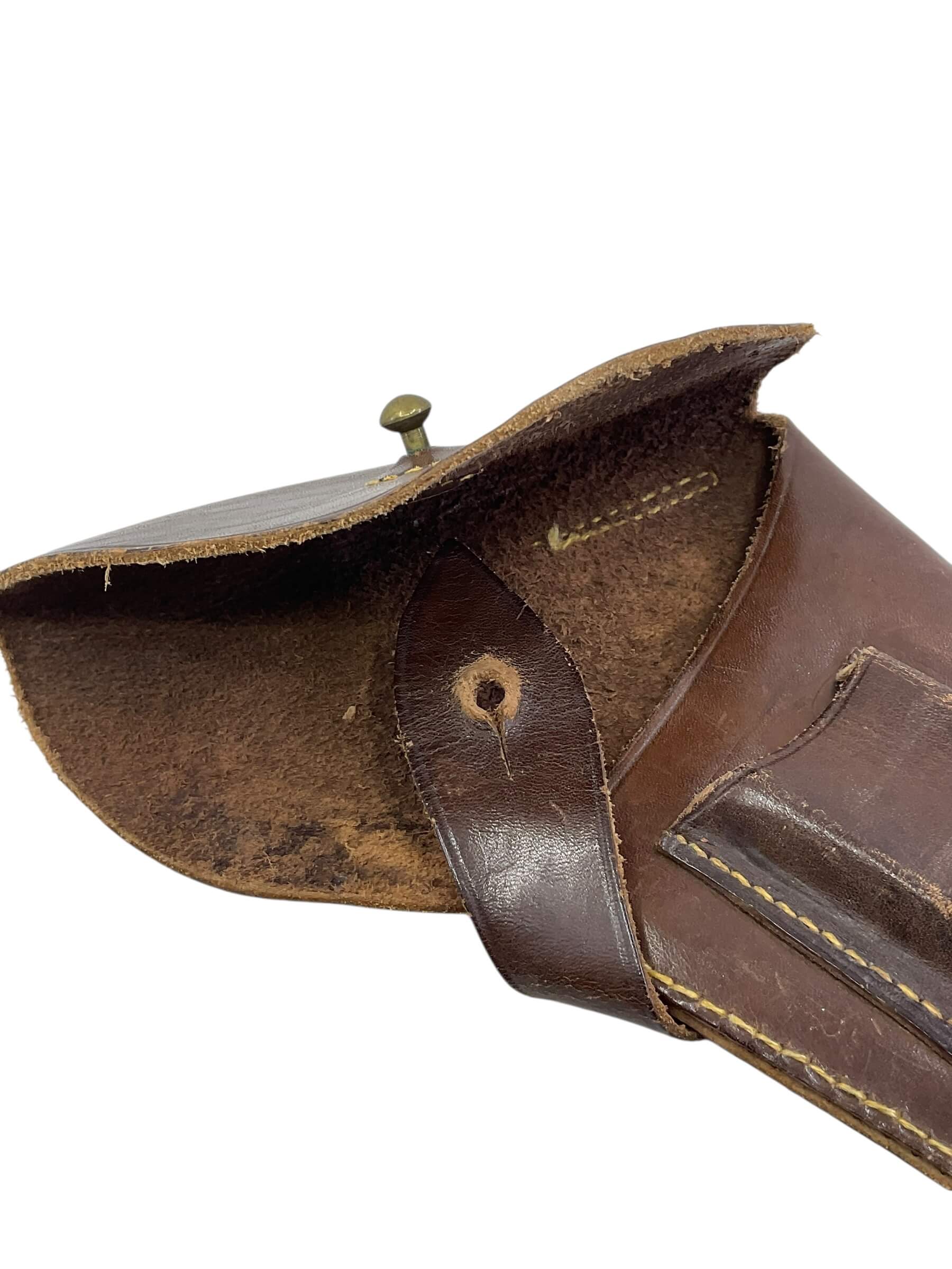 The Russian Soviet Brown Leather Tomatoe Pistol Holster is a standard-issue sidearm holster used by Soviet military personnel during the mid-20th century. Constructed from durable brown leather, this holster was designed to carry the TT-33 Tokarev semi-automatic pistol, commonly referred to as the “Tomatoe” pistol by some collectors. The holster features a full flap closure secured by a leather strap and metal stud, providing protection and retention for the firearm. A secondary pouch is included for carrying an extra magazine or cleaning rod. Belt loops on the rear allow for attachment to standard military equipment belts. Stitching and hardware are characteristic of Soviet field gear produced during this period. These holsters were used in a variety of military conflicts and exercises, reflecting the widespread issue of the TT-33 among Soviet forces. The item offers insight into Soviet military equipment design and personal gear of enlisted soldiers.