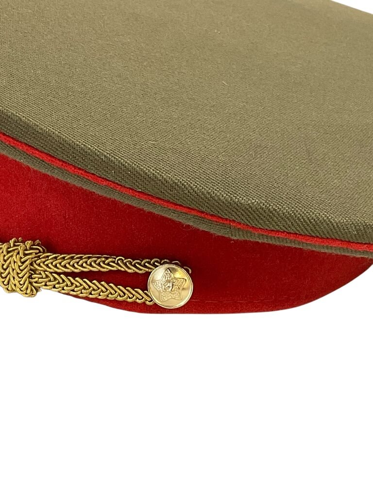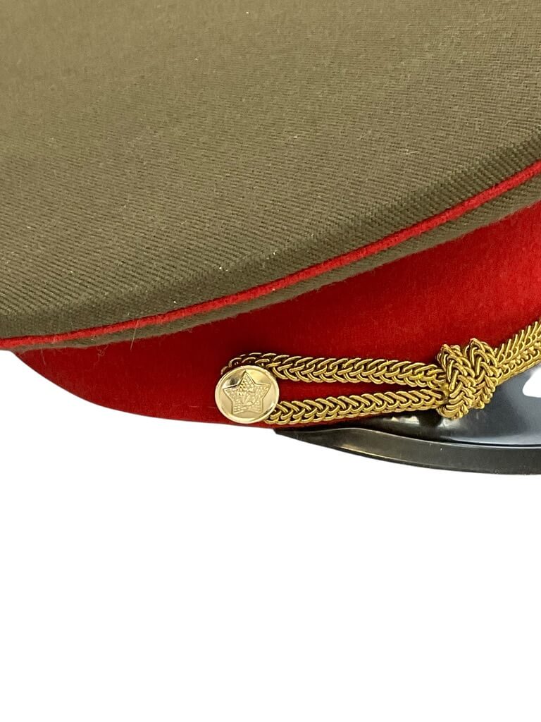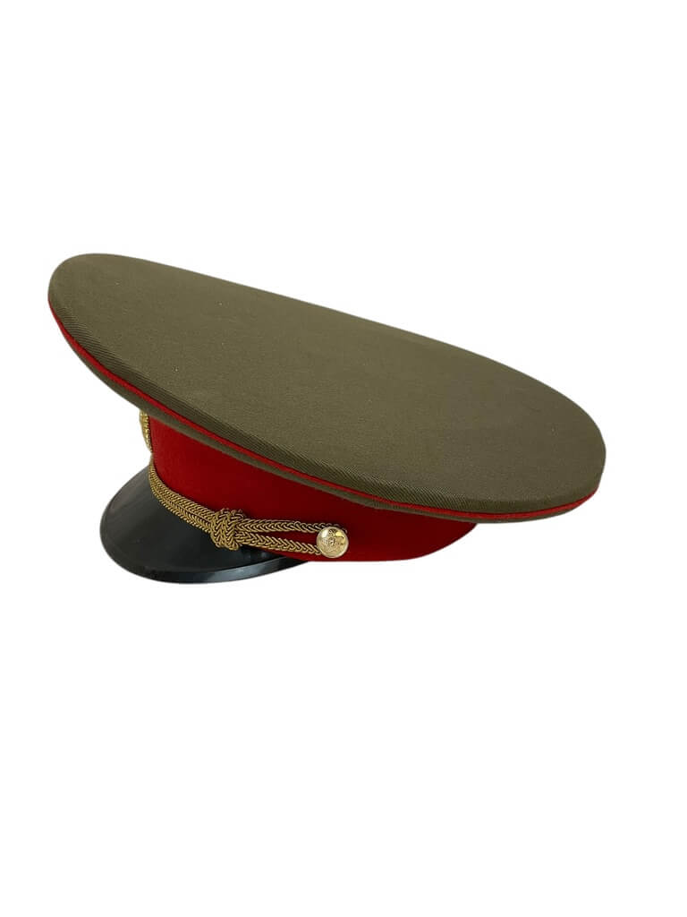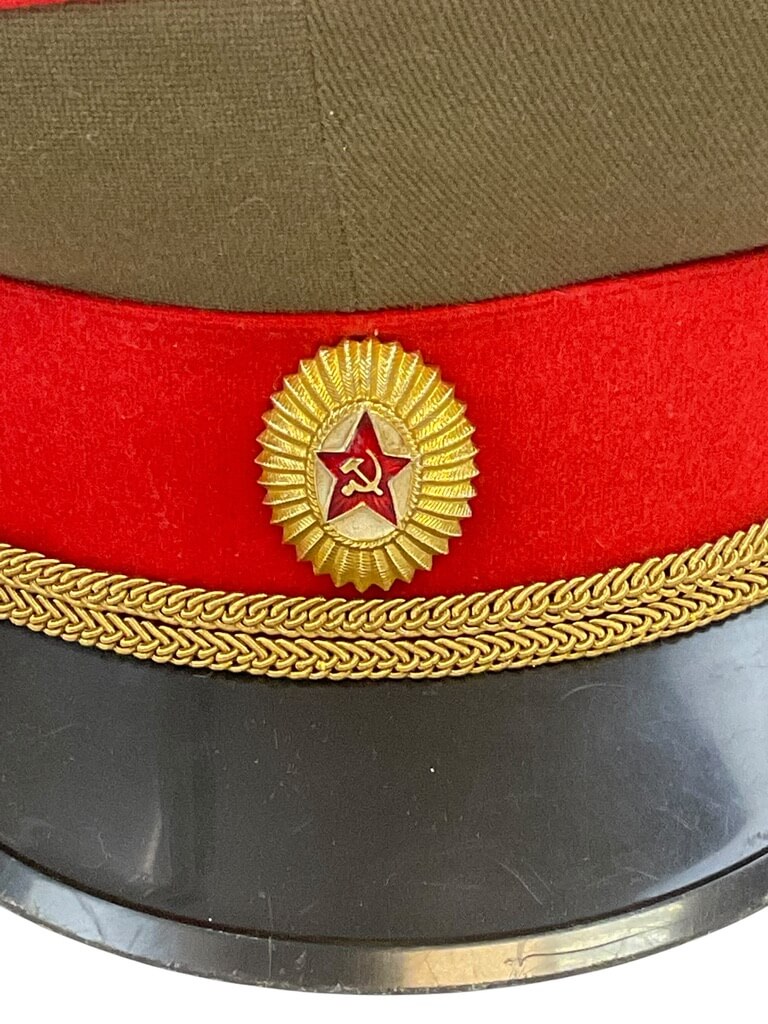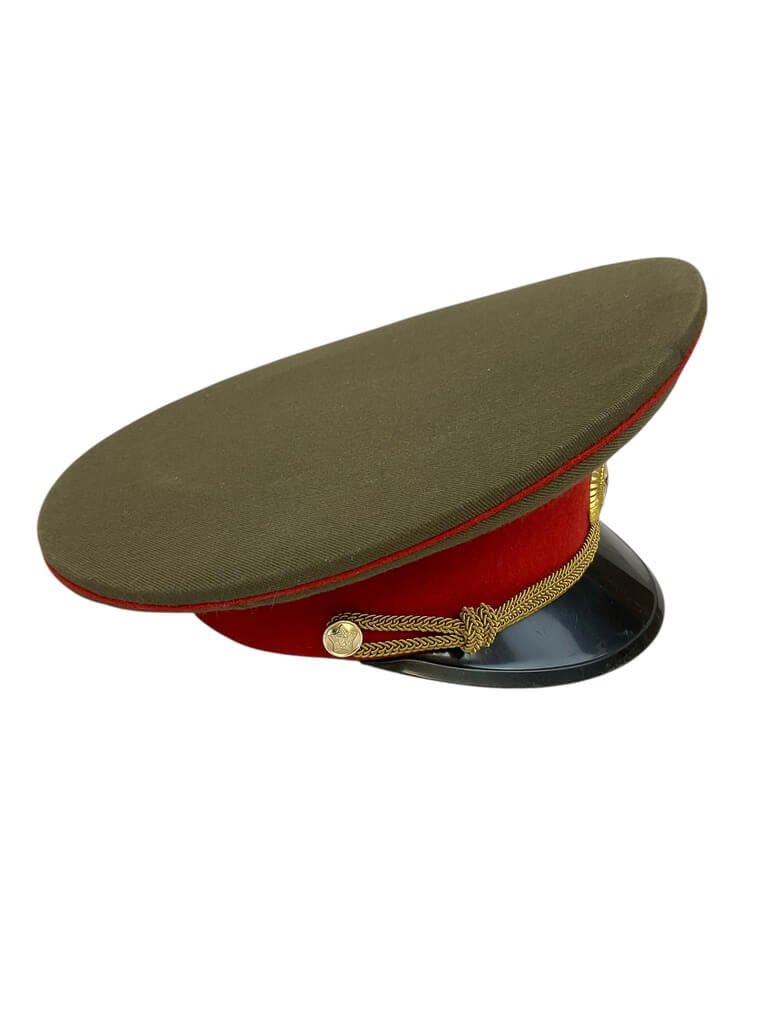 This genuine Russian Soviet Officer’s Peak Cap Hat is a unique piece of historical memorabilia. Sized at 7 1/4, it’s a perfect fit for collectors or history enthusiasts. The cap features the iconic red star emblem on the crown, symbolizing the Soviet Union. Made from high-quality materials, it sports a prominent peak and rigid structure, maintaining its shape despite its age. The interior of the cap is lined with soft fabric for added comfort while wearing. The hat’s exterior exhibits a rich, deep green color, which was the standard issue color for Soviet military uniforms. Whether you’re a collector of military paraphernalia, a history buff, or simply someone with a taste for the unique, this Russian Soviet Officer’s Peak Cap Hat is a valuable addition to any collection. It serves as a tangible reminder of a significant period in world history.