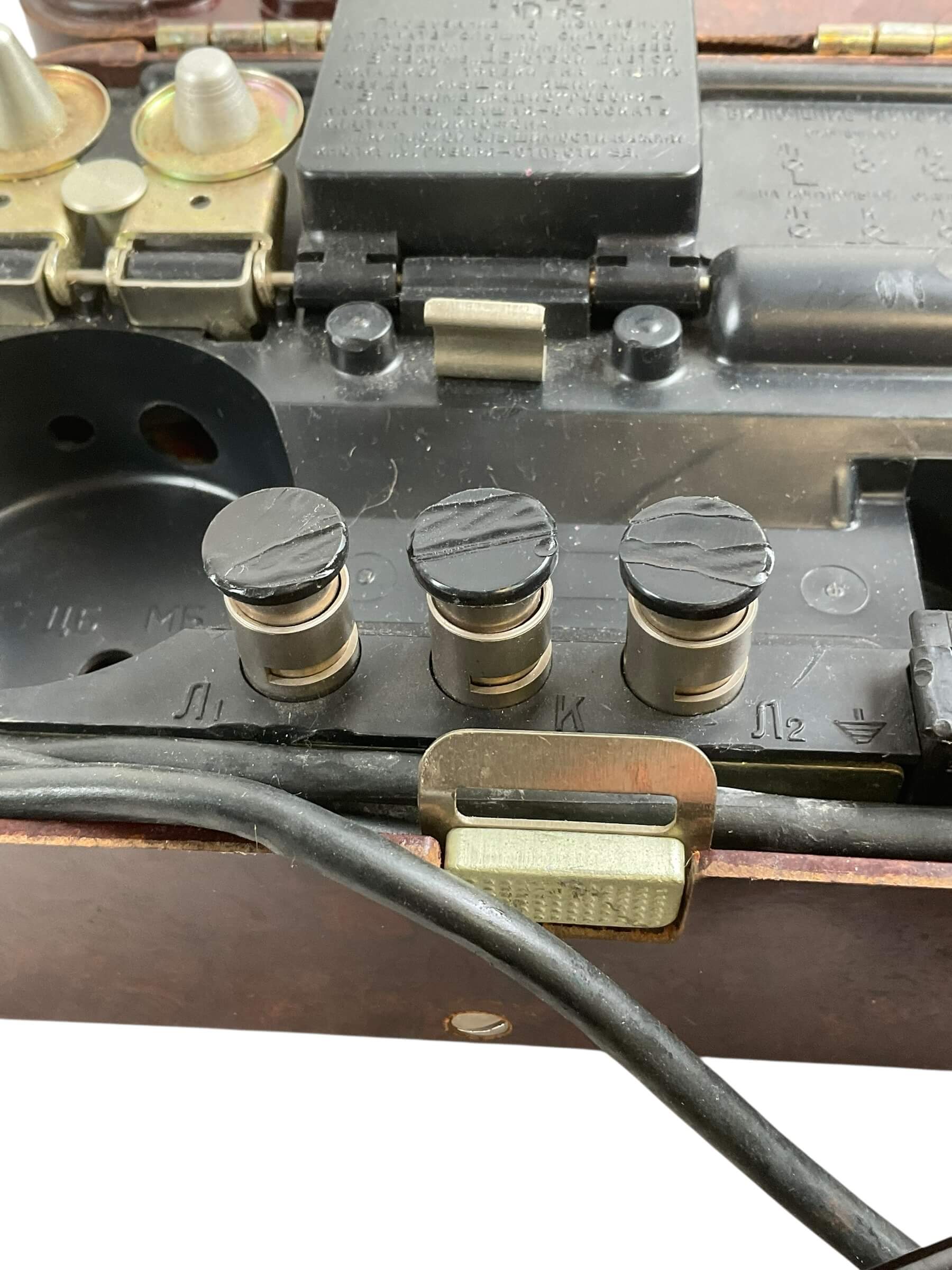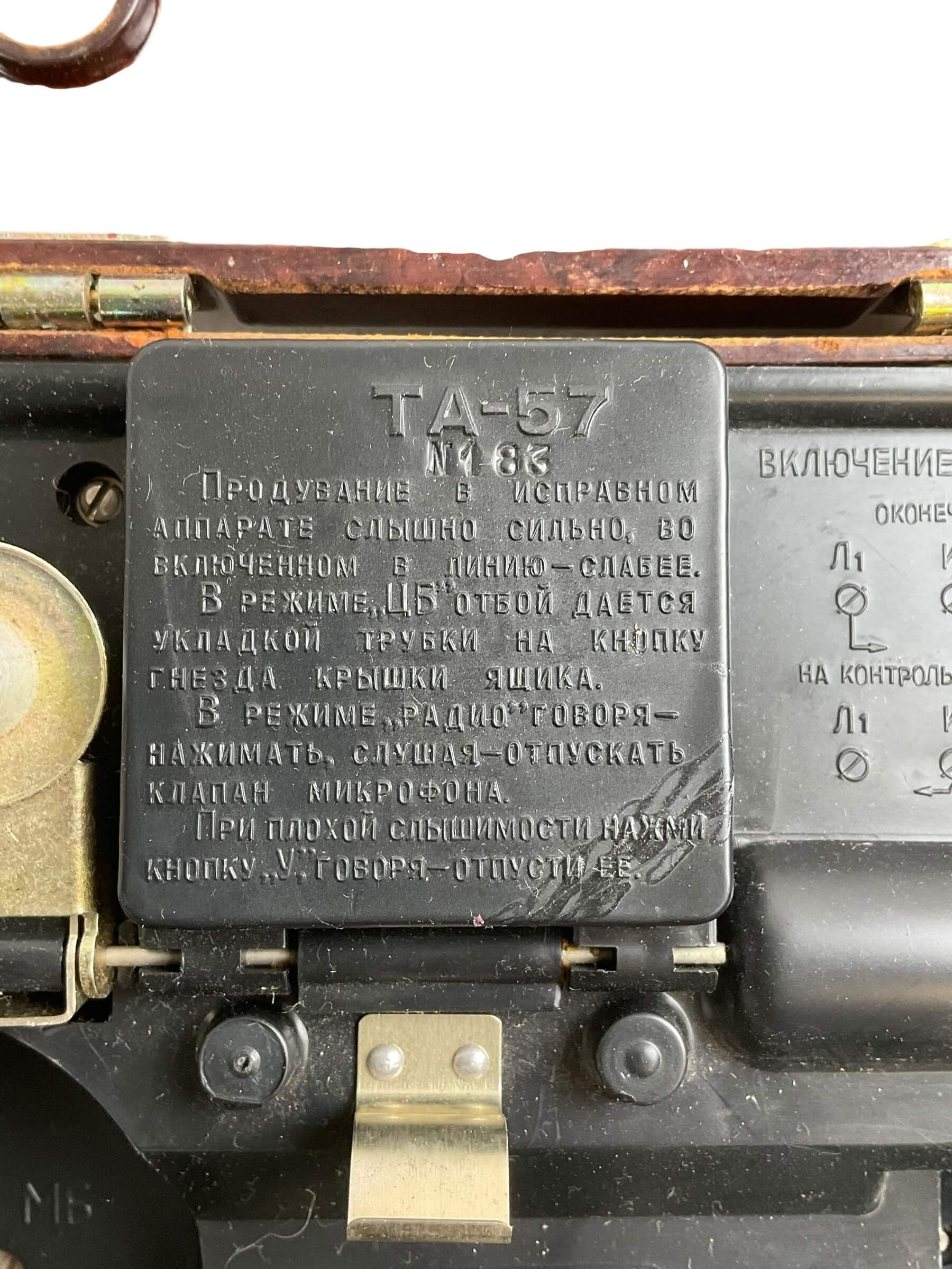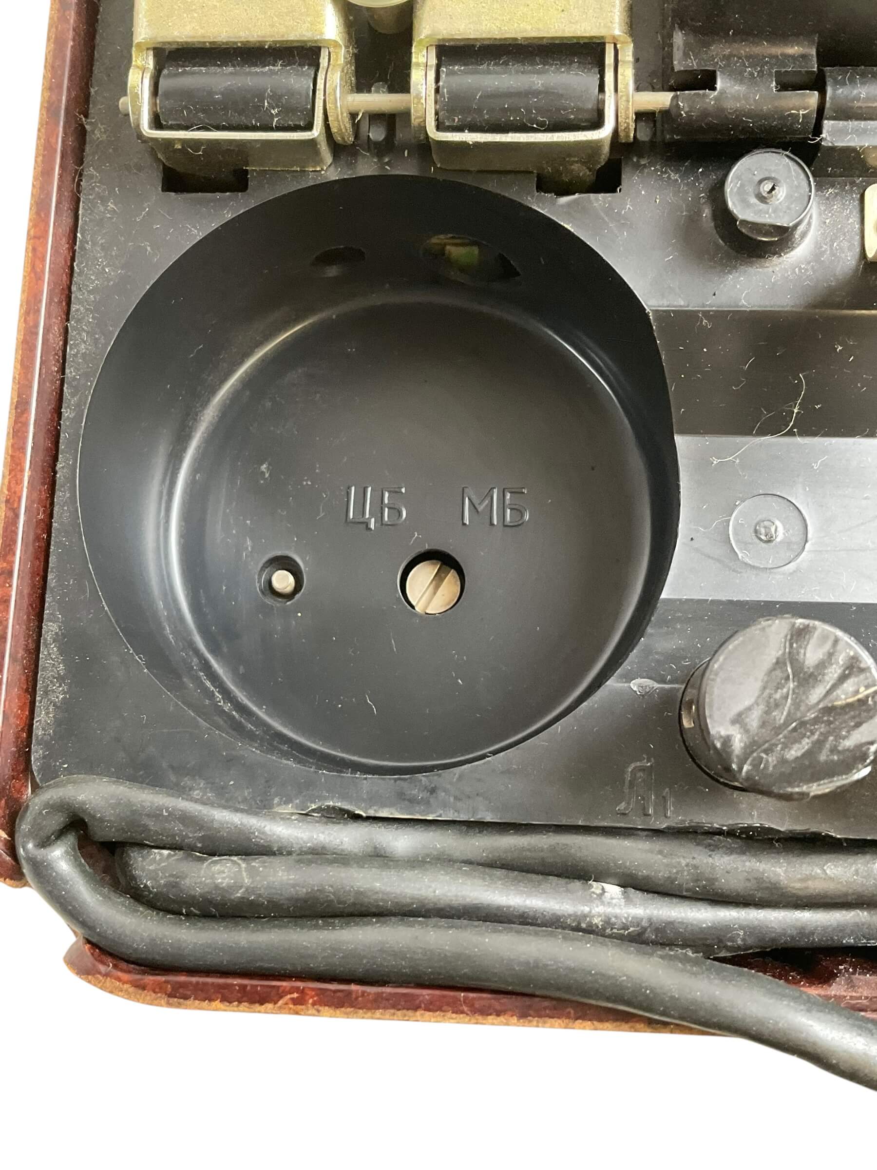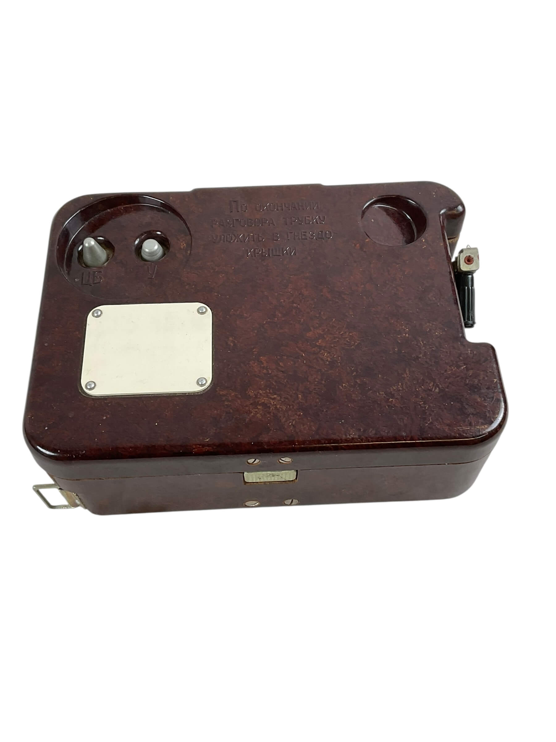 The ‘Russian Soviet TA 75 Field Phone’ is an antique military communication device, dating back to the Soviet era. This robust piece of equipment was designed for field communication during military operations. The TA 75 model is a wired system that functions without the need for a power source, a testament to its practical design. It is housed in a sturdy, olive green metallic case, which bears signs of its age and use, adding to its historical appeal. The device features a hand crank on the side to generate power, a removable handset, and rotary dial for operation. This field phone provides a fascinating glimpse into the past, representing the technological capabilities and strategic intricacies of the Russian Soviet military during the Cold War period. It remains a valuable collectible for military memorabilia enthusiasts and history buffs alike.