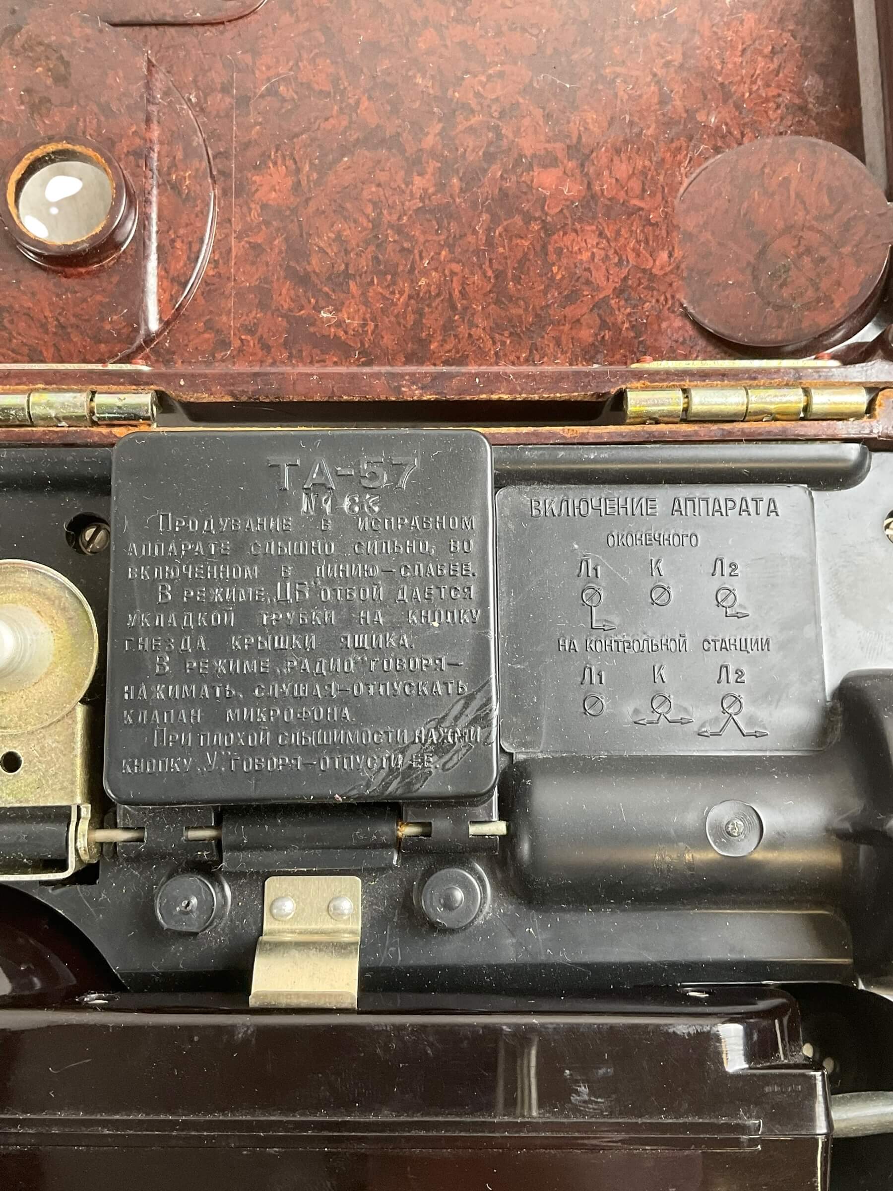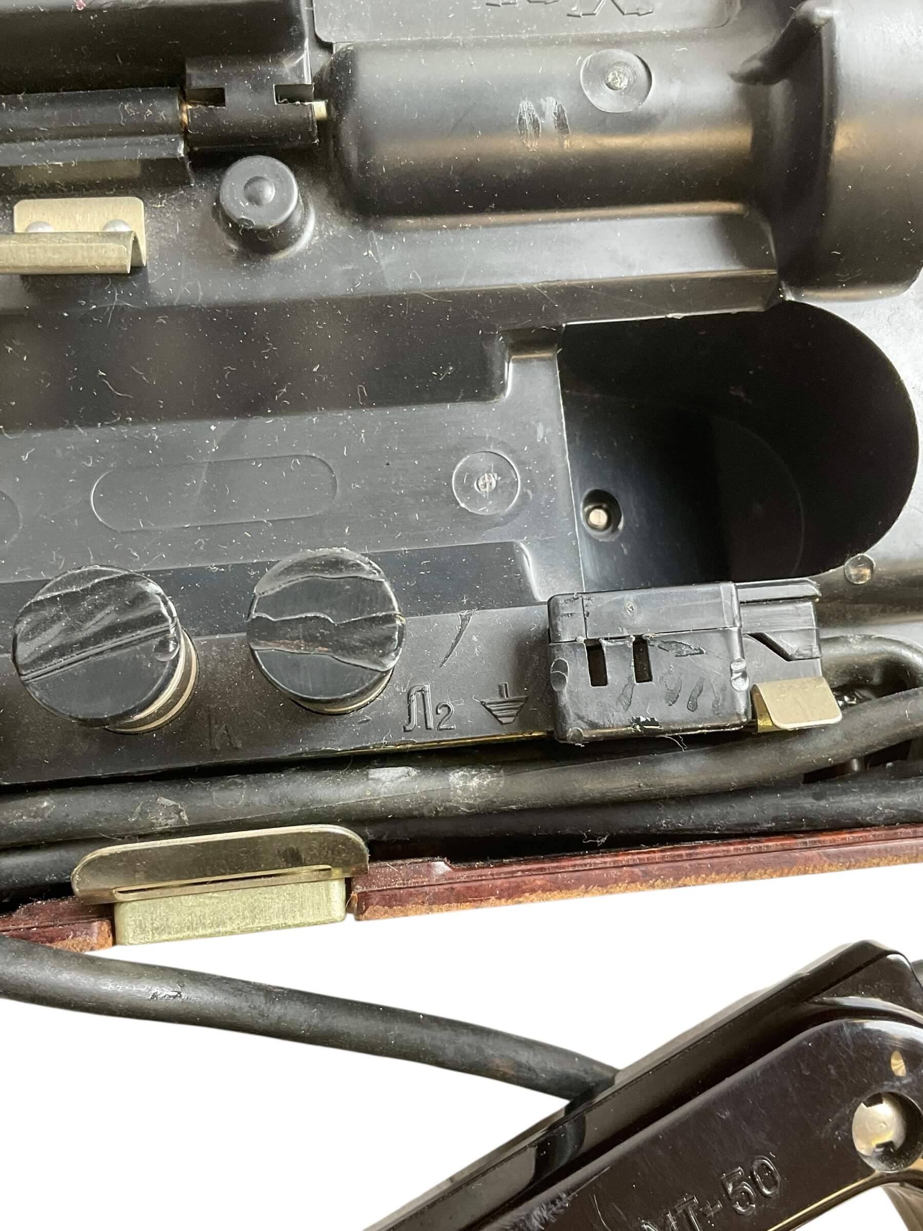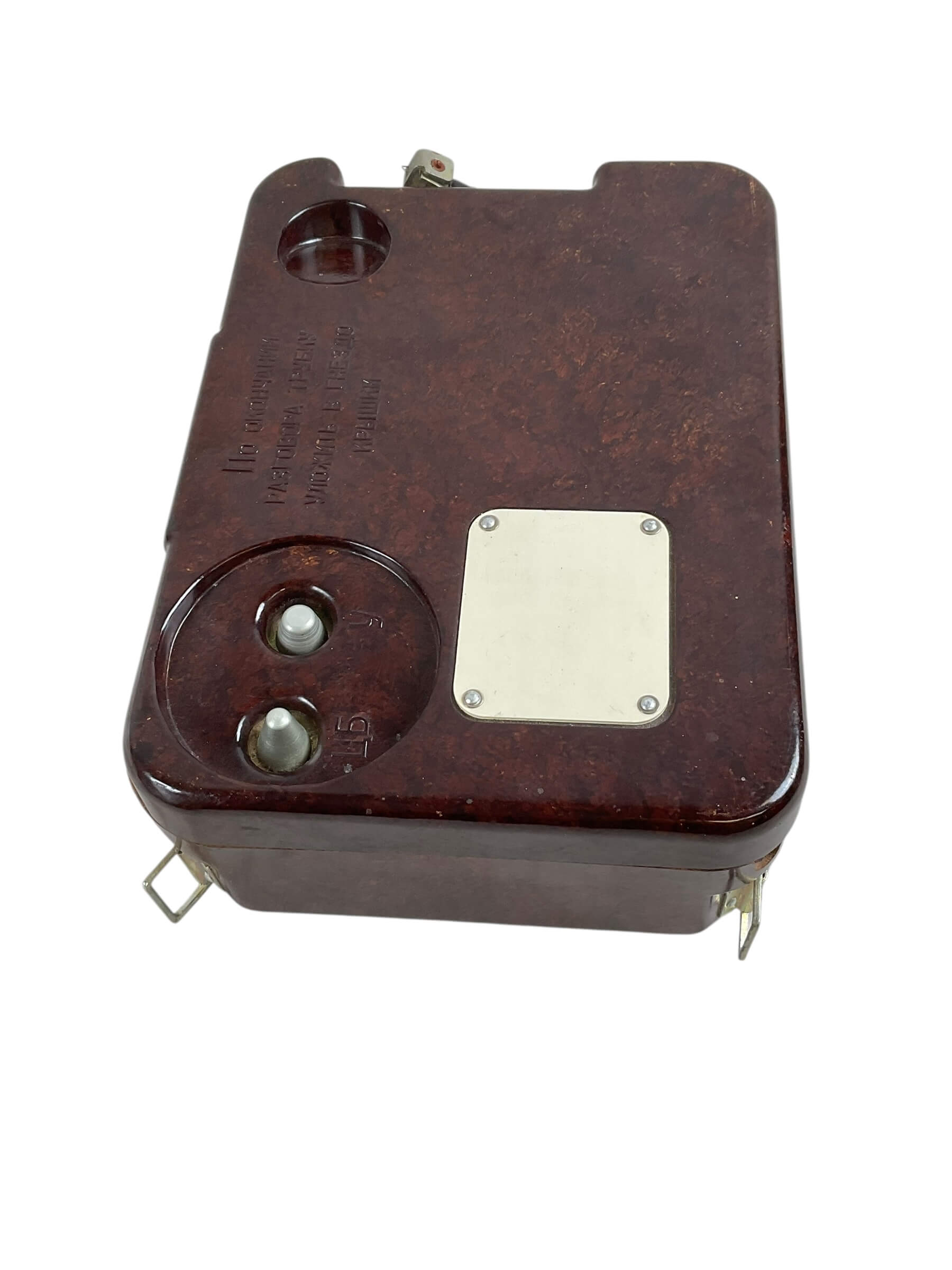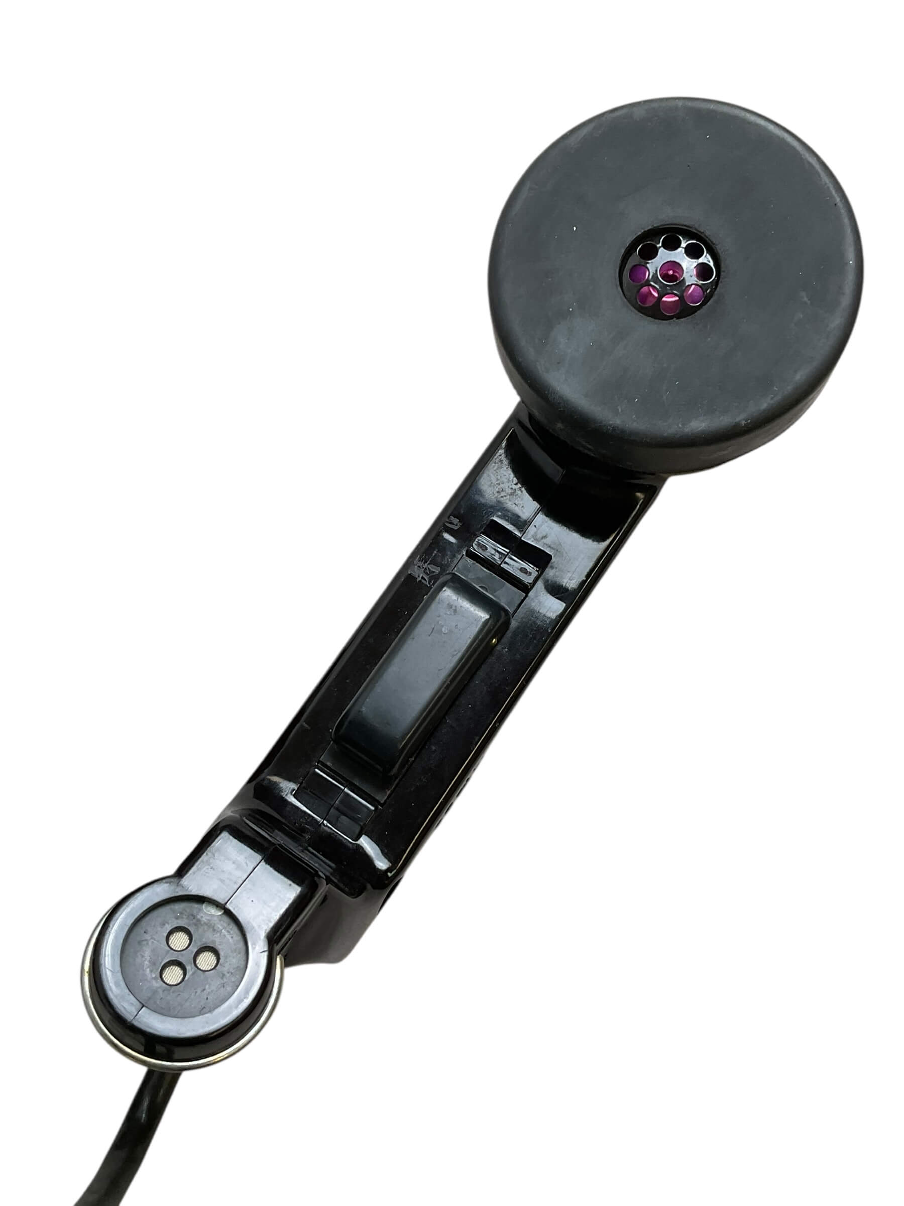 The ‘Russian Soviet TA 75 Field Phone’ is an antique military communication device, dating back to the Soviet era. This robust piece of equipment was designed for field communication during military operations. The TA 75 model is a wired system that functions without the need for a power source, a testament to its practical design. It is housed in a sturdy, olive green metallic case, which bears signs of its age and use, adding to its historical appeal. The device features a hand crank on the side to generate power, a removable handset, and rotary dial for operation. This field phone provides a fascinating glimpse into the past, representing the technological capabilities and strategic intricacies of the Russian Soviet military during the Cold War period. It remains a valuable collectible for military memorabilia enthusiasts and history buffs alike.