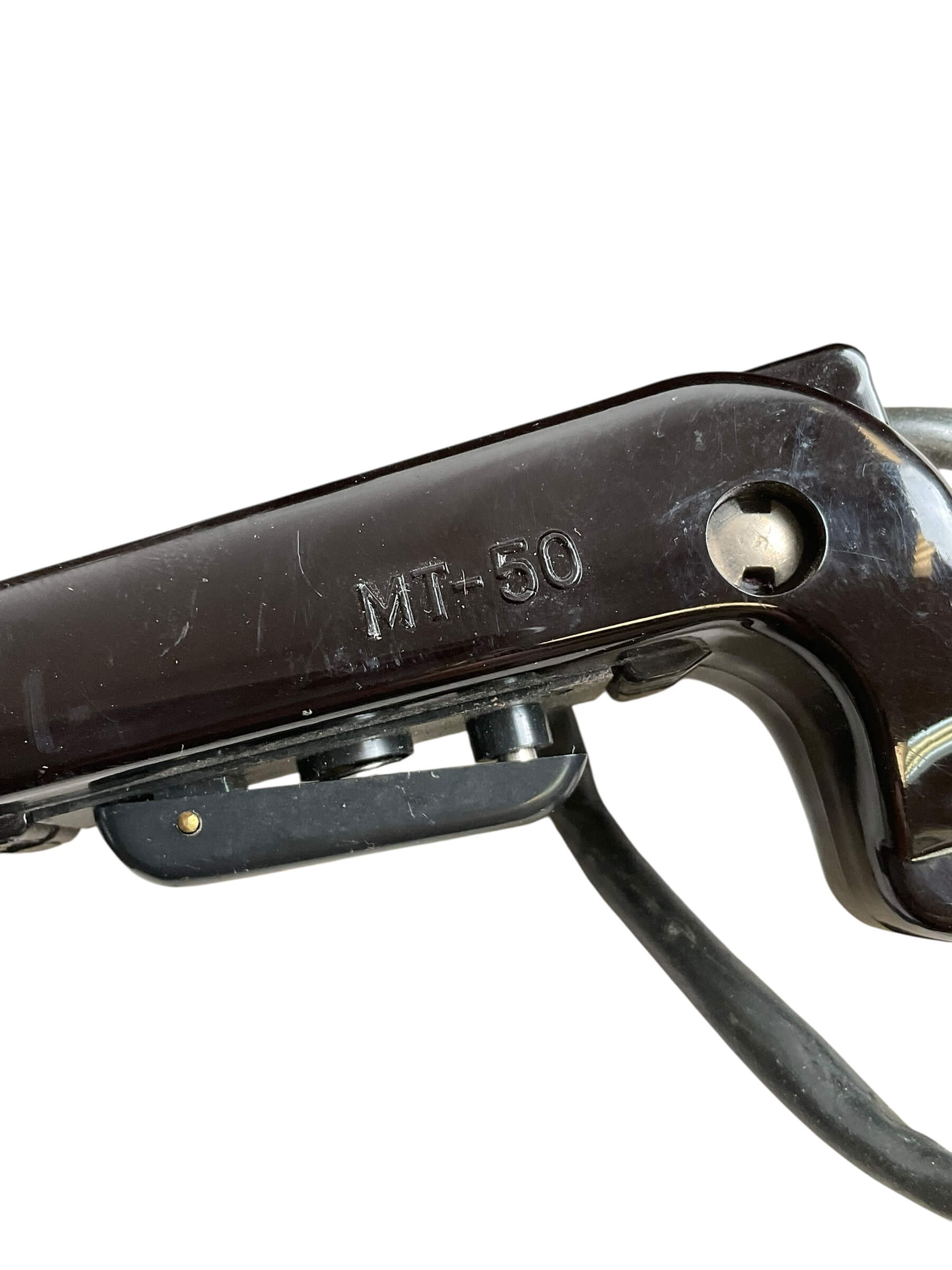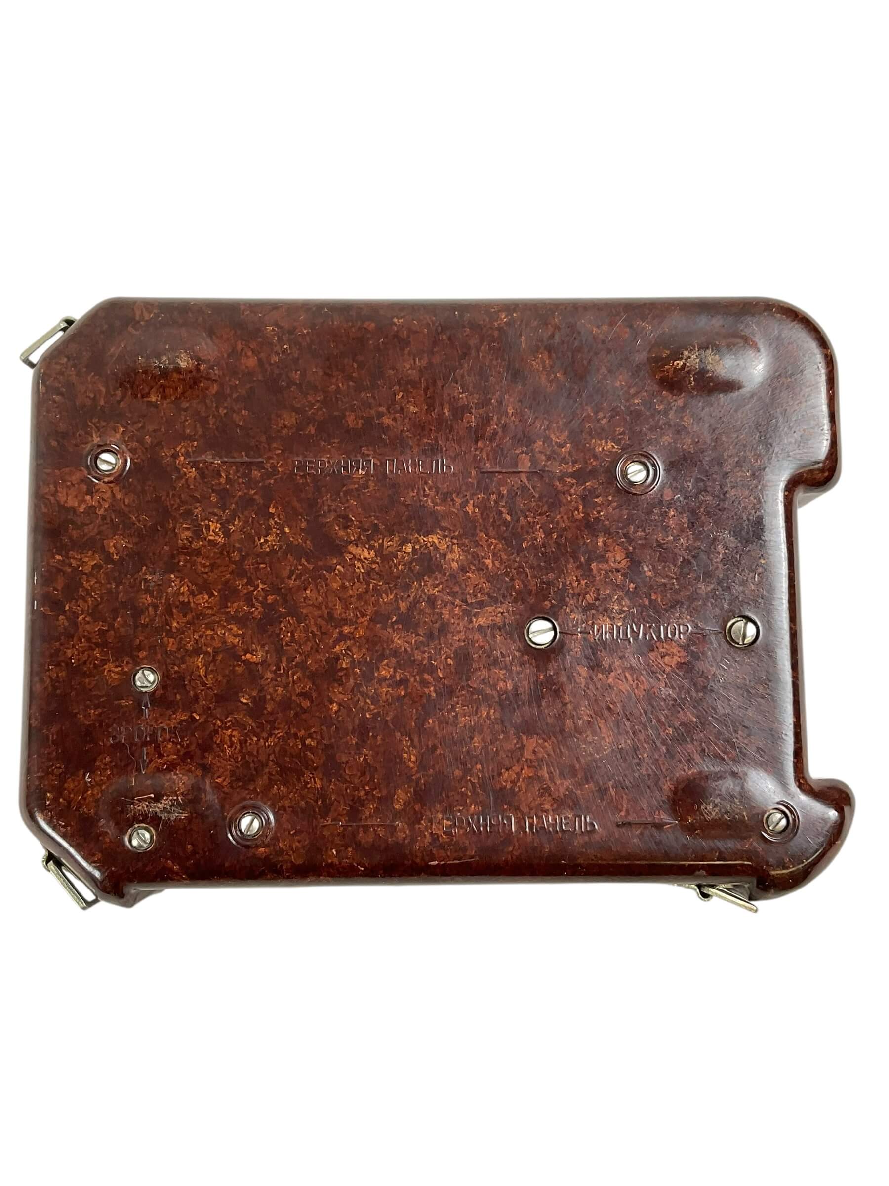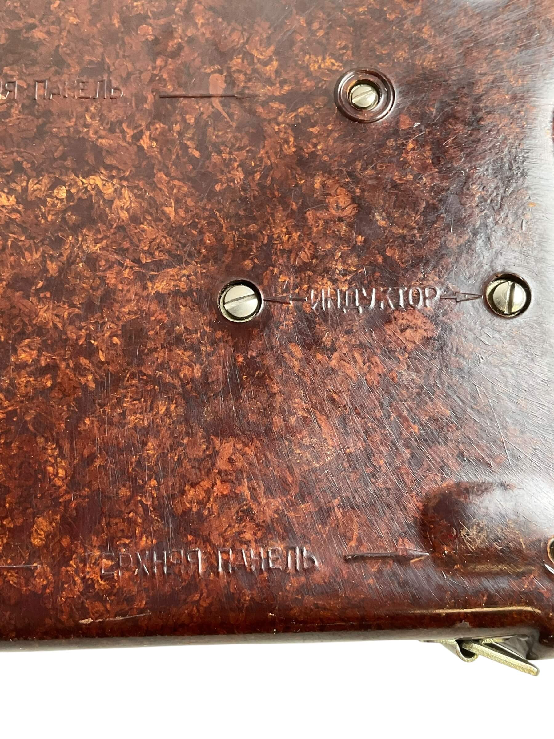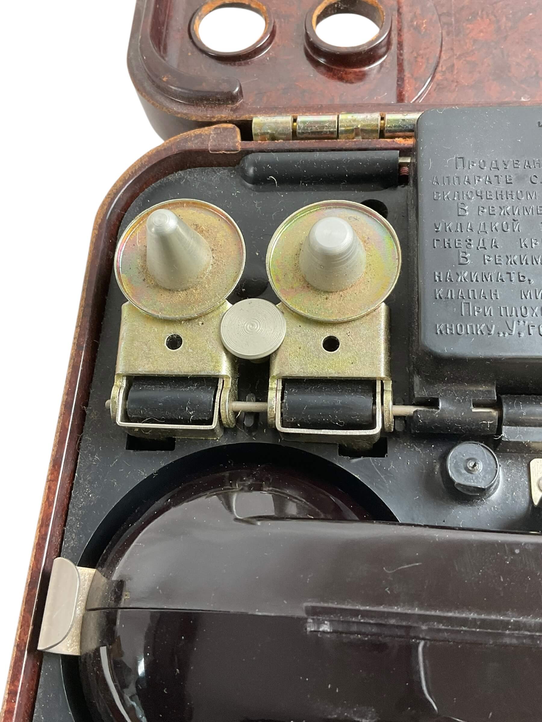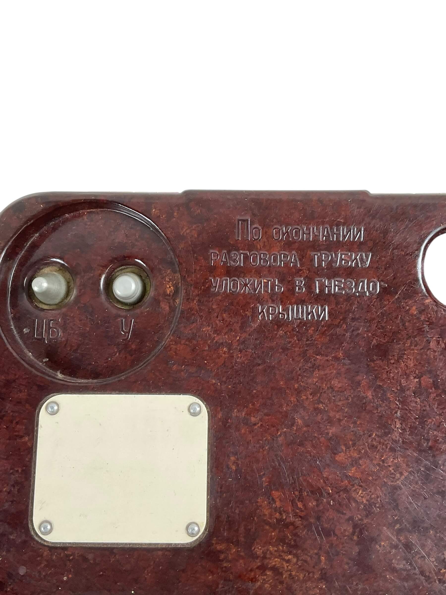 The ‘Russian Soviet TA 75 Field Phone’ is an antique military communication device, dating back to the Soviet era. This robust piece of equipment was designed for field communication during military operations. The TA 75 model is a wired system that functions without the need for a power source, a testament to its practical design. It is housed in a sturdy, olive green metallic case, which bears signs of its age and use, adding to its historical appeal. The device features a hand crank on the side to generate power, a removable handset, and rotary dial for operation. This field phone provides a fascinating glimpse into the past, representing the technological capabilities and strategic intricacies of the Russian Soviet military during the Cold War period. It remains a valuable collectible for military memorabilia enthusiasts and history buffs alike.