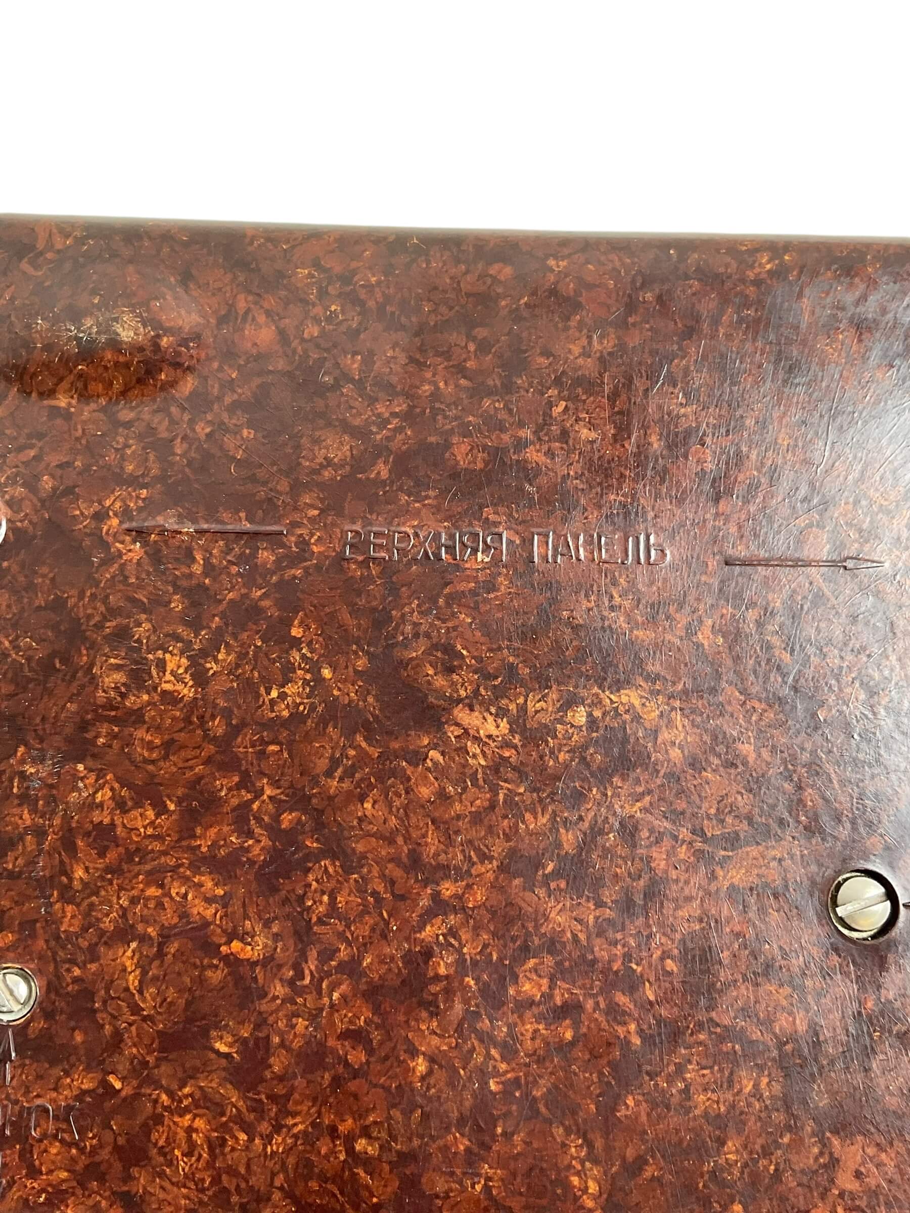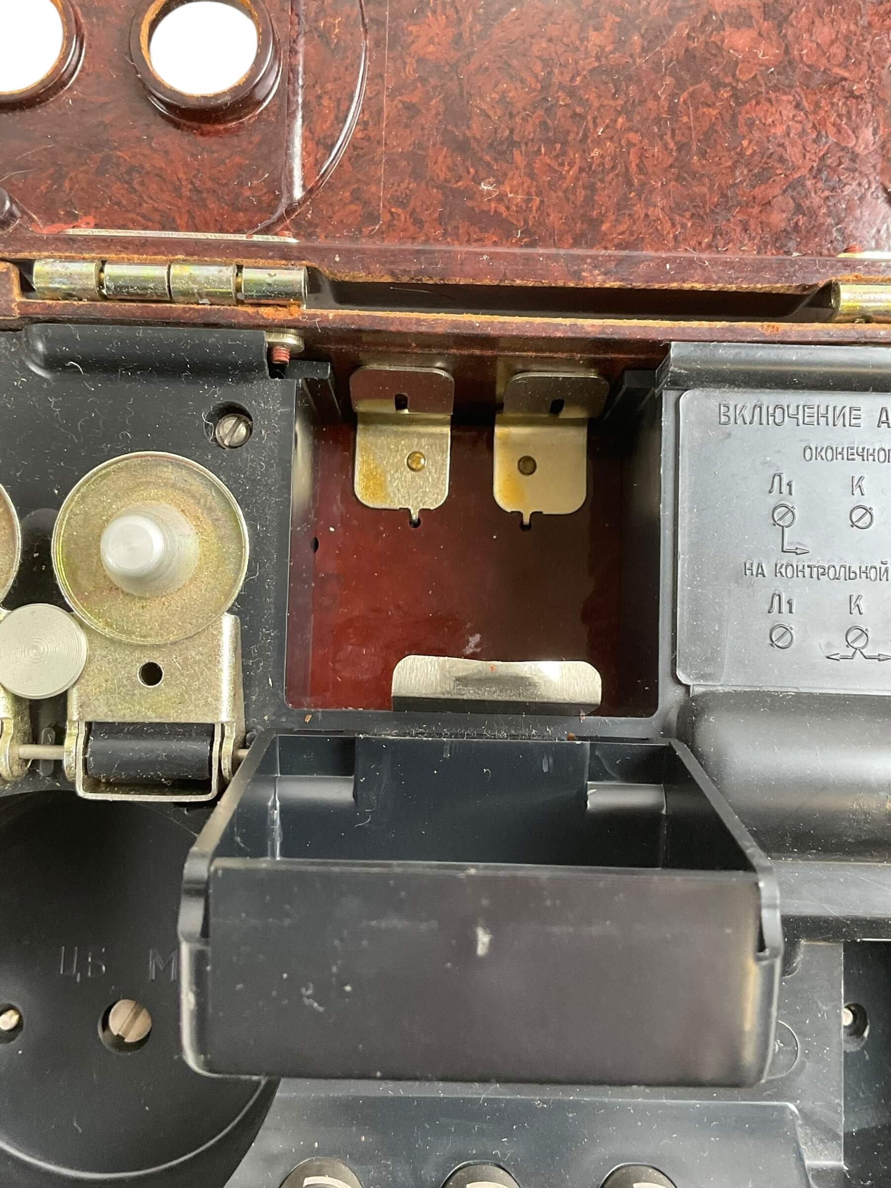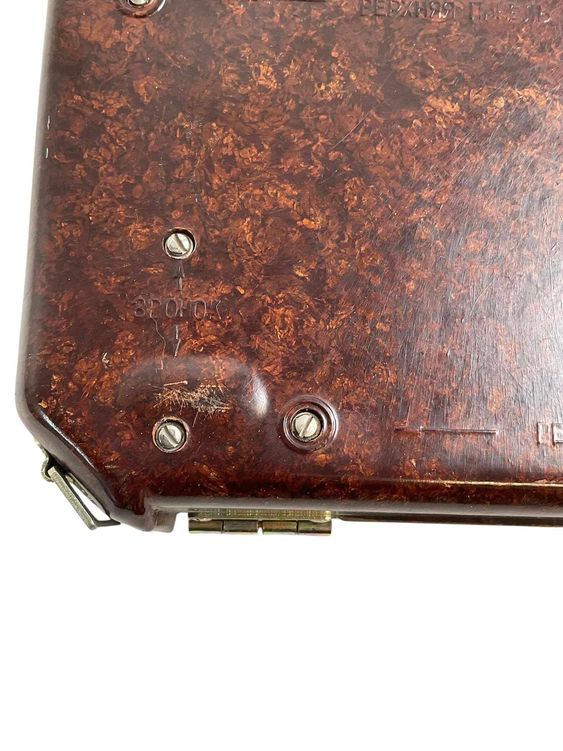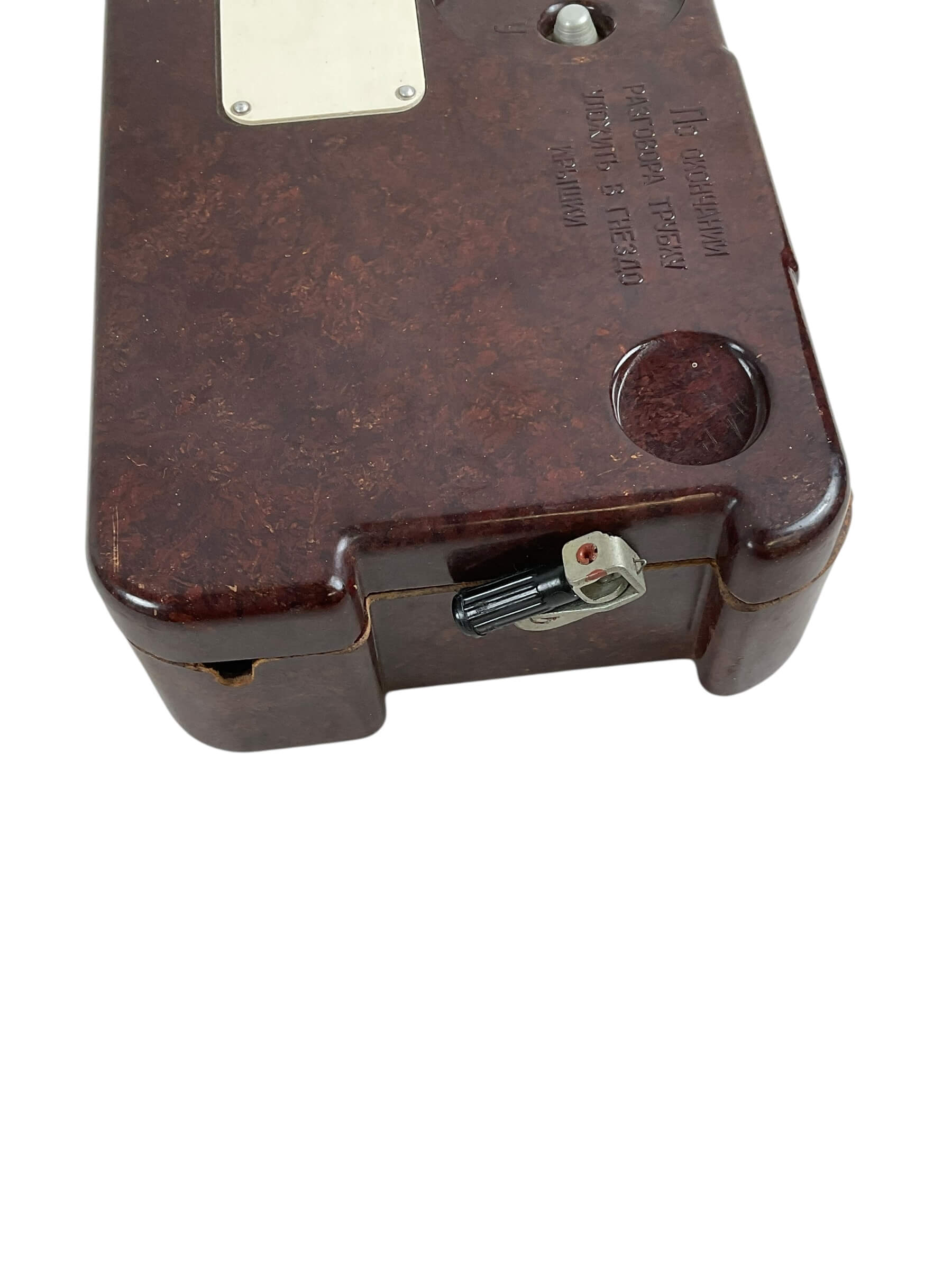 The ‘Russian Soviet TA 75 Field Phone’ is an antique military communication device, dating back to the Soviet era. This robust piece of equipment was designed for field communication during military operations. The TA 75 model is a wired system that functions without the need for a power source, a testament to its practical design. It is housed in a sturdy, olive green metallic case, which bears signs of its age and use, adding to its historical appeal. The device features a hand crank on the side to generate power, a removable handset, and rotary dial for operation. This field phone provides a fascinating glimpse into the past, representing the technological capabilities and strategic intricacies of the Russian Soviet military during the Cold War period. It remains a valuable collectible for military memorabilia enthusiasts and history buffs alike.