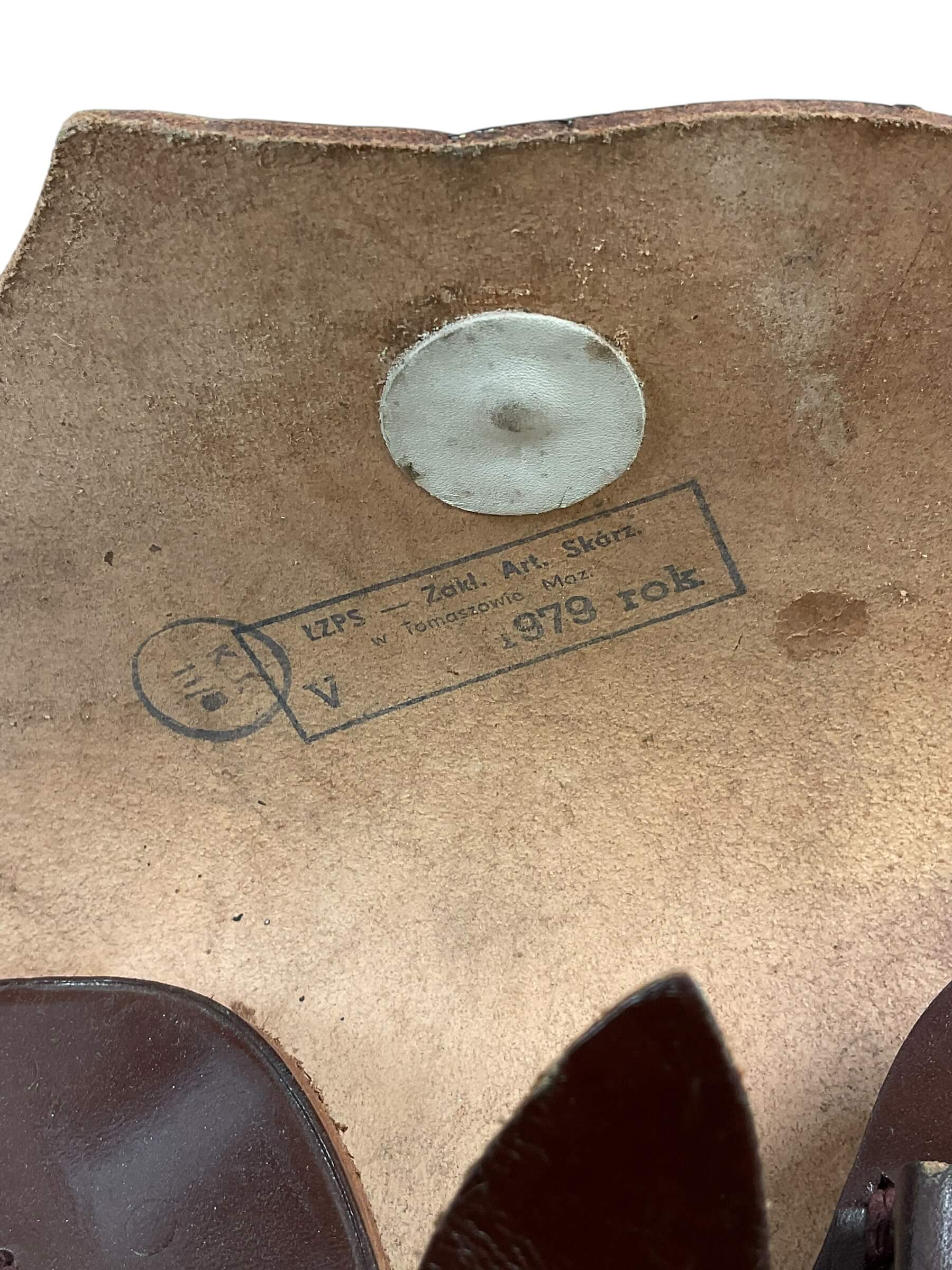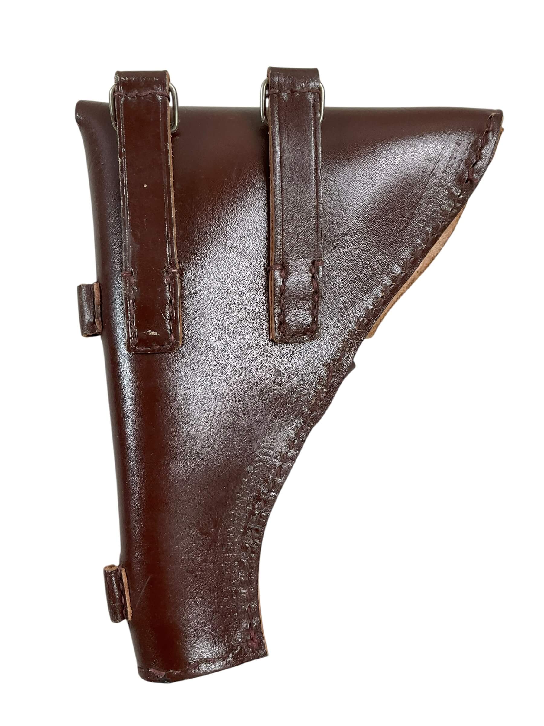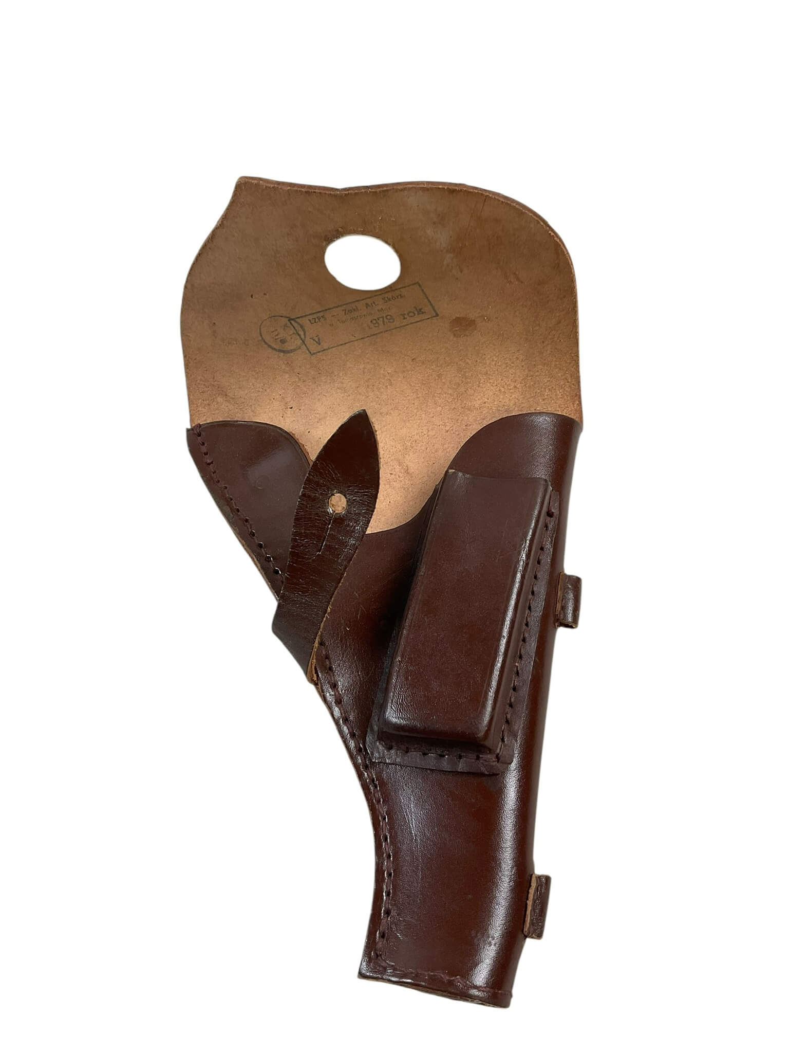 The Russian Soviet Tokarev TT33 Holster dated 1979 is a standard-issue sidearm holster produced for use with the TT33 Tokarev semi-automatic pistol, widely adopted by Soviet military and police forces during the mid-20th century. Constructed from durable brown leather, the holster is designed to house the pistol securely, with a flap cover and strap closure to protect the firearm from dust and moisture. This particular example was manufactured in 1979, reflecting late Cold War-era production methods and materials. The holster features an ammunition pouch affixed to the exterior, intended for carrying spare magazines, and standard belt loops for attachment to a uniform or web belt. Stamping or markings on the rear typically indicate the year of production and occasionally the manufacturer. The Tokarev TT33 and its accessories, such as this holster, remained in regular service with Soviet and Eastern Bloc military personnel well into the late 20th century.