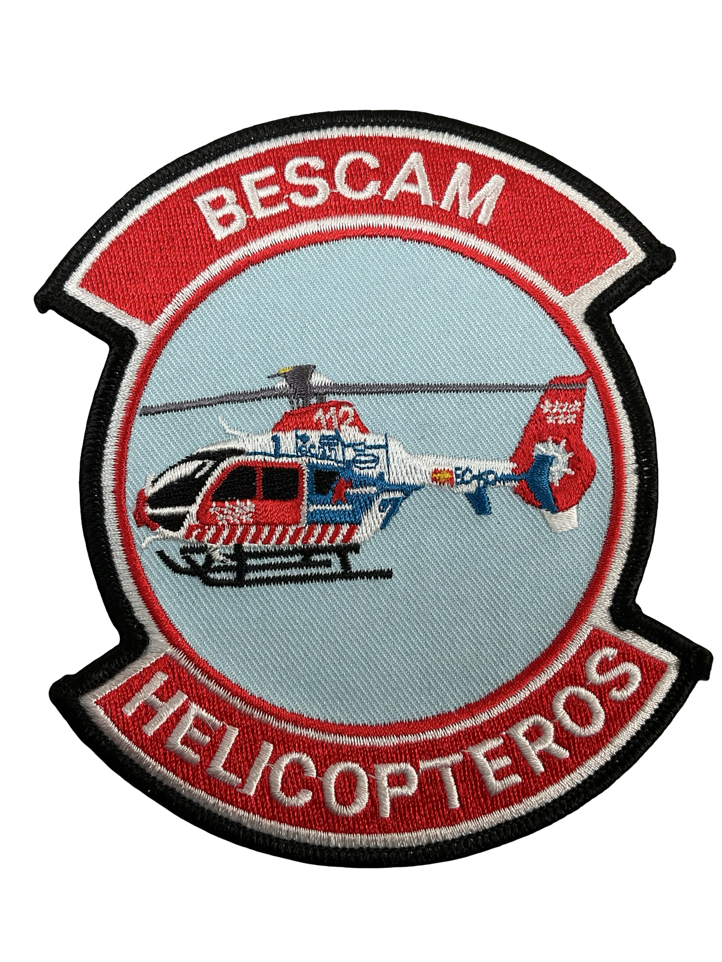 The Spanish BESCAM Helicopters Police Patch is an insignia associated with the BESCAM (Brigadas Especiales de Seguridad de la Comunidad de Madrid), a specialized police unit operating within the Community of Madrid, Spain. This patch specifically represents personnel assigned to the helicopter division, which provides aerial support for law enforcement operations, surveillance, and rapid response. The design typically incorporates symbols such as helicopter imagery, unit identifiers, and the official colors or emblems linked to BESCAM and Spanish police forces. Constructed with embroidered detailing, the patch is intended for attachment to uniforms, jackets, or equipment used by helicopter crew members. It reflects the unit’s role in maintaining security and public order through aerial operations. Items such as this patch serve as reference materials for collectors, historians, and those studying contemporary Spanish policing and its specialized units. The BESCAM helicopter division patch highlights the organizational structure and operational scope of modern law enforcement in Madrid.