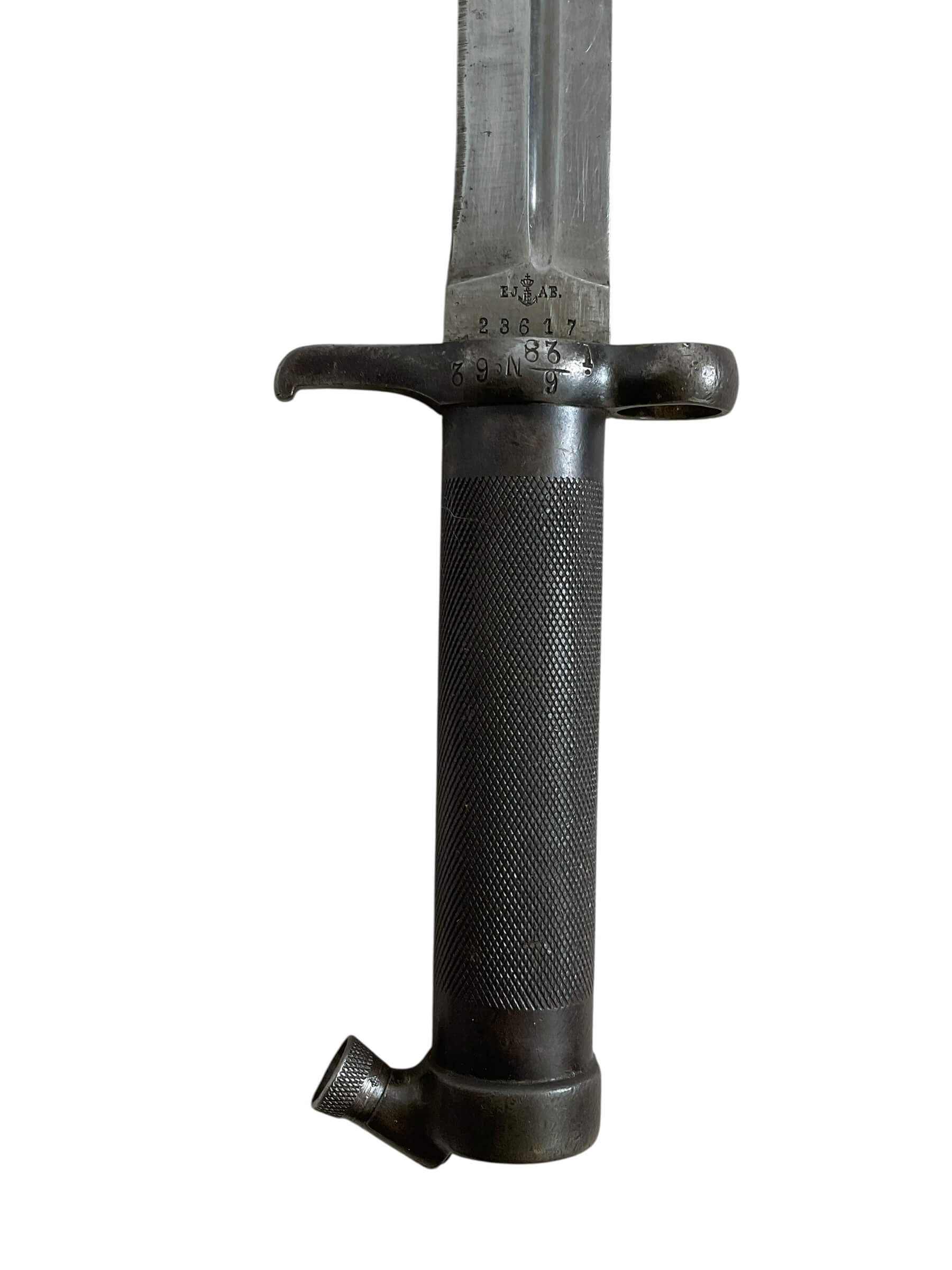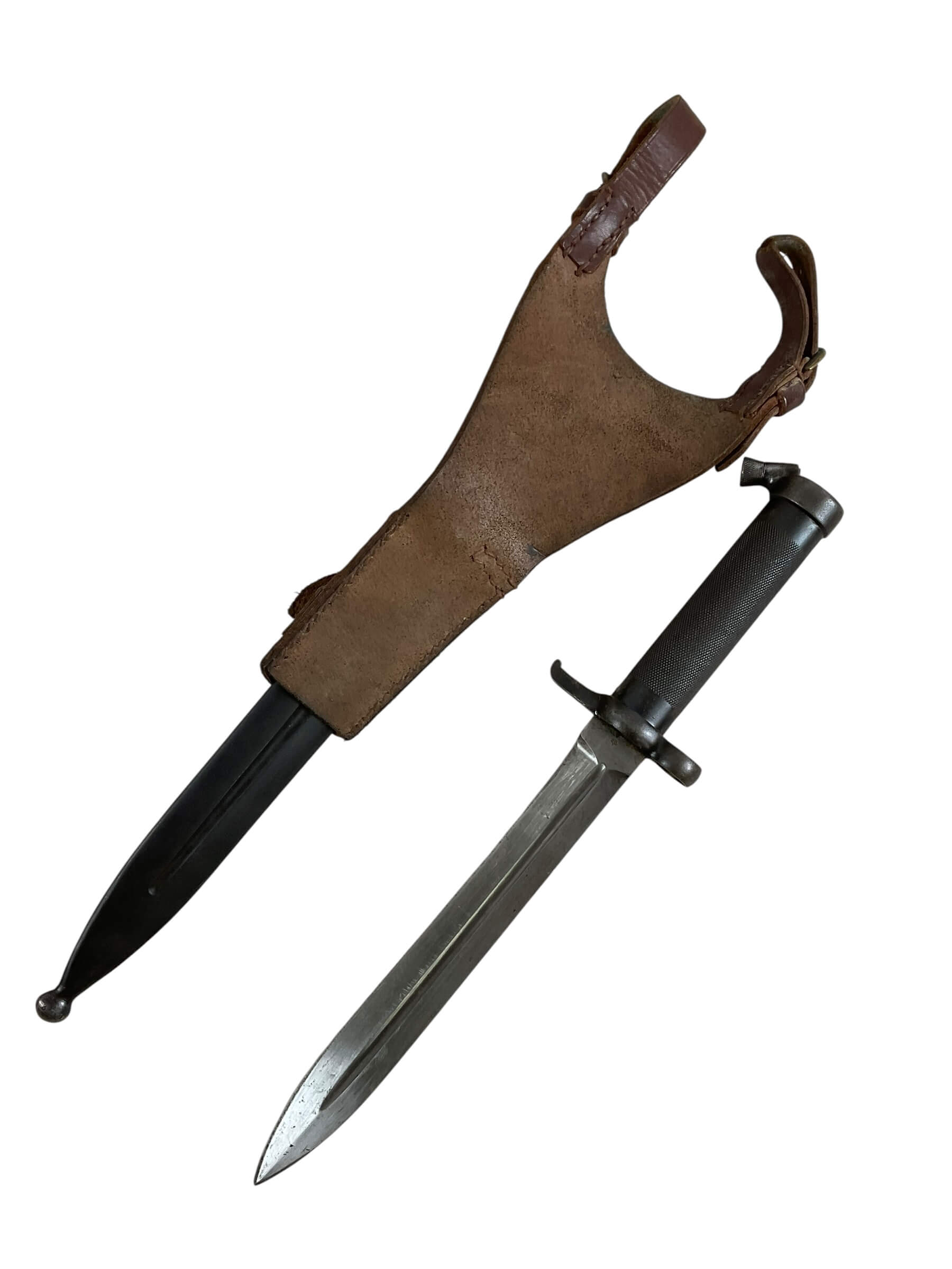 The Swedish M38 Bayonet with Leather Frog is a remarkable piece of military history. Originating from Sweden, this bayonet was primarily used during World War II, showcasing impeccable craftsmanship and durability. The M38 Bayonet is noted for its sturdy, single-edged blade that was designed for efficiency and durability in combat. This model comes with an accompanying leather frog, a holder used to carry the bayonet when it’s not attached to the rifle. The leather frog adds an authentic and rugged aesthetic to the bayonet, enhancing its historic appeal. While it carries significant historical value, the Swedish M38 Bayonet with Leather Frog also stands as a collector’s item for enthusiasts of military memorabilia, offering a tangible connection to the past. Its robust construction and unique design make it a standout piece in any collection.
