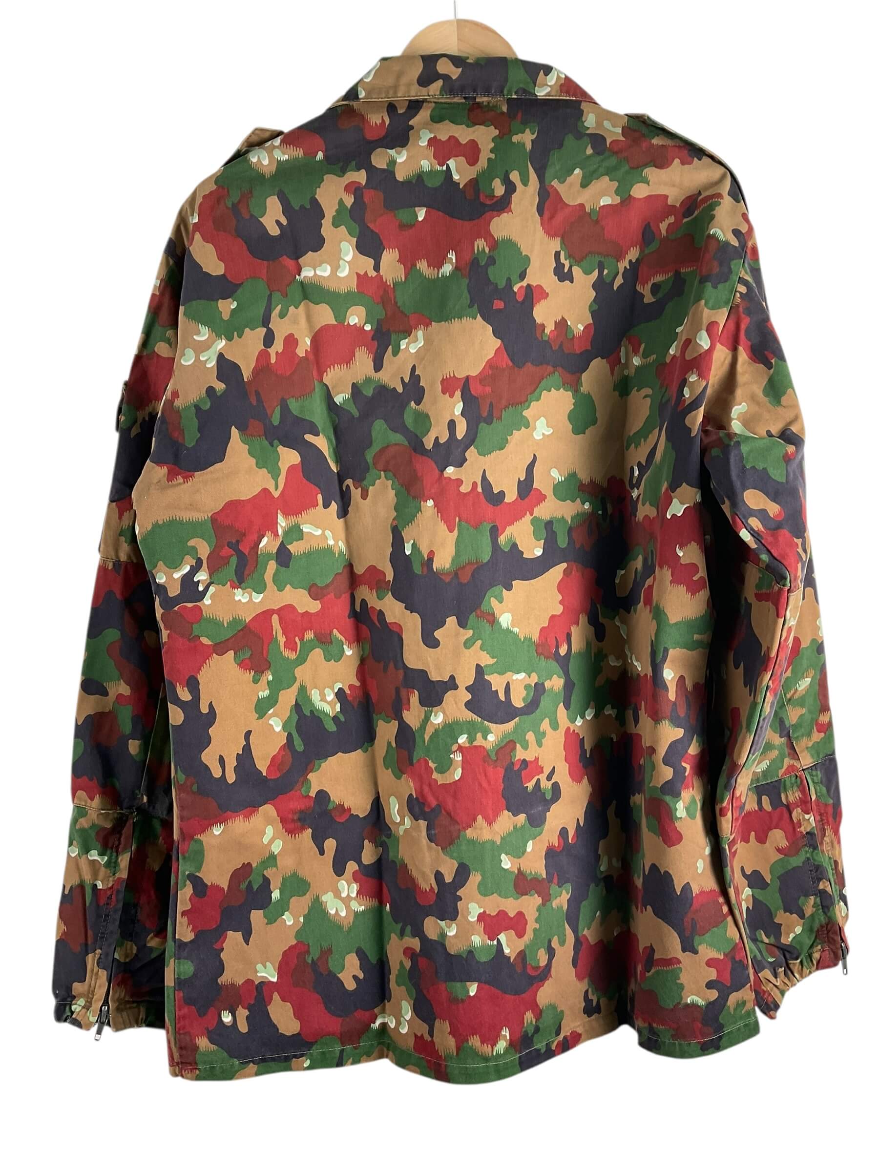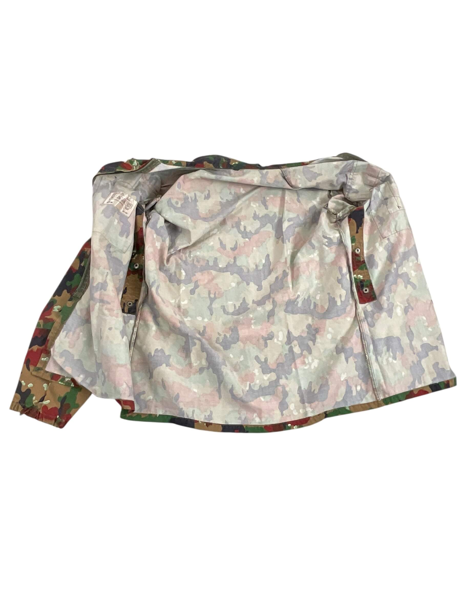 The Swiss Alpenflage Camouflage Shirt Size 84/86 is an authentic piece of military clothing. This distinctive, multi-coloured patterned shirt is synonymous with the Swiss army, specifically designed for alpine environments. It’s noted for its durable fabric, roomy fit, and storage pockets, suitable for outdoor activities.