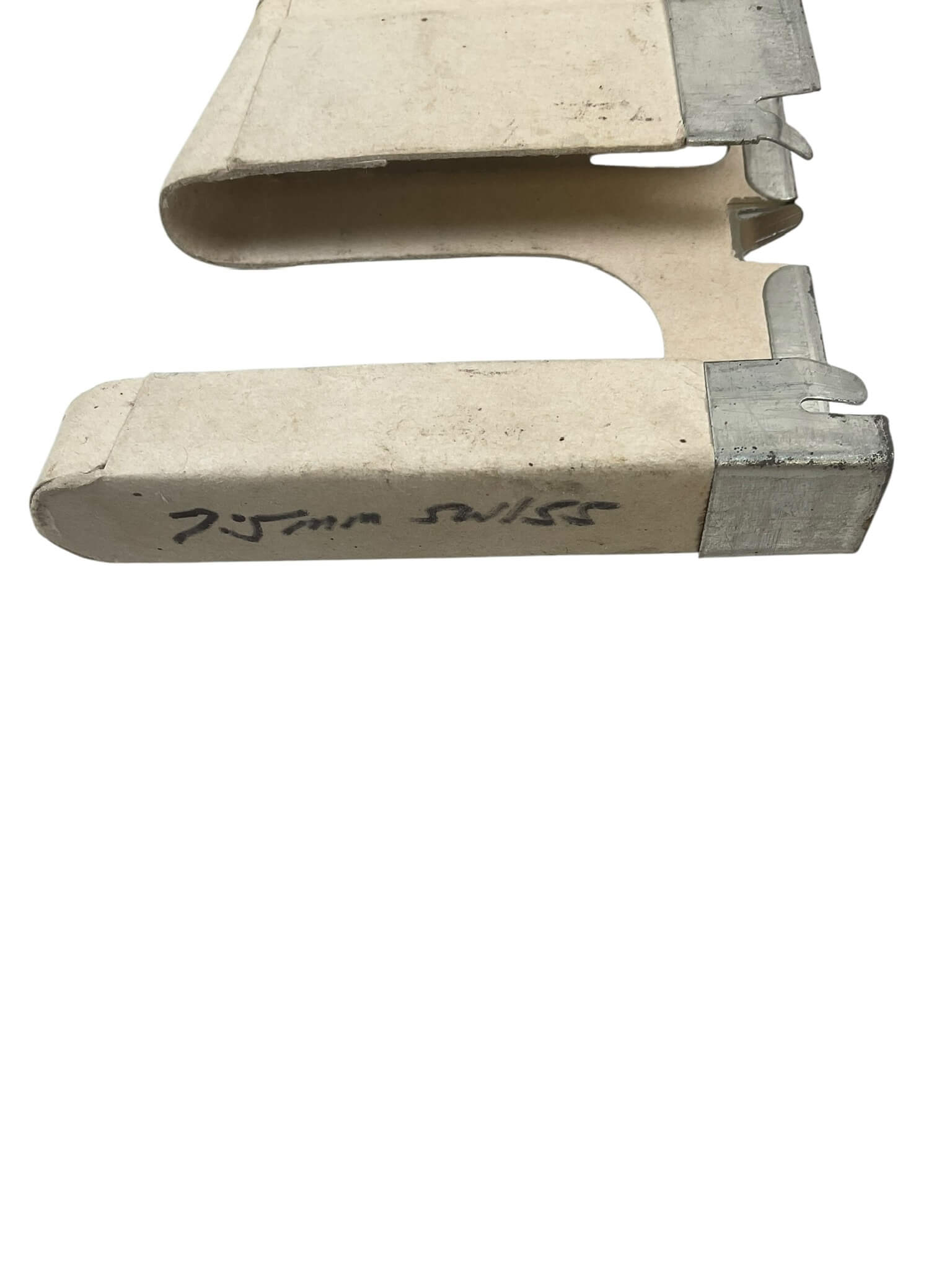 The Swiss Charger Clip 7.5 x 55mm K31 is a military firearm accessory designed for use with the Swiss Schmidt-Rubin K31 rifle. Manufactured for the Swiss armed forces, this charger clip is constructed from durable metal and is intended to hold five rounds of 7.5x55mm Swiss ammunition. Its primary function is to facilitate faster and more efficient reloading of the K31 rifle by allowing the user to insert a full complement of cartridges directly into the magazine in a single motion. The charger clip features a simple, utilitarian design typical of Swiss military equipment from the mid-20th century. These clips played an important logistical role in the rapid re-arming of soldiers during training and active service. The Swiss K31 rifle and associated accessories, including the charger clip, remain of interest to collectors, historians, and military enthusiasts for their engineering quality and historical significance.