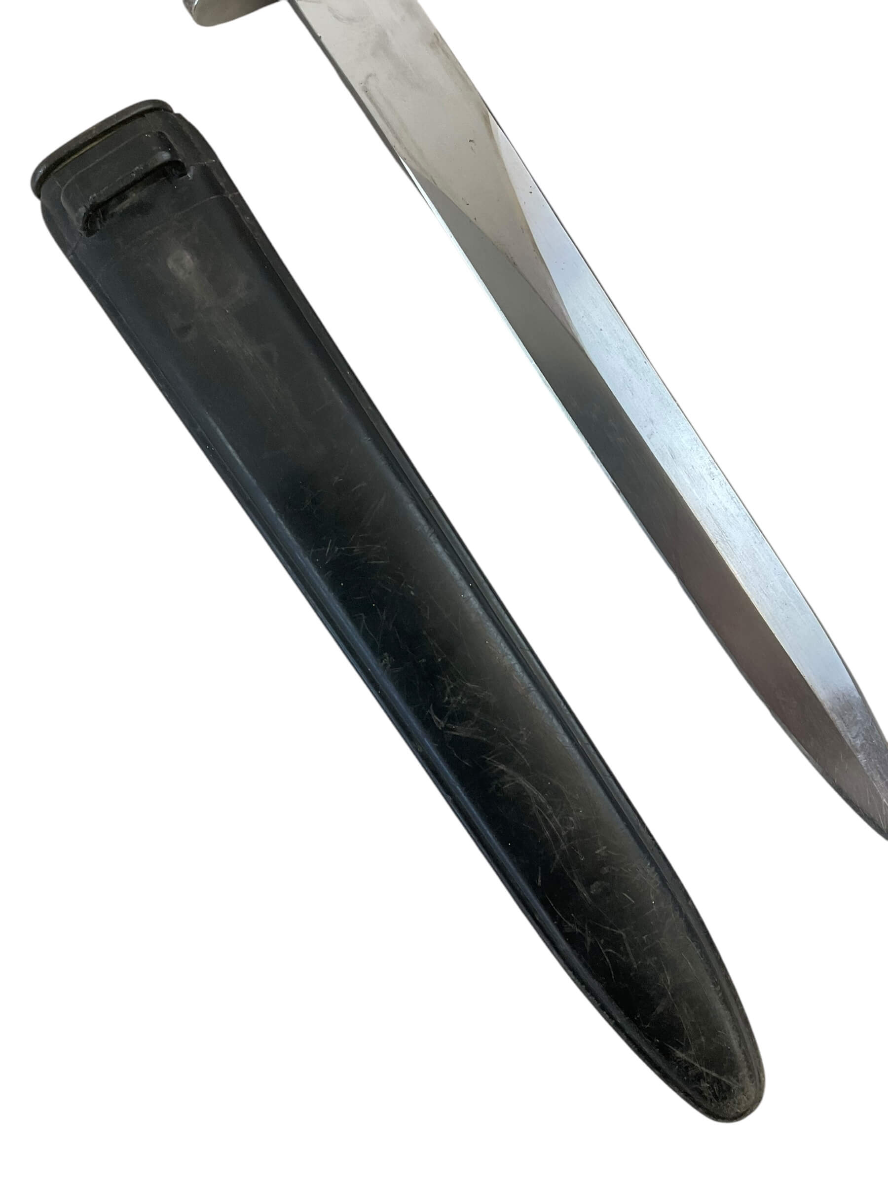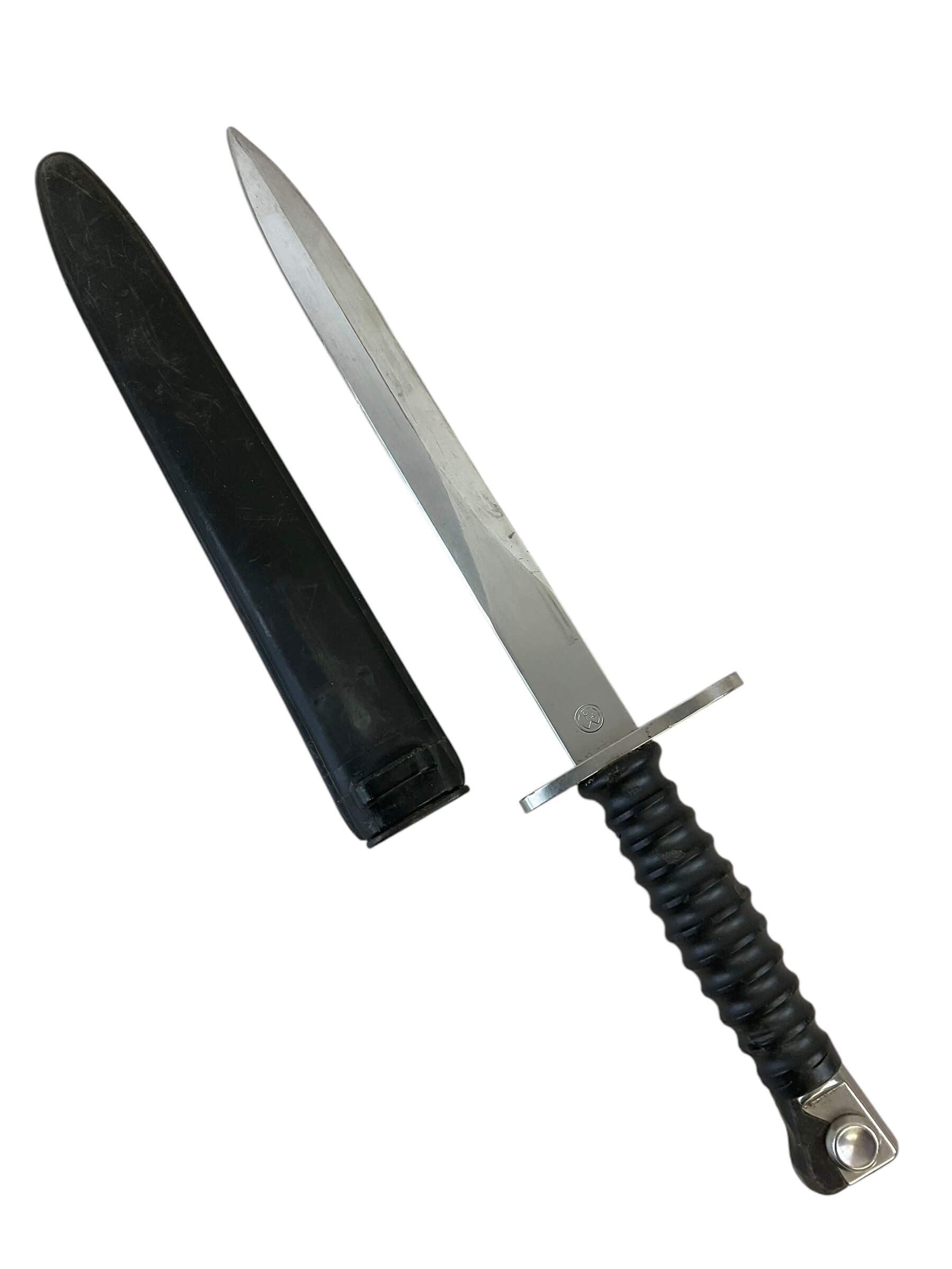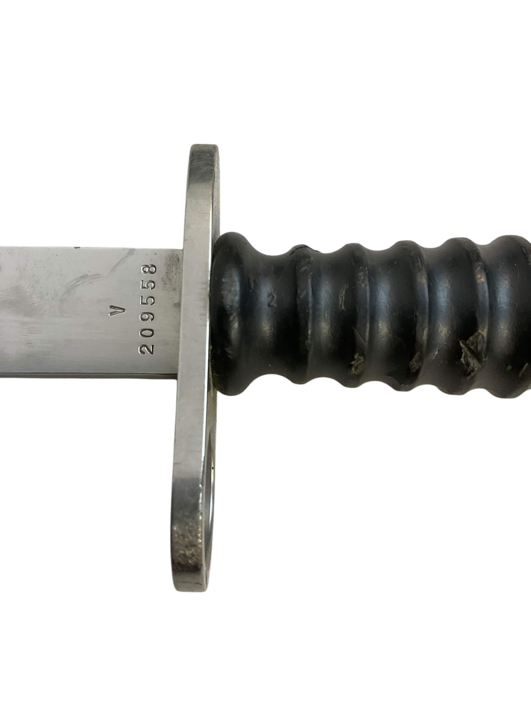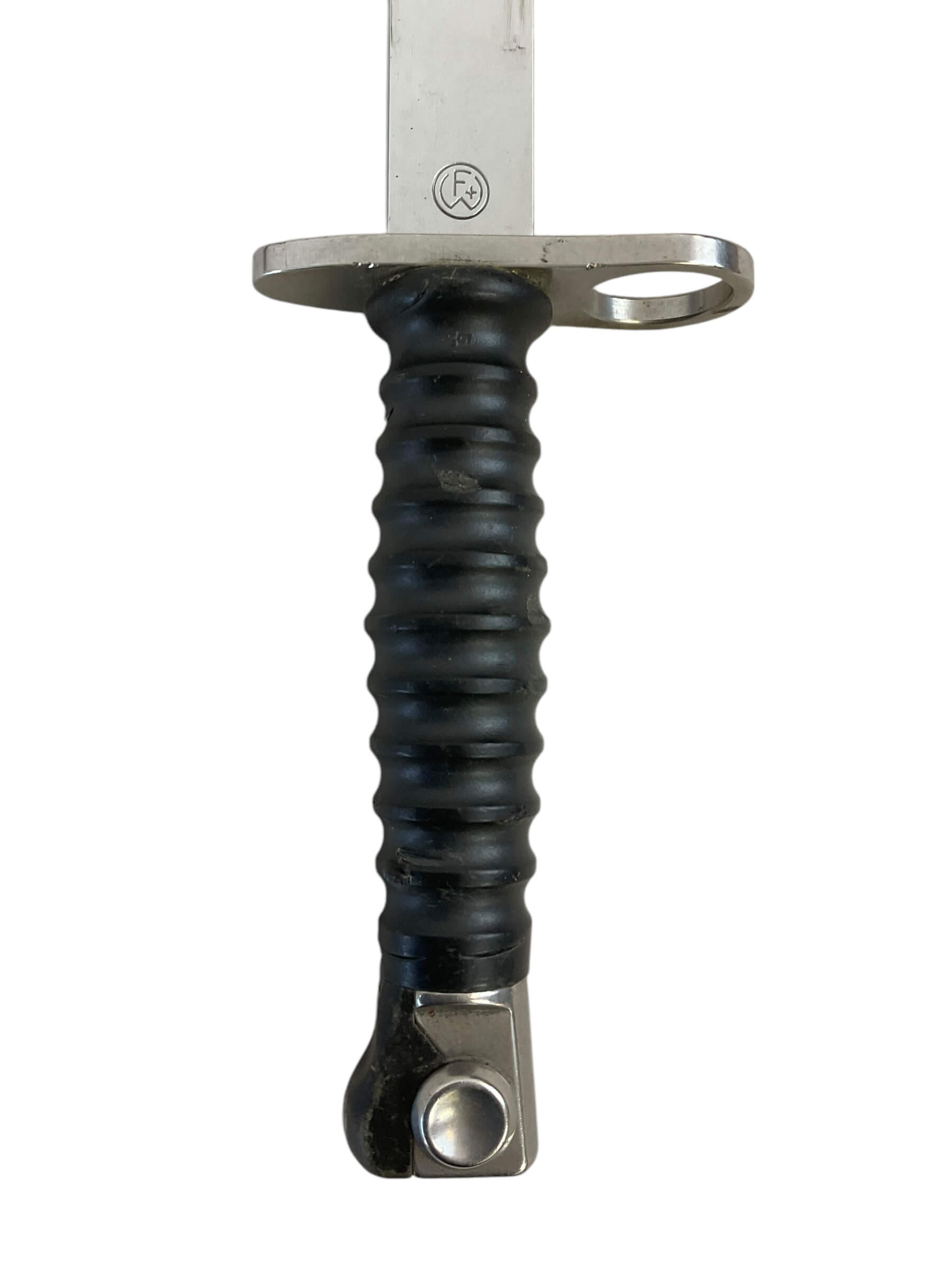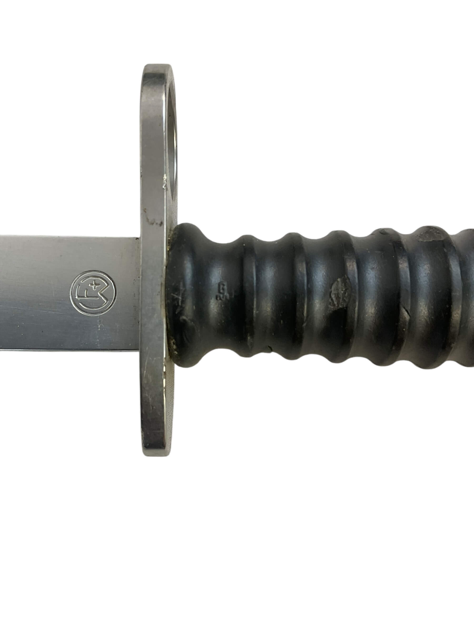 The Swiss M1957 Bayonet With Scabbard is a captivating piece of military history that hails from the mid-20th century. Known for its superior Swiss craftsmanship, this bayonet is constructed with a single-edged, full tang blade made from high-quality carbon steel, offering remarkable strength and durability. The handle is made from sturdy Bakelite, ensuring a firm grip during use. The M1957 bayonet is unique for its “sawback” design on the spine of the blade, which was used by soldiers for various utility purposes. The bayonet comes with its original metal scabbard that provides optimal protection and ease of carrying. This M1957 bayonet is not just a weapon but also a collector’s item, reflecting the historical nuances of the Swiss Army during the 1950s.