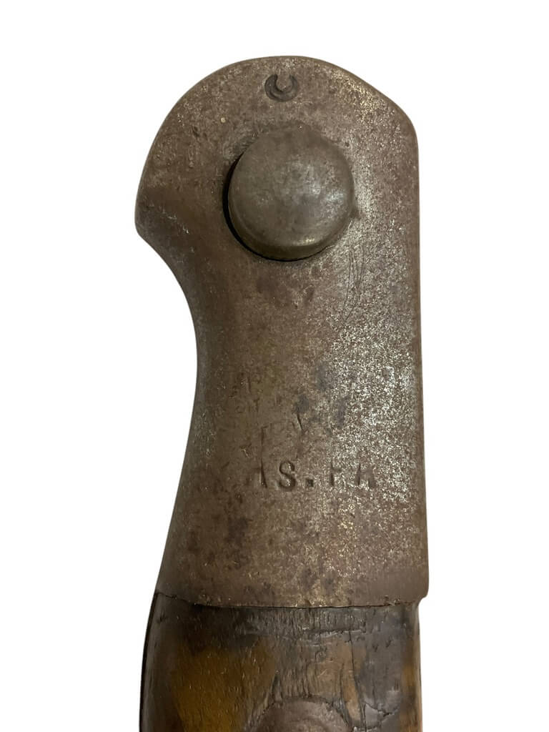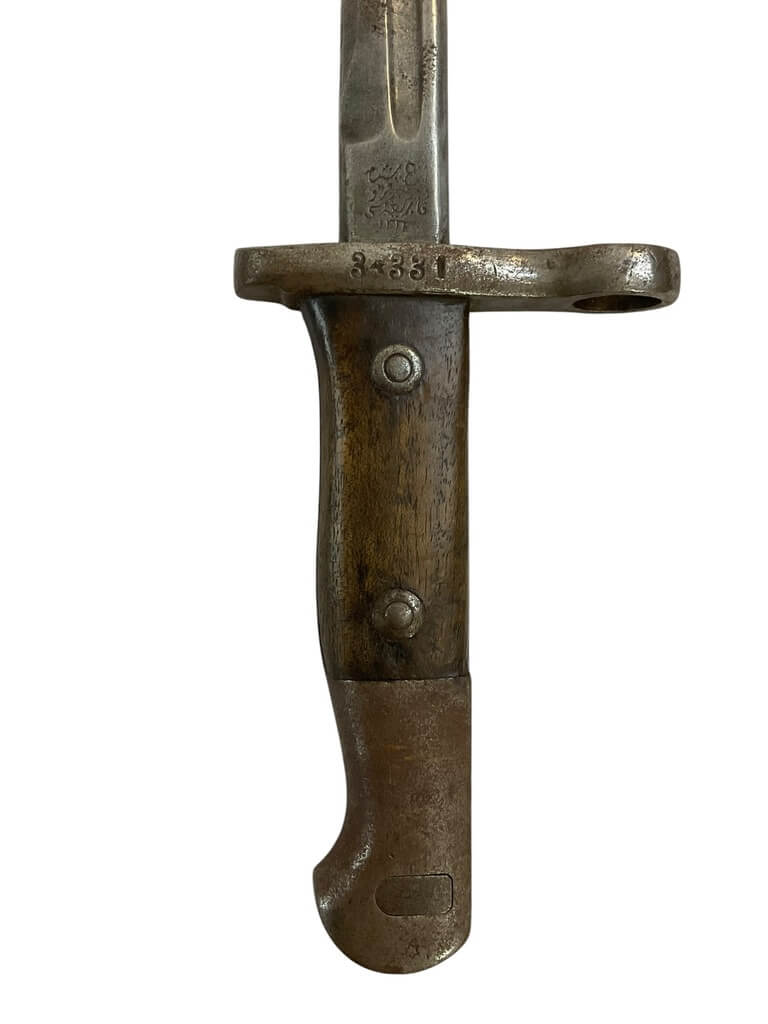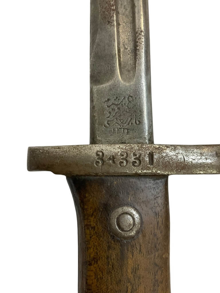 Experience a taste of rich, military history with this authentic Turkish 1903 Bayonet with Scabbard. Crafted over a century ago, this artifact offers an original representation of tactical weaponry of the time. The blade, forged from high-quality steel, shows its historic battle scars with grace, lending it a strong and weathered demeanor. Its substantial handle fits comfortably in your grasp, embodying function plus utility. The accompanying scabbard is perfectly fitted to the bayonet, telling a shared story of past combats. This bayonet is not merely a piece of equipment, it’s an enduring testament to Turkish military history, making it a priceless possession for collectors and history enthusiasts. Dive into a journey of historical discovery with this emblematic Turkish 1903 Bayonet with Scabbard.
