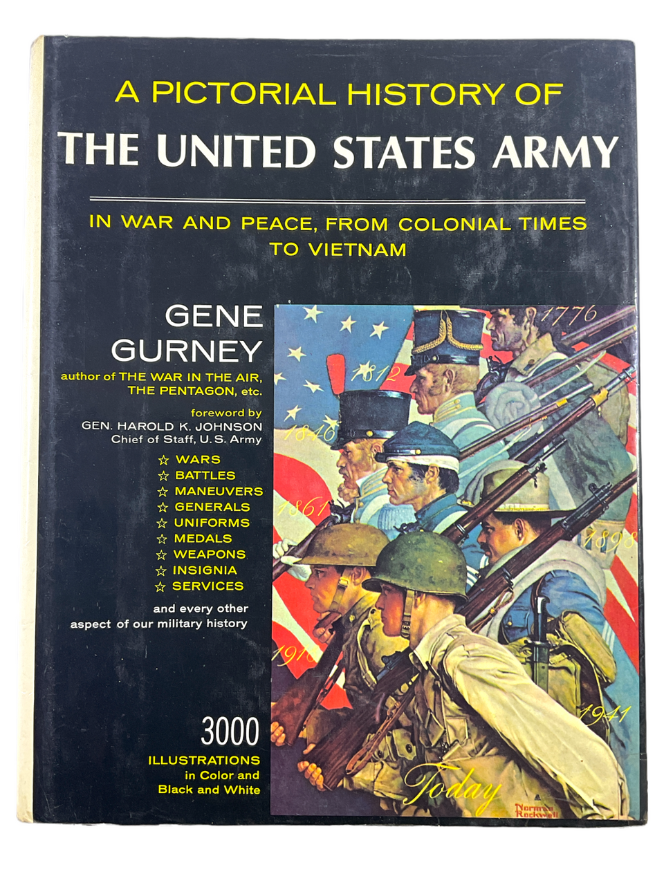 United States Army Pictorial History Colonial Times to Vietnam HC Reference Book. Total of 814 pages with lots of photos and information The “United States Army Pictorial History Colonial Times to Vietnam HC Reference Book” is an extensive visual and textual journey through the storied past of the U.S. Army. Spanning a remarkable 814 pages, this hardcover volume is richly adorned with an abundance of photographs and detailed information that vividly illustrates the evolution of the Army from its inception during colonial times up to the intricate complexities of the Vietnam War. This reference book serves as both an authoritative resource and a visual delight, making it an invaluable asset for historians, military enthusiasts, and educational institutions alike. By exploring pivotal battles, significant military figures, and the changing dynamics of warfare, readers gain a comprehensive understanding of the United States Army’s role in shaping the nation’s history. This exhaustive compilation stands as a tribute to the legacy and enduring spirit of the men and women who have served over the centuries.