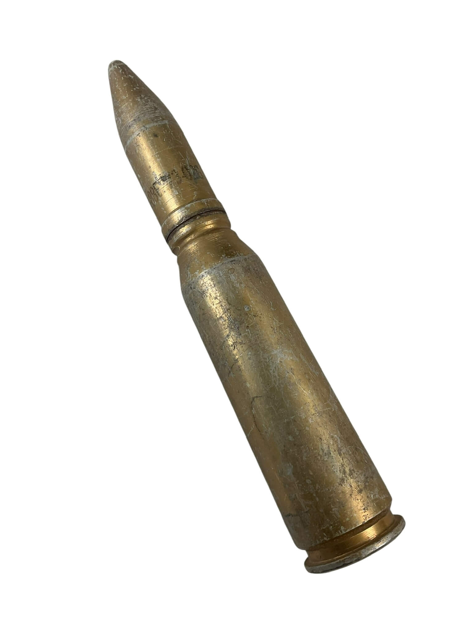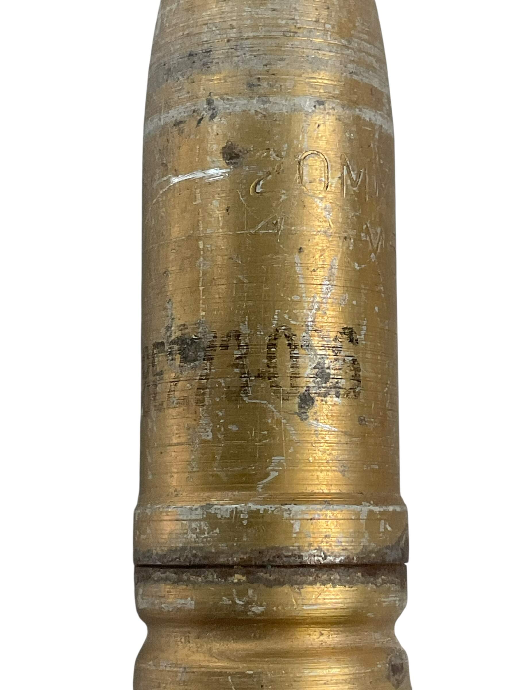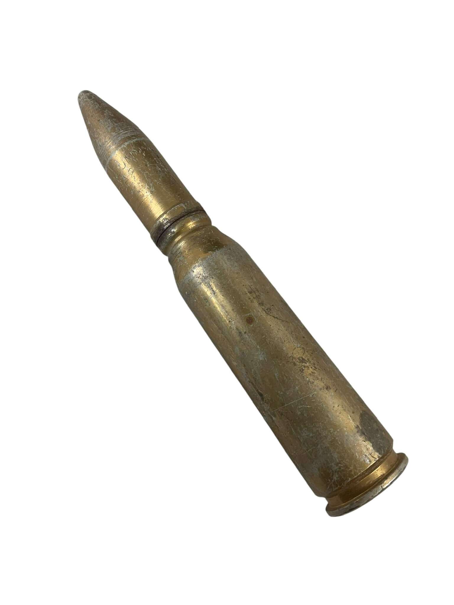 The US 20mm Dummy Round INERT is a non-functional replica of standard-issue 20mm ammunition, typically used for training or display purposes. Manufactured to replicate the size, weight, and appearance of live 20mm rounds, this inert example lacks any explosive or pyrotechnic components and cannot be fired. Such dummy rounds are commonly employed in military training exercises to familiarize personnel with the handling, loading, and unloading of real ammunition under safe conditions. The 20mm caliber has seen widespread use in various types of automatic cannons, including anti-aircraft guns and aircraft-mounted armaments, throughout the 20th century. The inert training round features appropriate markings, color, and construction materials consistent with U.S. military specifications. It serves as a reference specimen for collectors, historians, or educational institutions interested in military ordnance. This item is intended for display or instructional use only and is not capable of discharging any projectile.