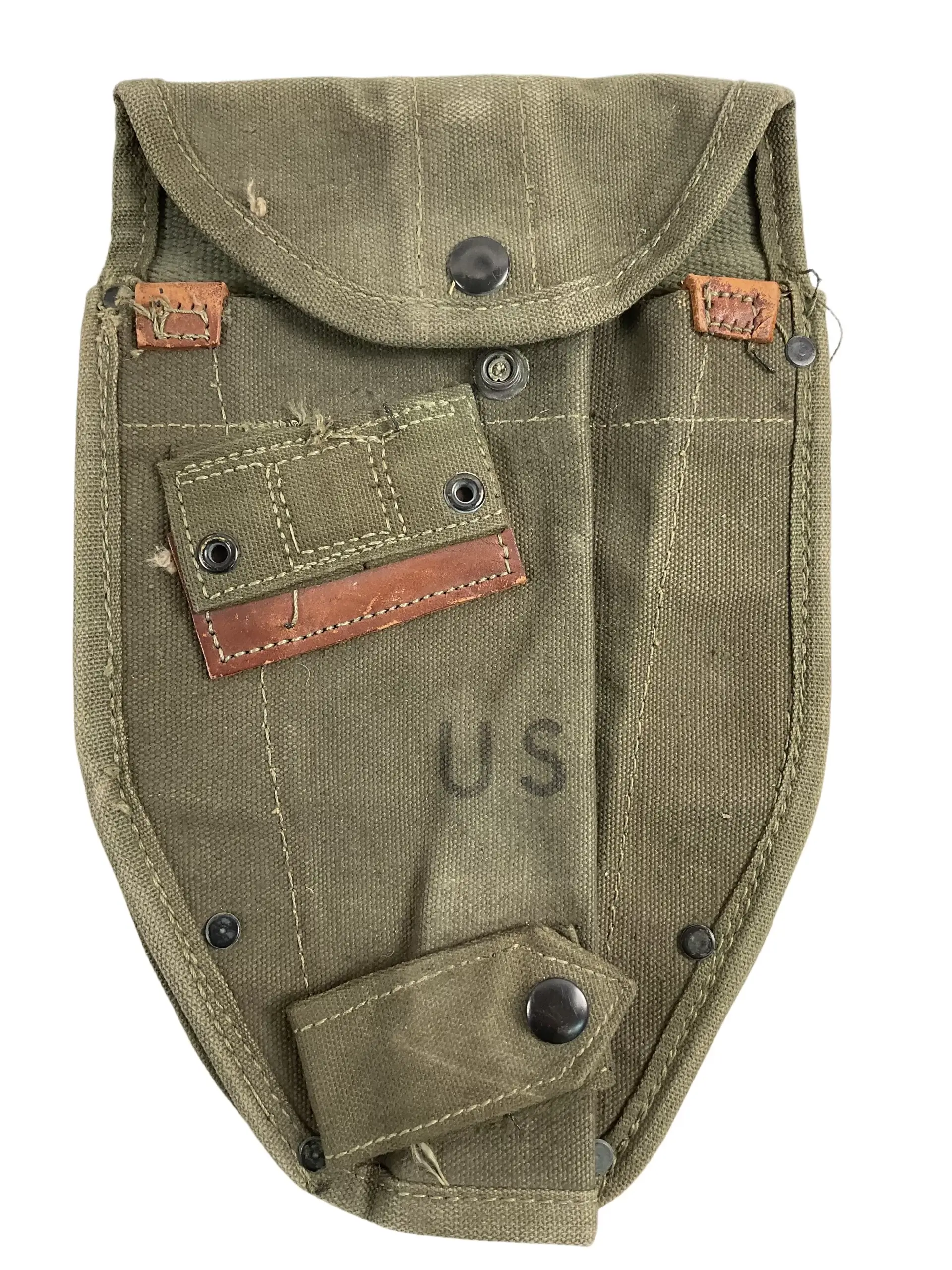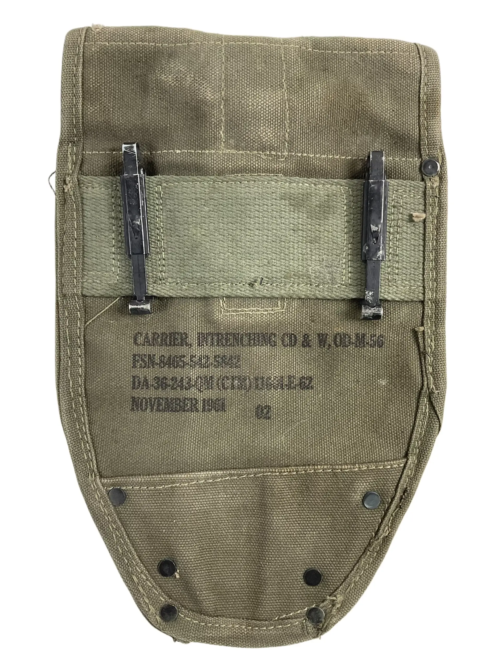 The US Army Entrenching Tool Carrier Model 1956, dated 1961, is an original military-issue case designed to hold the standard folding entrenching tool used by American troops. Manufactured as part of the M1956 Load-Carrying Equipment system, this carrier is constructed from heavy-duty cotton canvas in olive drab coloration. It features reinforced stitching, a snap-flap closure for securing the entrenching tool, and an integrated metal clip on the reverse for attaching to individual equipment belts or field gear. A stamped date of 1961 and specification markings are visible on the flap or inside surface. The Model 1956 carrier reflects the transitional period of U.S. military field equipment in the post-Korean War era, preceding later synthetic-material systems. These carriers were widely used during the early years of the Vietnam War and were designed to accommodate the M1943 entrenching tool, providing durability and ease of access in demanding field conditions.