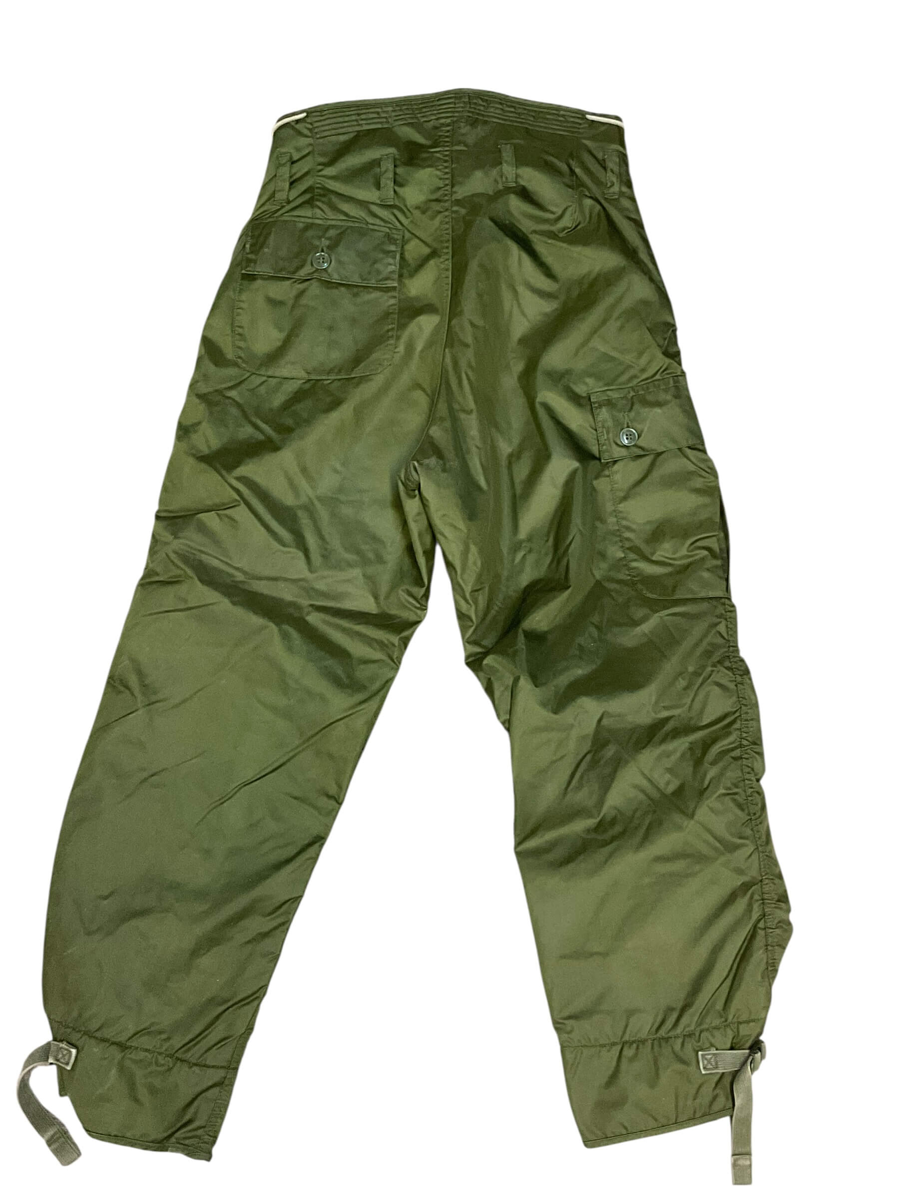 The US Army Extreme Cold Weather Trousers, dated 1965, are a type of military-issue cold weather gear designed for use in harsh winter environments. Manufactured for the U.S. Army, these trousers are labeled as size small and were produced during the Cold War era, a period marked by advancements in military clothing technology. The design features wind-resistant, water-repellent outer fabric, paired with a quilted insulated lining to provide thermal protection in subzero temperatures. Adjustable waistband and suspender buttons facilitate a secure fit over additional layers. Reinforced knees and seat areas enhance durability during field operations. Multiple button-flap pockets offer practical storage for essential items. These trousers formed part of the extended cold weather clothing system, typically worn with a matching parka and compatible with standard-issue boots and liners. The 1965 production date places these trousers within the context of U.S. military activity during the mid-20th century, reflecting both functional design and period-specific materials.