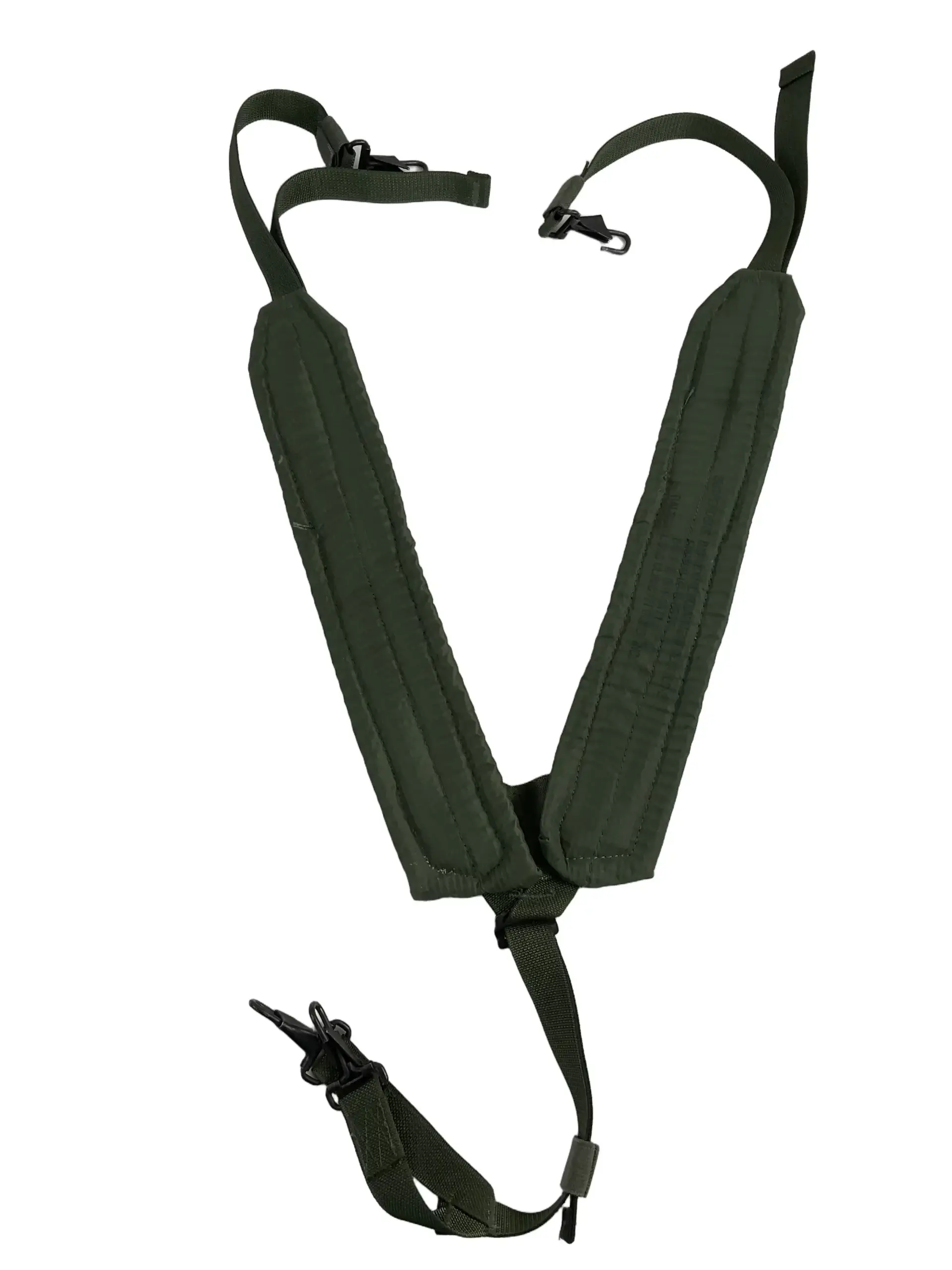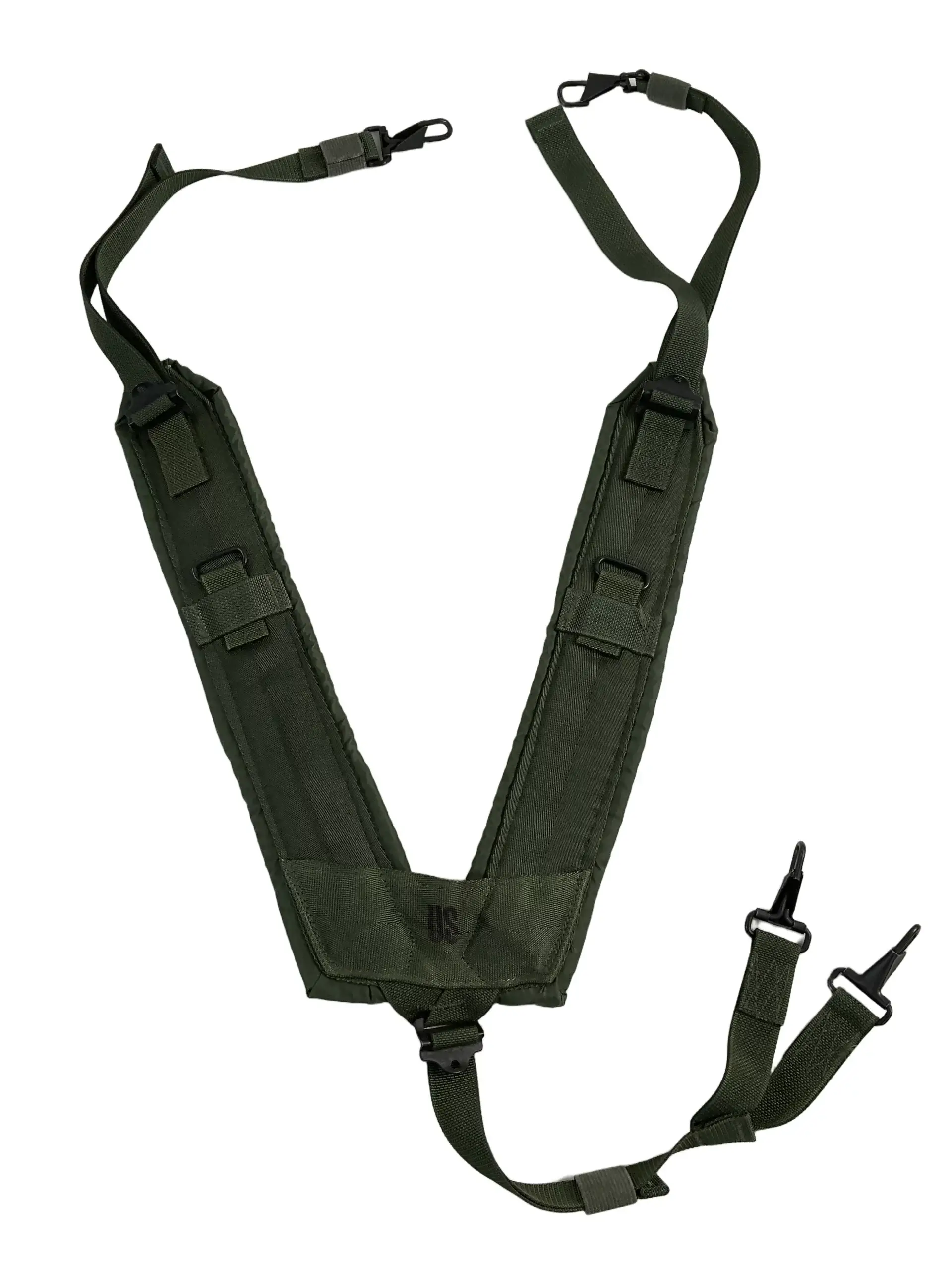 The US Army LC2 Y Strap, dated 2003, is a standard-issue load-bearing accessory used within the ALICE (All-Purpose Lightweight Individual Carrying Equipment) system. Designed to distribute the weight of field gear more comfortably across the shoulders and back, the Y-shaped harness connects to a soldier’s web belt and suspenders. Constructed from durable nylon webbing in olive drab