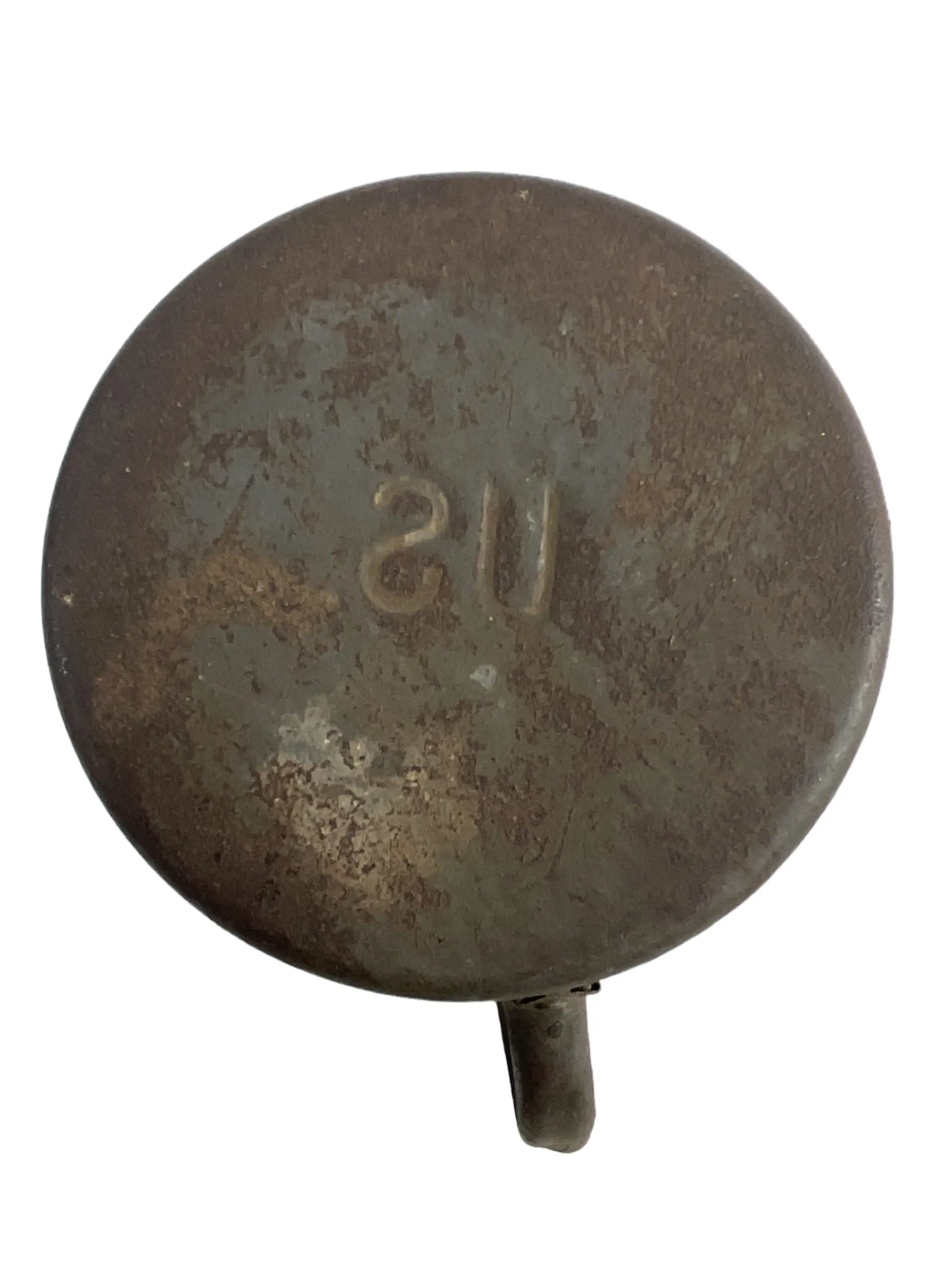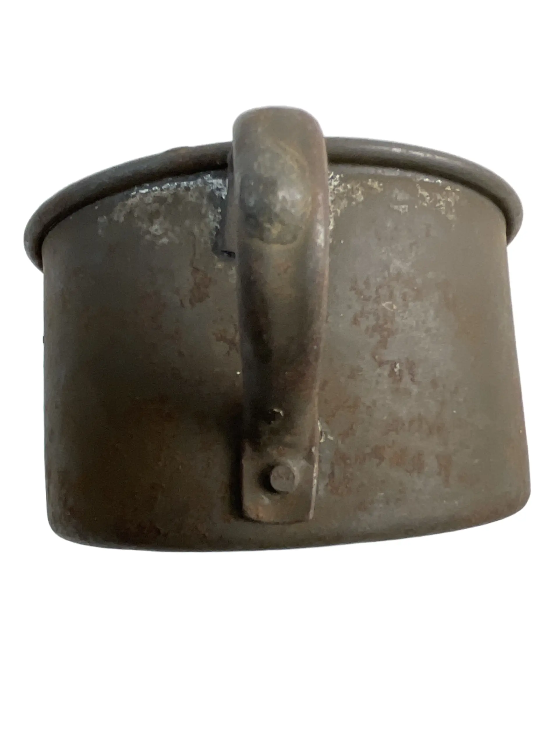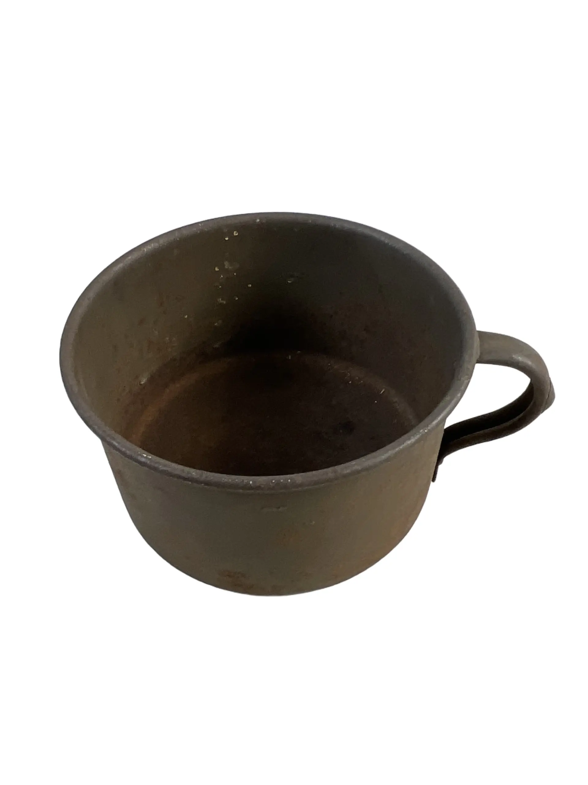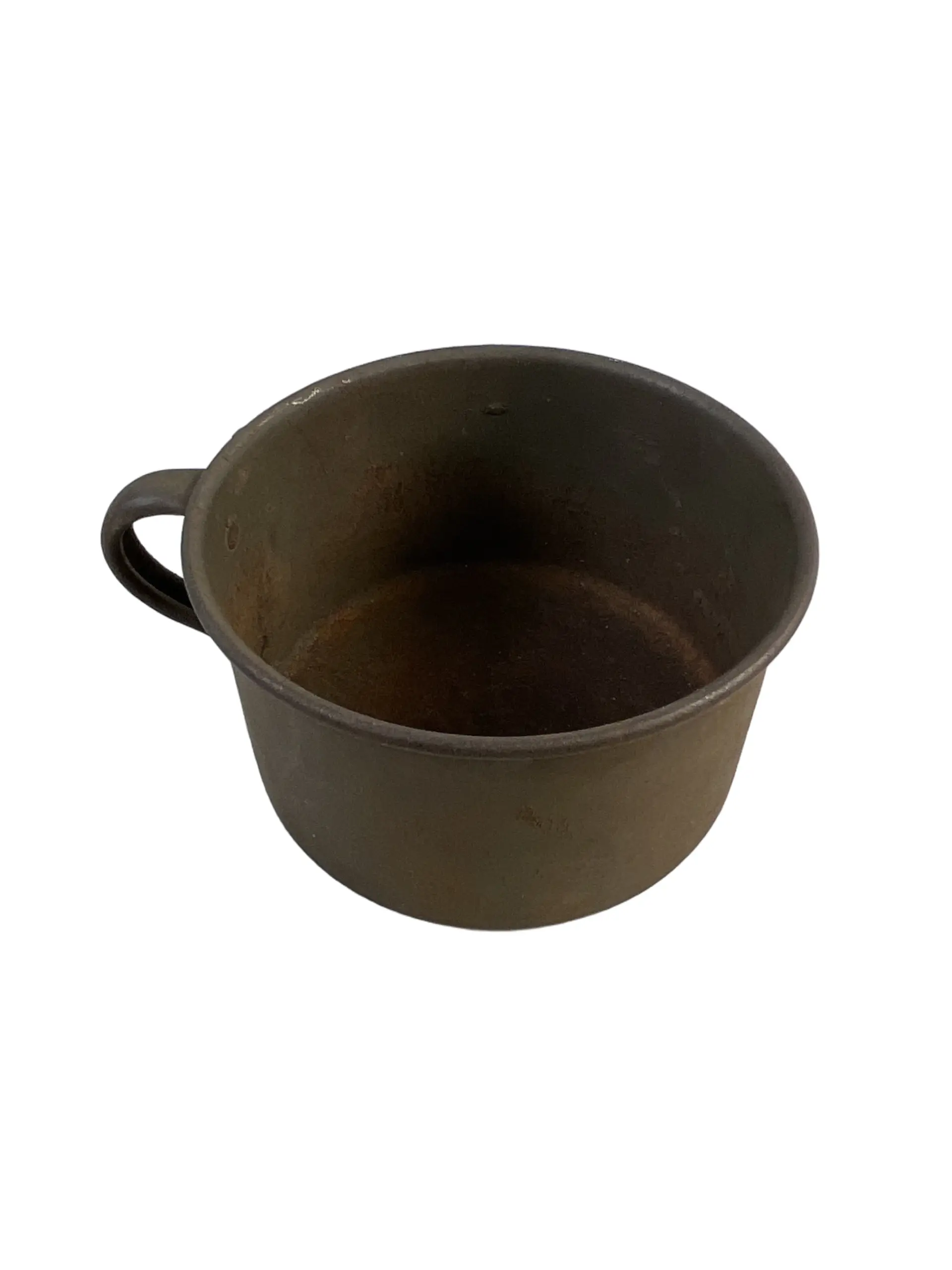 The US Army Spanish American War Cup is an original military issue artifact from the period of the 1898 Spanish-American War. Typically constructed from tinned steel or aluminum, these cups formed part of the standard-issue mess kit used by American soldiers during the conflict. The design features a simple cylindrical body with a flat, folding handle, allowing for ease of packing and use in field conditions. Cups of this type were used for drinking water, coffee, or other liquids while encamped or on campaign. Markings may include U.S. arsenal stamps or inspectors’ marks, though these can vary depending on the manufacturing facility and date of production. Items like this cup offer insight into the daily life and material culture of the US military at the turn of the 20th century. This artifact is of interest to collectors and historians specializing in American military history and late Victorian-era field equipment.