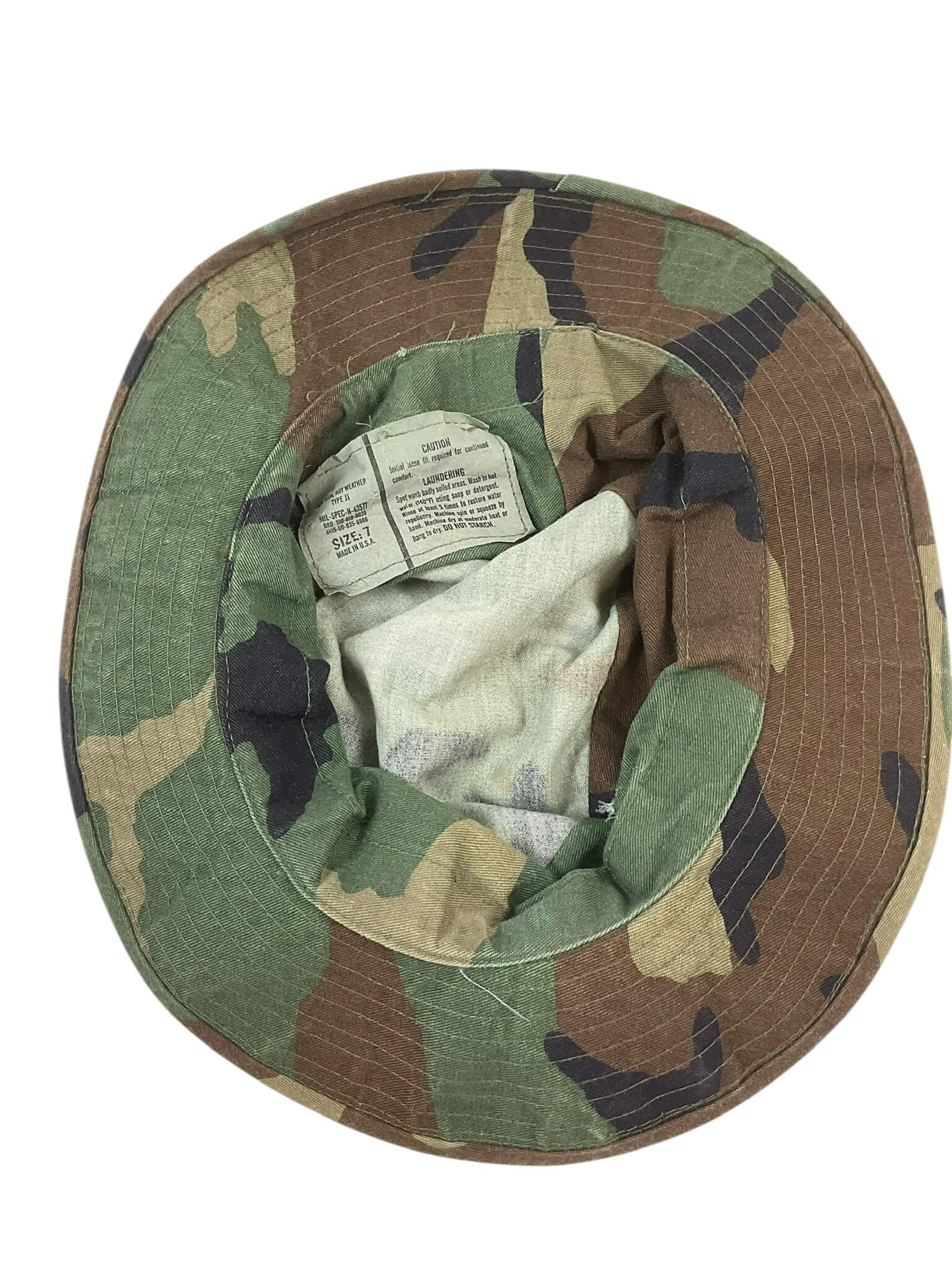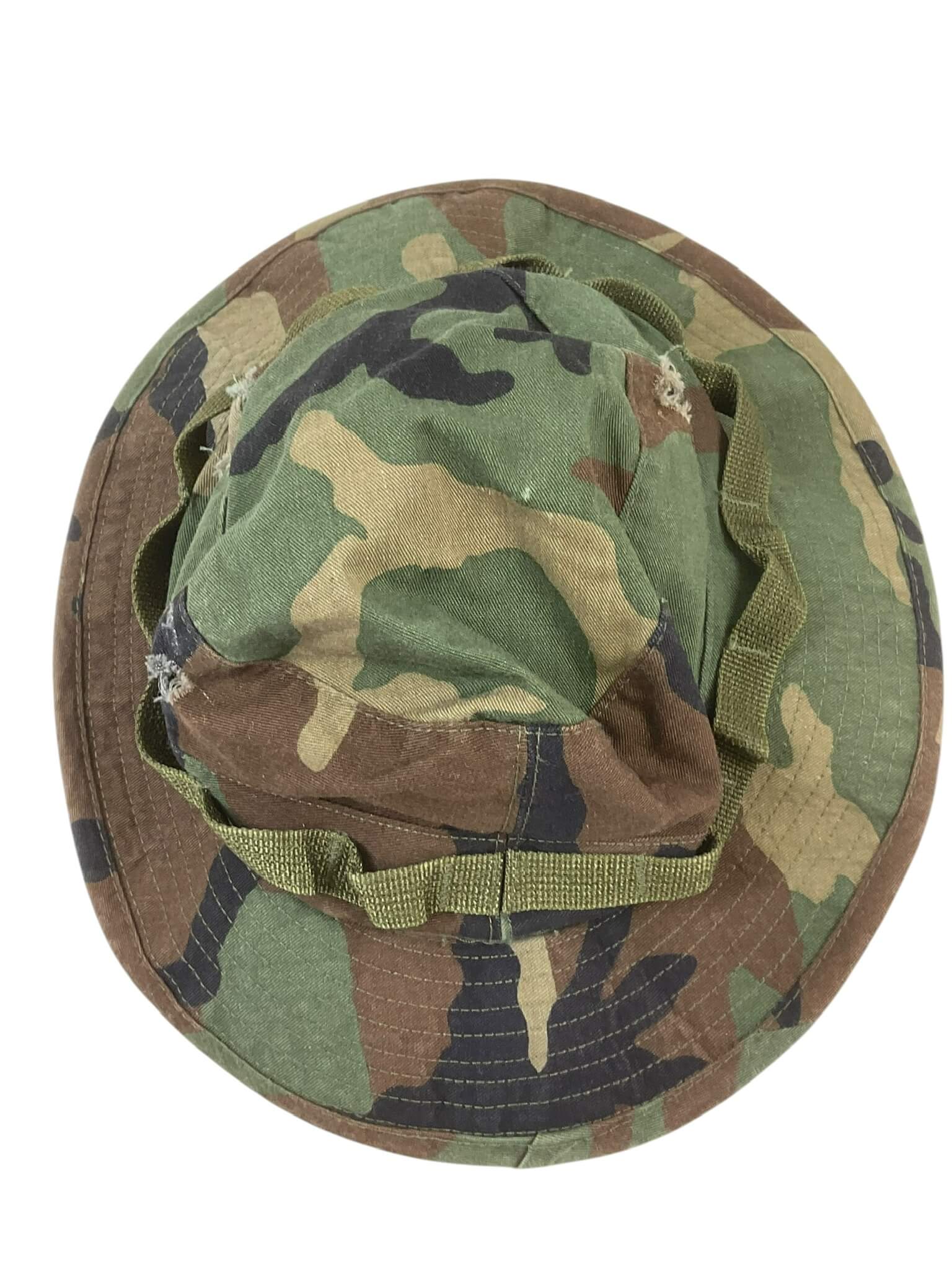 The US Army Woodland BDU Boonie Cap in size 7 is a standard-issue piece of headgear used by United States military personnel. Originally introduced during the Vietnam War and adopted for use through the late 20th century, the Boonie cap provides protection from sun and rain. Made from a durable cotton-nylon ripstop blend, this cap features the four-color woodland camouflage pattern, designed for effective concealment in temperate forest environments. The cap’s construction includes a circular brim for shade, ventilated eyelets on the crown for increased airflow, and an adjustable chin strap for secure fit. Loops around the crown, known as branch loops, allow for the addition of extra foliage or material for further camouflage. The Boonie cap is associated with the Battle Dress Uniform (BDU) system and saw widespread use among infantry, Special Forces, and support troops. Size 7 refers to the US hat sizing standard, corresponding to a head circumference of approximately 22 inches.