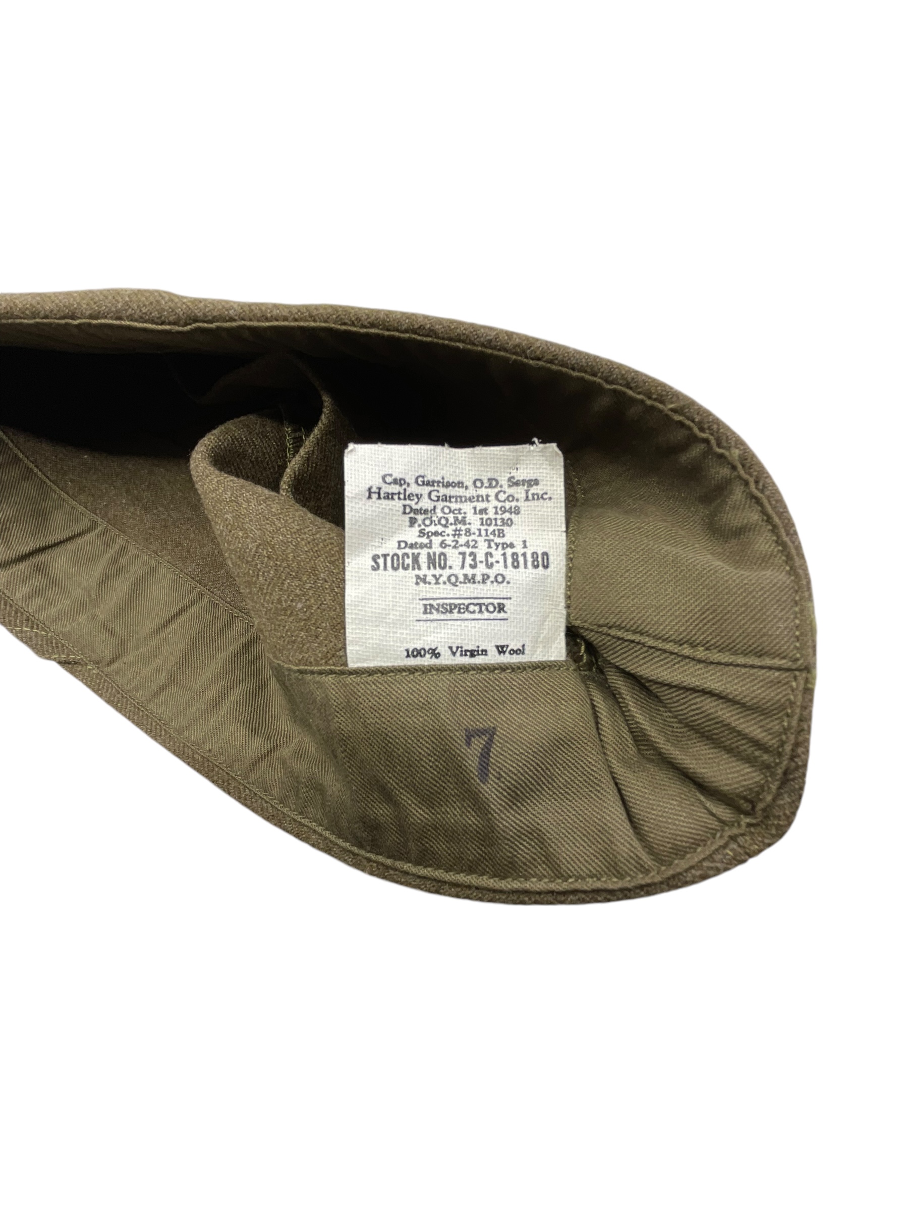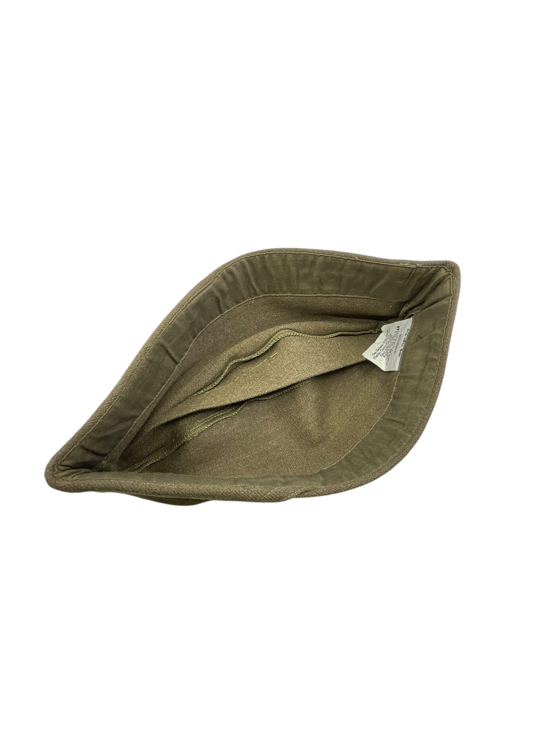 This is an authentic US Army Wool OD Garrison Cap Size 7, dating back to the year 1948. The cap is made from wool in the Olive Drab (OD) colour, which was predominantly used by the US Army during this time period. It is a traditional garrison cap, a foldable military hat that was commonly used by various armed forces during the 20th century. The cap is in size 7. The year of manufacture is 1948, clearly marked on the cap tag.