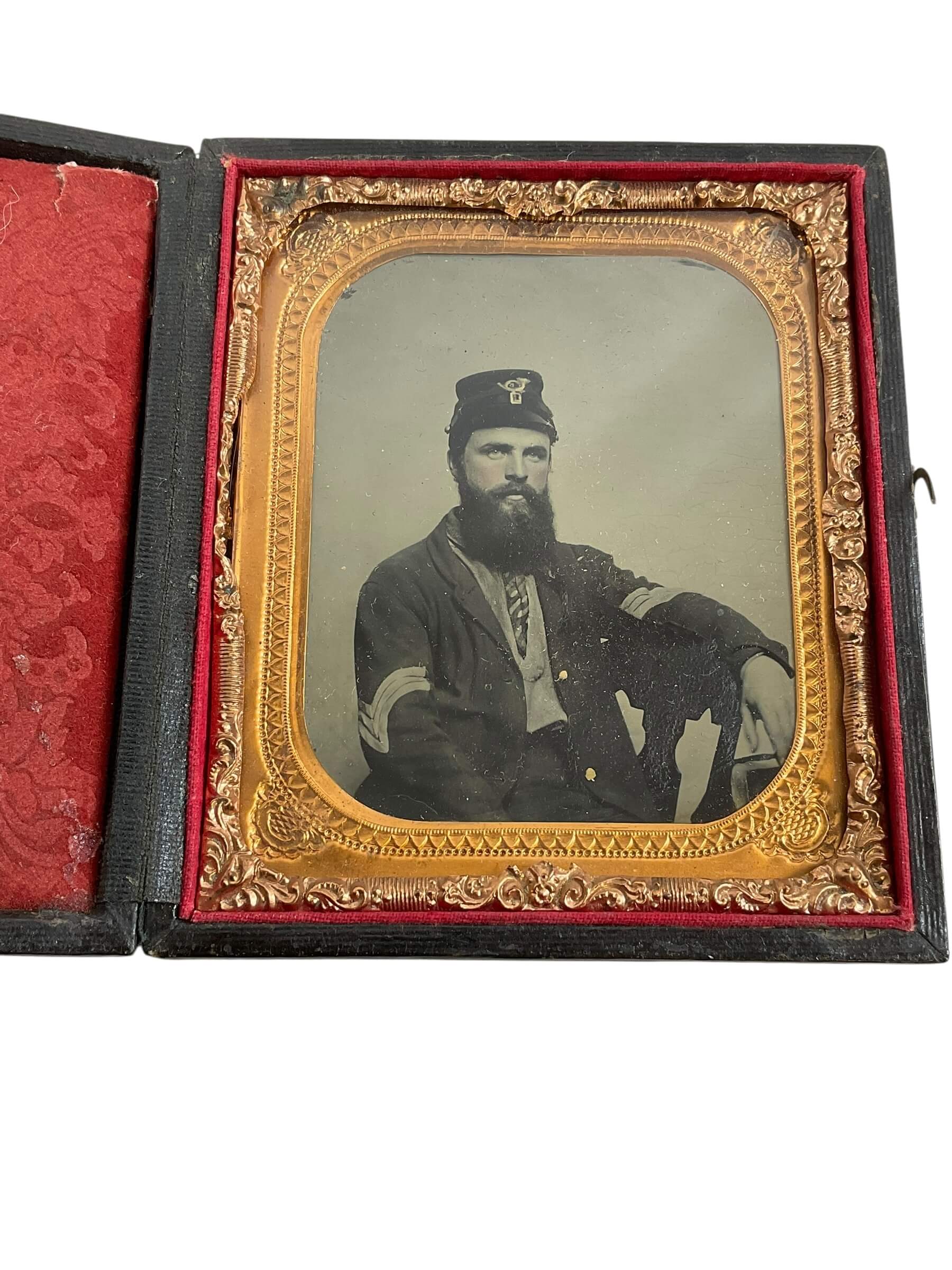 This historical artifact, the ‘US Civil War Union Sgt Tin Type in Frame Picture,’ is a captivating piece of American history. It showcases a black and white portrait of a valiant Union Sergeant from the Civil War era. Encased in an antique frame, the picture is captured using the tin type photographic process, a popular method in the mid-19th century that involved creating images on thin sheets of metal. This process gives the image its unique, vintage appeal. The sergeant’s uniform, demeanor, and the overall composition of the picture provide a vivid window into the past, taking us back to the tumultuous years of the Civil War. It’s a significant memorabilia for history buffs, collectors, or anyone interested in the Civil War era. This artifact is not merely a photograph, but a symbol of the bravery and dedication of those who served in the Union Army during one of the most challenging periods in American history.