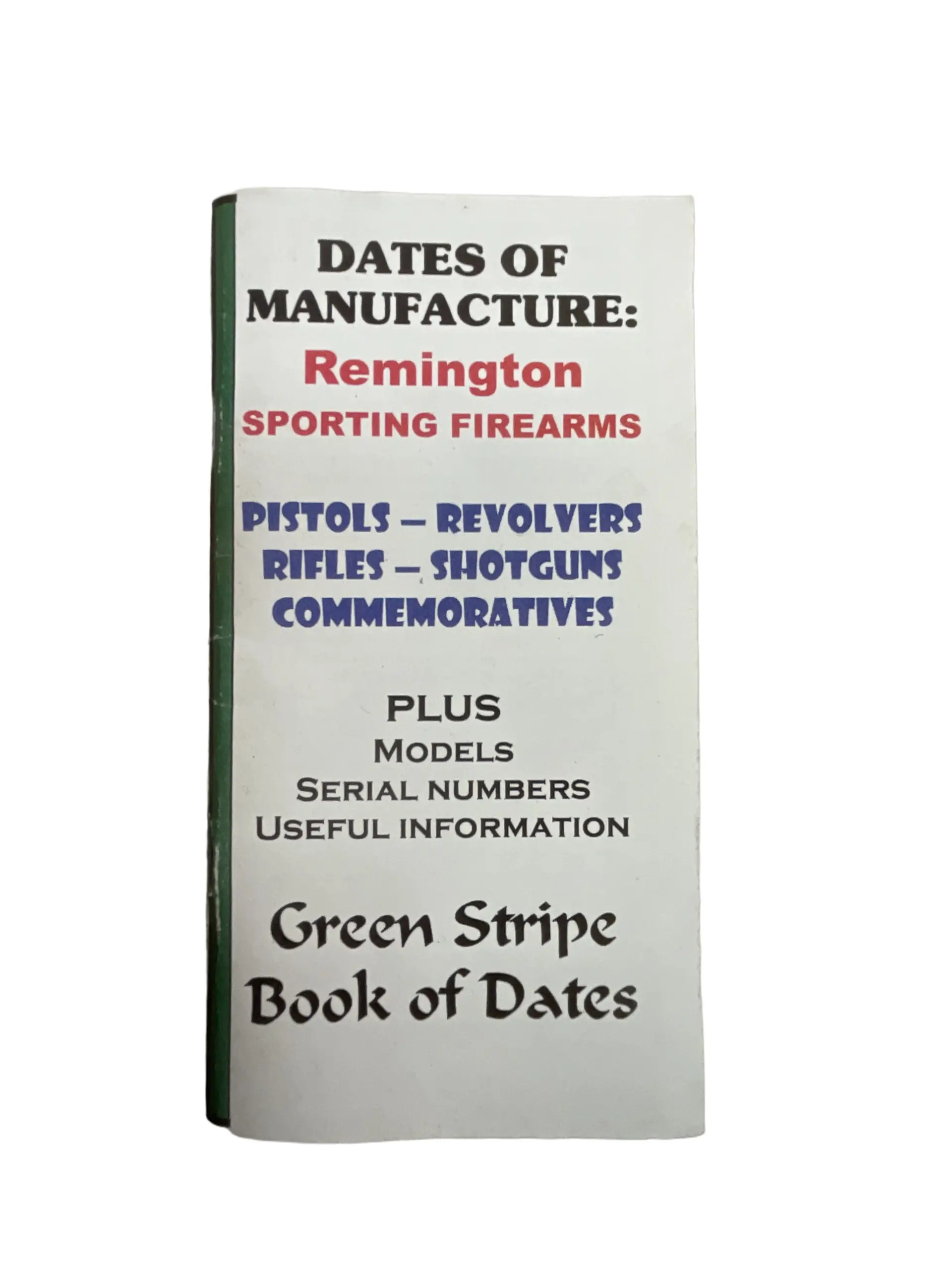 The “US Green Stripe Book of Dates Remington Sporting Firearms Used Softcover Reference Book” is a reference guide focused on the identification and dating of Remington sporting firearms. This softcover volume is part of the Green Stripe series, recognized for its comprehensive tables and data relevant to firearms collectors and researchers. The book compiles serial number ranges, production years, and model information specific to Remington sporting arms, aiding in the verification and documentation of individual pieces. Its used condition indicates previous handling or ownership, with standard wear expected for a reference book of this type. The Green Stripe series is valued for concise, fact-based content, and this edition serves as a practical resource in the field of military antiques as well as civilian sporting firearms. Suitable for those seeking factual data for authentication, appraisal, or historical research, this book supports accurate record-keeping and collections management involving Remington firearms. Total of 43 pages.