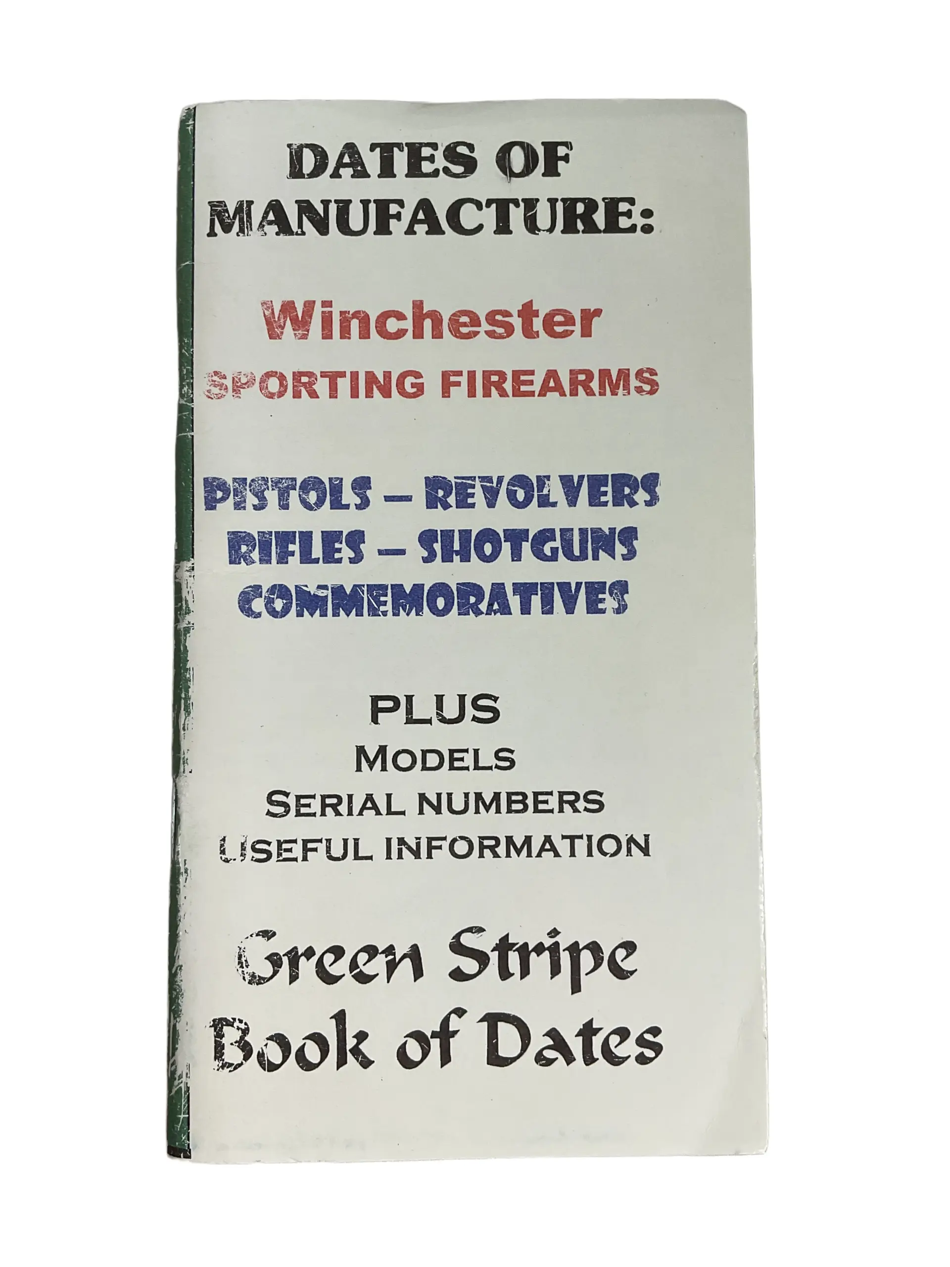 The “US Green Stripe Book of Dates Winchester Sporting Firearms” is a used softcover reference book designed for collectors and historians of military and sporting firearms. This volume provides detailed data on Winchester sporting firearms, focusing on the identification of production years, model variations, and key distinguishing features. The guide uses a “green stripe” classification system to organize information efficiently, offering tables, charts, and serial number lists relevant to Winchester manufacturing history. The book covers a broad range of models and includes essential reference material for verifying authenticity, production date ranges, and original specifications. It is particularly useful for those seeking to authenticate Winchester arms or understand the brand’s historical manufacturing practices. The softcover format offers portability and ease of use in the field or workshop. As a used item, the book may show signs of wear consistent with previous handling, but all reference material remains intact and functional for research and documentation purposes.  Total of 45 pages.