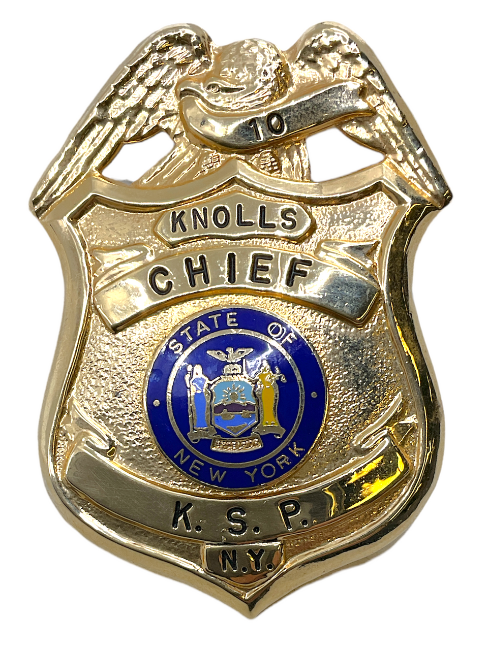 The “US Knolls New York Chief Of Police Pocket Badge” is a prestigious emblem representing law enforcement leadership in the community of Knolls, New York. Crafted with precision and attention to detail, this badge embodies authority, dedication, and service. Featuring the official insignia and title, this pocket badge distinguishes the Chief of Police, symbolizing trust and responsibility among both law enforcement officers and the public they serve. It is typically worn in a breast pocket or clipped onto attire, ensuring immediate recognition. Made from durable, high-quality materials, the badge is designed to withstand the rigors of daily use while maintaining its polished appearance. Ideal for both ceremonial and everyday wear, the US Knolls New York Chief Of Police Pocket Badge is not just a piece of identification, but a symbol of honor and commitment to maintaining peace and justice within the community.