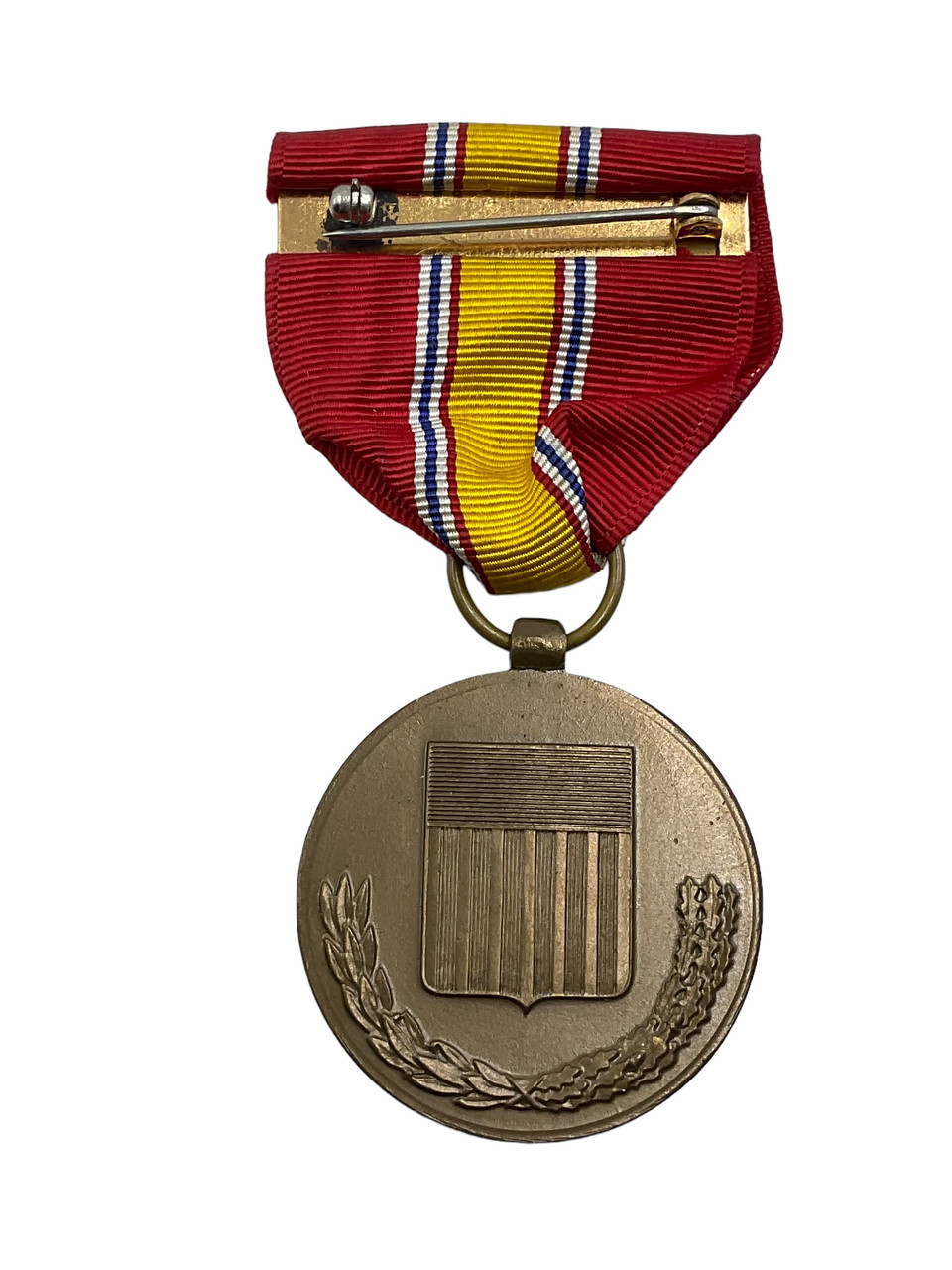 The “US National Defense Medal Full Size” is an esteemed military decoration awarded to service members of the United States Armed Forces. This honor is bestowed upon individuals who have served honorably during designated periods of national emergency or conflict. The medal signifies their dedication, commitment, and readiness to defend and support national security interests. The full-size medal is meticulously crafted, featuring a distinct ribbon with stripes symbolizing the patriotic colors of red, white, and blue. The obverse of the medal typically displays a striking image, which may include the American eagle or other significant national symbols, representing strength, freedom, and patriotism. As a prestigious recognition of service, the National Defense Medal is worn with pride on military uniforms during ceremonial occasions and formal events, standing as a testament to the valor and unwavering duty of the men and women who have served the nation in times of need.
