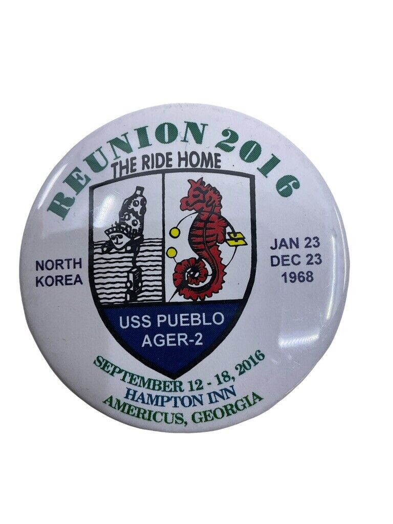 The “US Navy USS Pueblo Reunion Button 2016” is a commemorative button honoring the annual gathering of veterans who served aboard the USS Pueblo. This significant event celebrates the valor and camaraderie of the crew members who endured the ship’s capture in 1968 by North Korean forces during a Cold War intelligence mission. The 2016 reunion button features distinctive Navy imagery, potentially including the ship’s likeness, naval insignia, and the year of the event, symbolizing unity and remembrance. It serves as a poignant memento for attendees, encapsulating shared memories and the resilient spirit of the USS Pueblo’s crew. Whether worn during the reunion ceremonies or kept as a cherished keepsake, this button is a tribute to the enduring legacy and heroism of these brave naval servicemen.
