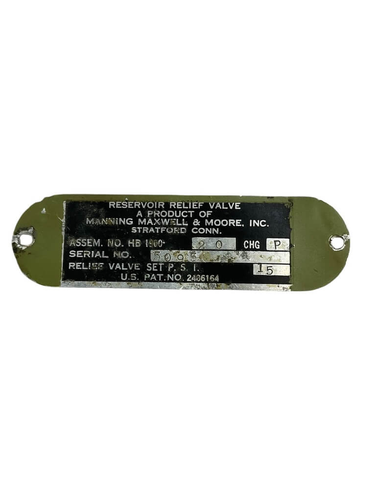 US USAAF Reservoir Relief Valve Aircraft Data Plate