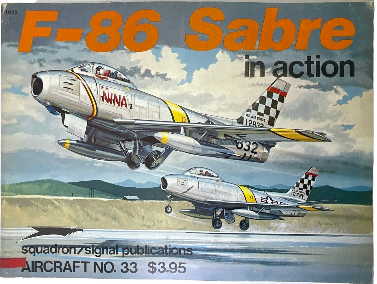 This is a used softcover US USAF F86 Sabre in Action Squadron Signal No 33 Issue 1033 Reference Book .Total of 50 pages with lots of pictures and information.