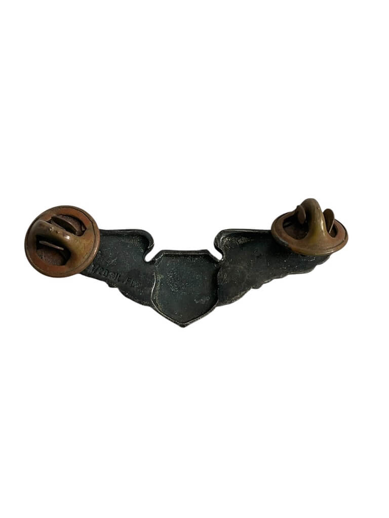 This item is a set of United States Air Force (USAF) Flight Nurse Wings from the Vietnam War era, measuring 2 inches in width. Flight Nurse Wings were awarded to qualified Air Force nurses who completed aeromedical evacuation training and served in support of airborne medical missions. The design features a spread-winged badge with a central caduceus, the traditional symbol of the medical profession, framed by stylized wings. These wings signify the recipient’s role in providing medical care and support to wounded soldiers during flight operations, often under challenging conditions. This insignia was typically worn on the uniform above the left breast pocket, identifying the wearer’s specialized aeromedical status. Authentically sized at 2 inches, this version reflects the standard dimensions used during the Vietnam period. The item represents a key facet of military medical history, associated with the important service provided by flight nurses during armed conflict.