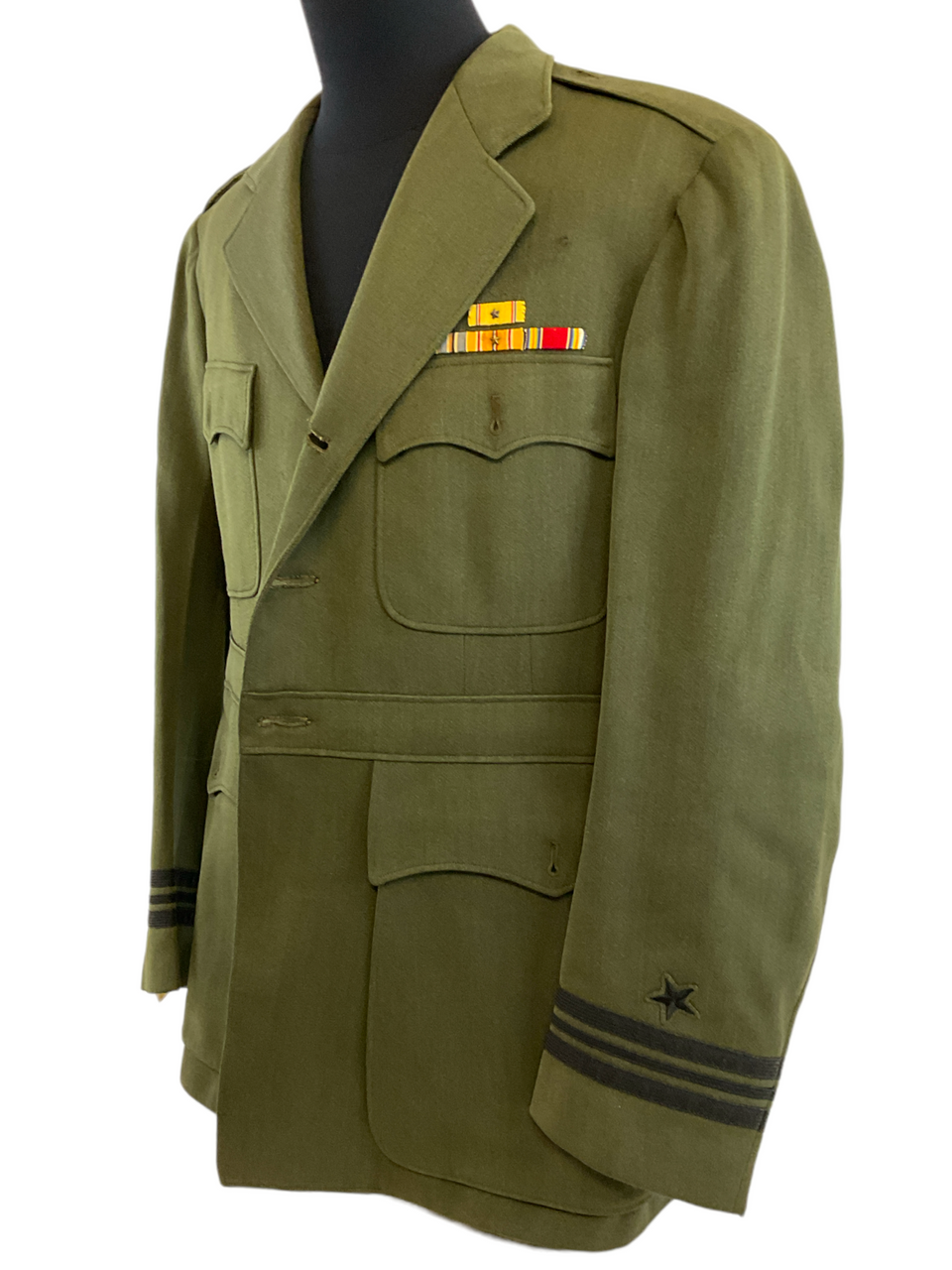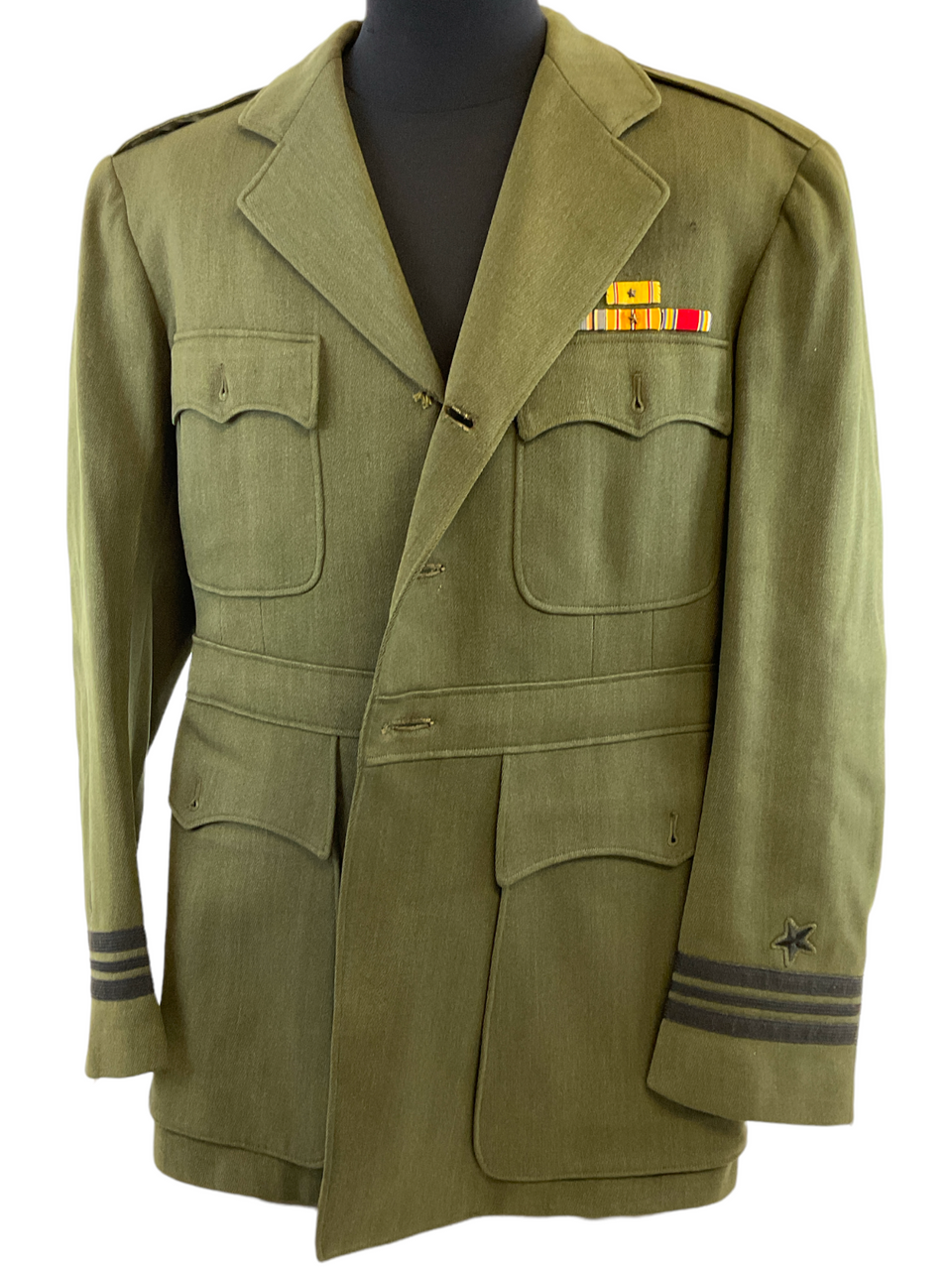 US USN Naval Aviator Four Pocket Service Tunic Green Pilot Combat Ribbons 38, Pilots wing removed by previous owner.