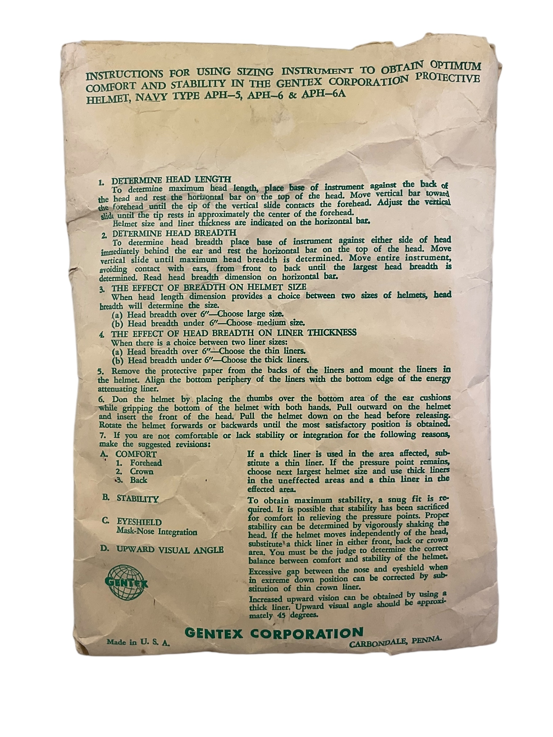 US USN Navy APH-5 APH-6 APH-6A Kit Sizing Instruments Pilots Helmet Bone Dome in Pack of Issue